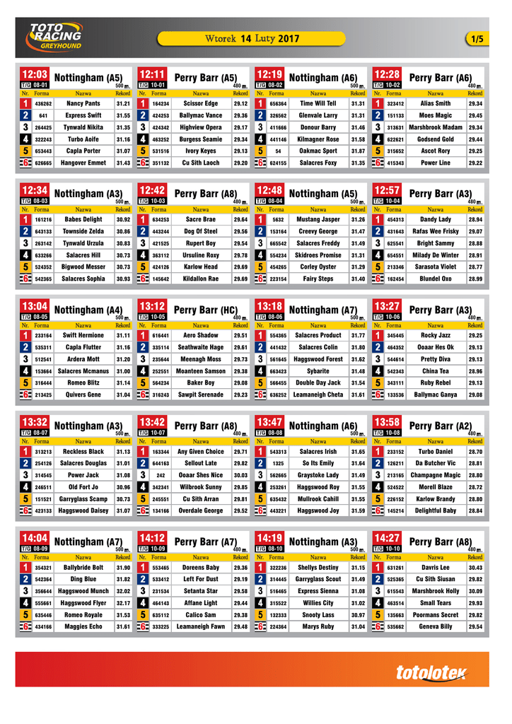 14 12:03 Nottingham (A5) 08-01 500 12:11 Perry Barr (A5) 10-01 480 2017 1/5 12:19 Nottingham (A6) 08-02 500 12:28 Perry Barr (A6) 10-02 480 Nancy Pants 31.21 164234 Scissor Edge 29.12 656364 Time Will Tell 31.31 323412 641 Express Swift 31.55 424253 Ballymac Vance 29.36 326562 Glenvale Larry 31.31 151133 264425 Tynwald Nikita 31.35 424342 Highview Opera 29.17 411666 Donour Barry 31.46 313631 322243 Turbo Aoife 31.16 463252 Burgess Seamie 29.34 441146 Kilmagner Rose 31.58 622621 Godsend Gold 29.44 653443 Capla Porter 31.07 531516 Ivory Keyes 29.13 54 Oakmac Sport 31.87 315652 Ascot Rory 29.25 626665 Hangover Emmet 31.43 351132 Cu Sith Laoch 29.20 624155 Salacres Foxy 31.35 415343 Power Line 29.22 436262 12:34 Nottingham (A3) 08-03 500 161216 Babes Delight 643133 263142 12:42 Perry Barr (A8) 10-03 480 12:48 Nottingham (A5) 08-04 500 30.92 634253 Sacre Brae 29.64 5632 Townside Zelda 30.86 443244 Dog Of Steel 29.56 153164 Tynwald Urzula 30.83 421525 Rupert Boy 29.54 665542 633266 Salacres Hill 30.73 363112 Ursuline Roxy 29.78 554234 Skidroes Promise 524352 Bigwood Messer 30.73 424126 Karlow Head 29.69 454265 542365 Salacres Sophia 30.93 145642 Kildallon Rae 29.69 223154 13:04 Nottingham (A4) 08-05 500 13:12 Perry Barr (HC) 10-05 480 Mustang Jasper Alias Smith 29.34 Moes Magic 29.45 Marshbrook Madam 29.34 12:57 Perry Barr (A3) 10-04 480 31.26 454313 Dandy Lady Creevy George 31.47 431643 Rafas Wee Frisky 29.07 Salacres Freddy 31.49 625541 Bright Sammy 28.88 31.31 654551 Milady De Winter 28.91 Corley Oyster 31.29 213346 Sarasota Violet 28.77 Fairy Steps 31.40 162454 Blundel Oxo 28.99 13:18 Nottingham (A7) 08-06 500 28.94 13:27 Perry Barr (A3) 10-06 480 233164 Swift Hermione 31.11 616441 Aero Shadow 29.51 554365 Salacres Product 31.77 345445 Rocky Jazz 29.25 535311 Capla Flutter 31.16 335114 Seathwaite Hage 29.61 441432 Salacres Colin 31.80 464352 Ooaar Hes Ok 29.13 512541 Ardera Mott 31.20 235644 Meenagh Moss 29.73 561645 Haggswood Forest 31.62 544614 Pretty Diva 29.13 153664 Salacres Mcmanus 31.00 252551 Moanteen Samson 29.38 663423 Sybarite 31.48 542343 China Tea 28.96 316444 Romeo Blitz 31.14 564234 Baker Boy 29.08 566455 Double Day Jack 31.54 343111 Ruby Rebel 29.13 213425 Quivers Gene 31.04 316243 Sawpit Serenade 29.23 636252 Leamaneigh Cheta 31.61 133536 Ballymac Ganya 29.08 13:32 Nottingham (A3) 08-07 500 13:42 Perry Barr (A8) 10-07 480 13:47 Nottingham (A6) 08-08 500 13:58 Perry Barr (A2) 10-08 480 313213 Reckless Black 31.13 163344 Any Given Choice 29.71 543313 Salacres Irish 31.65 233152 Turbo Daniel 254126 Salacres Douglas 31.01 644163 Sellout Late 29.82 1325 So Its Emily 31.64 126211 Da Butcher Vic 28.81 314545 Power Jack 31.08 242 Ooaar Shes Nice 30.03 562665 Graystoke Lady 31.49 213165 Champagne Magic 28.80 246511 Old Fort Jo 30.96 342341 Wilbrook Sunny 29.85 253261 Haggswood Roy 31.55 524522 Morell Blaze 28.72 151521 Garryglass Scamp 30.73 245551 Cu Sith Arran 29.81 635432 Mullrook Cahill 31.55 226152 Karlow Brandy 28.80 423133 Haggswood Daisey 31.07 134166 Overdale George 29.52 443221 Haggswood Joy 31.59 145214 Delightful Baby 28.84 14:04 Nottingham (A7) 08-09 500 14:12 Perry Barr (A7) 10-09 480 14:19 Nottingham (A3) 08-10 500 28.70 14:27 Perry Barr (A8) 10-10 480 Ballybride Bolt 31.90 553465 Doreens Baby 29.36 322236 Shellys Destiny 31.15 631261 542364 Ding Blue 31.82 533412 Left For Dust 29.19 314445 Garryglass Scout 31.49 525365 Cu Sith Siusan 29.82 356644 Haggswood Munch 32.02 231534 Setanta Star 29.58 516465 Express Sienna 31.08 615543 Marshbrook Holly 30.09 555661 Haggswood Flyer 32.17 464143 Affane Light 29.44 315522 Willies City 31.02 463514 Small Tears 29.93 635446 Romeo Royale 31.53 635112 Calico Sam 29.38 132333 Snooty Lass 30.97 135663 Poormans Secret 29.82 434166 Maggies Echo 31.61 333225 Leamaneigh Fawn 29.48 224364 Marys Ruby 31.04 535662 Geneva Billy 29.54 354321 Davris Lee 30.43 14 14:33 Nottingham (A4) 08-11 500 14:44 Perry Barr (A6) 10-11 414145 Salacres Beyonce 31.11 222115 332345 Lagile Blossom 31.20 151656 Sherkin Sky 31.17 556431 Sporting Angel 125431 Capla Azzuri 114662 Salacres Fintan 15:08 02-01 524452 365524 241362 500 324144 Aero Tokarev 29.32 431461 351556 Ferndale Gaga 29.30 332311 31.33 314662 Derryhogan Lamps 29.08 656133 31.01 222421 Violet Dancer 29.40 413363 31.12 134634 Horse It Out 29.38 262451 Haggswoodstripes 15:18 Sunderland (A3) 16-01 450 15:27 02-02 Droopys Fin 30.17 Bonnan Bolt 31.06 644544 Beat Zar Bookies 29.94 Jaxx In Shiraz 31.35 515625 Aero Fresh 30.13 Global Scally 31.02 252254 Venango 30.17 Salacres Kearni 31.29 143434 Albans Flash 29.95 30.86 223334 Home Rory 29.98 Crayford (A7) 380 Knockard Prince 555332 Cloncunny Hi 27.90 645321 244534 Reagrove Marj 27.74 631352 24.02 433321 Allowdale Eimear 27.97 642421 Liberty Queen 24.07 413315 Ascot Ali 27.86 Droopys Rafaella 23.88 541432 Salmegirl 28.04 23.89 23.92 Darcys Boy 323114 5 Crayford (A8) 380 15:57 Sunderland (A5) 16-03 450 480 Colmyard Kitty 332564 Snowdon Doll 10-12 441466 27.83 Ladbrokes Kid 14:58 Perry Barr (A9) 31.08 Abu 652613 02-03 08-12 154553 24.08 15:47 14:51 Nottingham (A4) 29.34 380 Wagga Silver 2/5 Rinbane Mae Crayford (A5) 345151 480 2017 15:37 Sunderland (A2) 16-02 450 24.20 412246 Darlo Dawsy Beckys Briony 24.12 316145 Dance Dolly 27.70 Glen Palace 24.13 213125 Fast Blond 27.69 Funny Pleasure 24.06 254115 Cairns Lulu 27.70 544662 Have Anice Day 24.29 512441 Tyrian Jazz 27.76 666552 Glenbeech Raven 24.16 326132 Roisins Star 27.68 16:07 02-04 Crayford (A7) 380 27.56 16:17 Sunderland (HC) 16-04 261 351546 Kelva Keane 24.47 666221 Lady Midas 28.24 1242 Reaveys Raider 23.92 313642 Derryhogan Kia 16.73 442465 Vinnythestriker 24.17 563462 Grace And Beauty 27.90 532441 Razmataz Dazl 23.93 133634 Lord Lieutenant 16.50 43664 Darkcat Titanium 24.29 141322 Chopchop Diva 28.37 521 Fastfawn 23.85 521266 Glenburn Angel 16.51 244 Deecees Lion 24.49 145136 Rathcoole Blue 28.25 616162 Black Selection 23.97 551166 Allowdale Mary 16.34 325513 Seven Kingdoms 24.26 545332 Darlo Gill 2