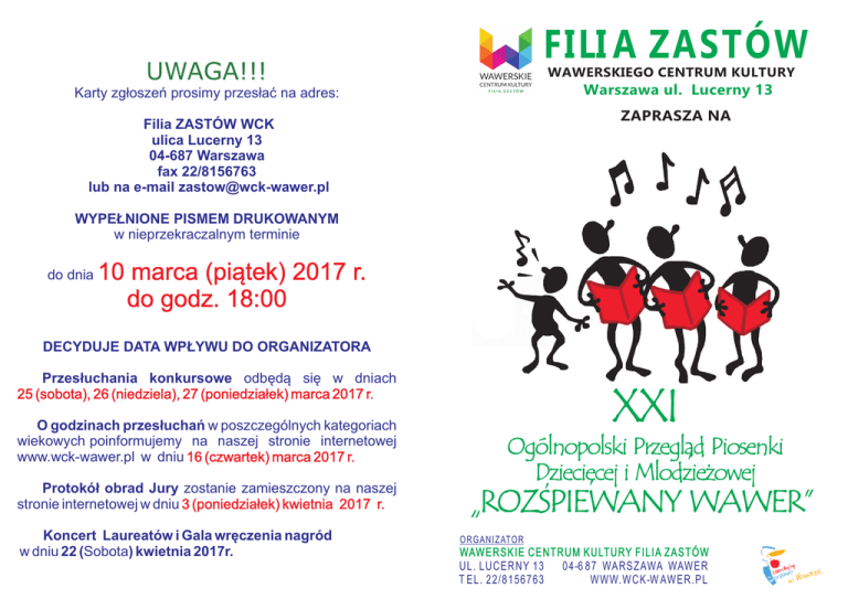 FILI A ZASTÓW UWAGA!!! WAWERSKIEGO CENTRUM KULTURY Warszawa ul. Lucerny 13 Karty zg³oszeñ prosimy przes³aæ na adres: ZAPRASZA NA Filia ZASTÓW WCK ulica Lucerny 13 04-687 Warszawa fax 22/8156763 lub na e-mail [email protected] WYPE£NIONE PISMEM DRUKOWANYM w nieprzekraczalnym terminie do dnia 10 marca (pi¹tek) 2017 r. do godz. 18:00 DECYDUJE DATA WP£YWU DO ORGANIZATORA Przes³uchania konkursowe odbêd¹ siê w dniach 25 (sobota), 26 (niedziela), 27 (poniedzia³ek) marca 2017 r. O godzinach przes³uchañ w poszczególnych kategoriach wiekowych poinformujemy na naszej stronie internetowej www.wck-wawer.pl w dniu 16 (czwartek) marca 2017 r. Protokó³ obrad Jury zostanie zamieszczony na naszej stronie internetowej w dniu 3 (poniedzia³ek) kwietnia 2017 r. Koncert Laureatów i Gala wrêczenia nagród w dniu 22 (Sobota) kwietnia 2017r. XXI Ogólnopolski Przeglad , .Piosenki Dzieciecej , i Mlodziezowej , ROZSPIEWANY WAWER” “ ORGANIZATOR WAWERSKIE CENTRUM KULTURY FILIA ZASTÓW UL. LUCERNY 13 04-6 87 WARSZAWA WAWER T EL. 22/8156763 WWW.WCK-W AWER.PL Cel przegl¹du: - poszukiwanie talentów, umo¿liwienie prezentacji i dalszego rozwoju, - zaprezentowanie dorobku dzieciêcych i m³odzie¿owych zespo³ów wokalnych, które dzia³aj¹ w placówkach kultury, szko³ach, placówkach oœwiatowo-kulturalnych i innych. Uczestnicy przegl¹du: - indywidualni, - zespo³y wokalne dzia³aj¹ce w przedszkolach, szko³ach, œwietlicach, klubach, placówkach kultury, placówkach wychowawczych i innych (zespó³ mo¿e siê sk³adaæ z minimum 3 a maximum 10 osób). PRZEGL¥D NIE DOTYCZY DUETÓW I CHÓRÓW! Kategorie wiekowe uczestników: - od 4 lat do 5 lat, - od 6 lat do 7 lat, - od 8 lat do 10 lat, - od 11 lat do 13 lat, - od 14 lat do 16 lat, - od 17 lat do 20 lat, - od 21 lat i powy¿ej. O przynale¿noœci do kategorii wiekowej decyduje data urodzenia. Kryteria oceny: - dobór repertuaru, - indywidualne podejœcie do interpretacji utworu, - muzykalnoœæ, - wyczucie rytmu, - dykcja, - ogólny wyraz artystyczny. Przepisy ogólne: - przegl¹d ma charakter konkursowy, - Laureaci i wyró¿nieni w poszczególnych kategoriach otrzymuj¹ nagrody, - uczestnicy wykonuj¹ tylko jeden utwór,w jêzyku polskim, - wykonawca uczestnicz¹cy po raz kolejny w konkursie nie mo¿e œpiewaæ tej samej piosenki ponownie, - maksymalna d³ugoœæ utworu do 4 minut, - ka¿dy uczestnik przegl¹du mo¿e byæ cz³onkiem tylko jednego zespo³u, - o przynale¿noœci zespo³u do kategorii wiekowej decyduje wiek najstarszego cz³onka zespo³u, - dopuszcza siê tylko œcie¿ki dŸwiêkowe bez nagranego wokalu i chórków (tylko playback instrumentalny). Niedope³nienie powy¿szego wymogu upowa¿nia Jury do przerwania wykonywania utworu!!! - Jury po ocenie wystêpu ma prawo przerwaæ dalsze wykonywanie utworu, - sk³ad Jury mo¿e ulec zmianie, co nie ma wp³ywu na ocenê wystêpu - karta zg³oszenia wg wzoru, - karty wype³nione nieczytelnie i nie zawieraj¹ce wszystkich danych nie bêd¹ brane pod uwagê!!! - ostateczny termin na dokonanie zmian w zg³oszeniach to: 22 marca (œroda) 2017 r., -wszystkie zmiany bezwarunkowo prosimy sk³adaæ pisemnie, -rezygnacja z udzia³u w Przegl¹dzie tylko w formie pisemnej, - przes³anie karty zg³oszenia jest równoznaczne z akceptacj¹ warunków regulaminu i równoczesn¹ zgod¹ na nagrywanie, filmowanie i fotografowanie podczas przegl¹du, a powsta³y materia³ bêdzie w³asnoœci¹ organizatora. Powsta³y materia³ mo¿e byæ zamieszczony na stronach internetowych WCK filia Zastów, prasie i innych mediach niezale¿nych od miejsca, w których odbywaj¹ siê przes³uchania, koncert, - kolejnoœæ wystêpów podczas przes³uchañ ustala organizator i nie podlega ona zmianie, - spóŸnieni uczestnicy z Warszawy w drodze wyj¹tku œpiewaj¹ jako ostatni w swojej kategorii wiekowej, - ka¿dy uczestnik w wieku szkolnym zobowi¹zany jest posiadaæ aktualn¹ legitymacjê szkoln¹, - decyzje Jury s¹ ostateczne, - organizator nie zwraca kosztów przejazdu, - organizator zastrzega sobie mo¿liwoœæ zmiany dnia przes³uchañ, terminu opublikowania protoko³u jury na stronie internetowej oraz terminu koncertu Laureatów.