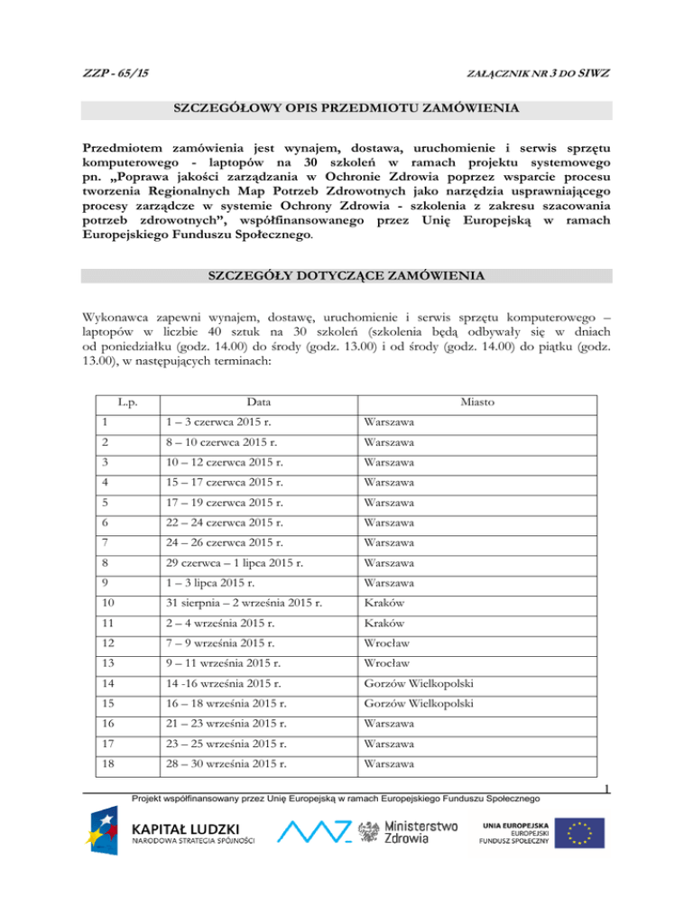 ZZP - 65/15 ZAŁĄCZNIK NR 3 DO SIWZ SZCZEGÓŁOWY OPIS PRZEDMIOTU ZAMÓWIENIA Przedmiotem zamówienia jest wynajem, dostawa, uruchomienie i serwis sprzętu komputerowego - laptopów na 30 szkoleń w ramach projektu systemowego pn. „Poprawa jakości zarządzania w Ochronie Zdrowia poprzez wsparcie procesu tworzenia Regionalnych Map Potrzeb Zdrowotnych jako narzędzia usprawniającego procesy zarządcze w systemie Ochrony Zdrowia - szkolenia z zakresu szacowania potrzeb zdrowotnych”, współfinansowanego przez Unię Europejską w ramach Europejskiego Funduszu Społecznego. SZCZEGÓŁY DOTYCZĄCE ZAMÓWIENIA Wykonawca zapewni wynajem, dostawę, uruchomienie i serwis sprzętu komputerowego – laptopów w liczbie 40 sztuk na 30 szkoleń (szkolenia będą odbywały się w dniach od poniedziałku (godz. 14.00) do środy (godz. 13.00) i od środy (godz. 14.00) do piątku (godz. 13.00), w następujących terminach: L.p. Data Miasto 1 1 – 3 czerwca 2015 r. Warszawa 2 8 – 10 czerwca 2015 r. Warszawa 3 10 – 12 czerwca 2015 r. Warszawa 4 15 – 17 czerwca 2015 r. Warszawa 5 17 – 19 czerwca 2015 r. Warszawa 6 22 – 24 czerwca 2015 r. Warszawa 7 24 – 26 czerwca 2015 r. Warszawa 8 29 czerwca – 1 lipca 2015 r. Warszawa 9 1 – 3 lipca 2015 r. Warszawa 10 31 sierpnia – 2 września 2015 r. Kraków 11 2 – 4 września 2015 r. Kraków 12 7 – 9 września 2015 r. Wrocław 13 9 – 11 września 2015 r. Wrocław 14 14 -16 września 2015 r. Gorzów Wielkopolski 15 16 – 18 września 2015 r. Gorzów Wielkopolski 16 21 – 23 września 2015 r. Warszawa 17 23 – 25 września 2015 r. Warszawa 18 28 – 30 września 2015 r. Warszawa Projekt współfinansowany przez Unię Europejską w ramach Europejskiego Funduszu Społecznego 1 19 30 września – 2 października 2015 r. Warszawa 20 5 – 7 października 2015 r. Warszawa 21 7 – 9 października 2015 r. Warszawa 22 12 – 14 października 2015 r. Warszawa 23 14 – 16 października 2015 r. Warszawa 24 19 – 21 października 2015 r. Kraków 25 21 – 23 października 2015 r. Kraków 26 26 – 28 października 2015 r. Wrocław 27 28 – 30 października 2015 r. Wrocław 28 2 – 4 listopada 2015 r. Gorzów Wielkopolski 29 4 – 6 listopada 2015 r. Gorzów Wielkopolski 30 16 – 18 listopada 2015 r. Warszawa Zamawiający zastrzega możliwość zmiany ww. terminów i godzin rozpoczęcia oraz zakończenia zajęć. W przypadku zmiany terminów zamawiający każdorazowo poinformuje o tym Wykonawcę na 3 dni przed terminem szkolenia. Każdy, dostarczony sprzęt będzie spełniał następujące minimalne standardy: • Oprogramowanie Microsoft: Windows 7 x32 • Przeglądarka Internetowa • Office viewer • Przeglądarka dokumentów pdf • Karta Wifi • Mysz • Zasilacz. W ramach realizacji zamówienia Wykonawca: 1. Dostarczy sprawnie działający sprzęt w liczbie 40 sztuk na każde szkolenie (do sali szkoleniowej/ sal szkoleniowych wraz z niezbędnym, legalnym oprogramowaniem, osprzętem i akcesoriami. Zamawiający zakłada, że sale szkoleniowe udostępnione zostaną w układzie szkolnym lub w podkowę, zatem Wykonawca musi zadbać o odpowiednią liczbę przedłużaczy. 2. Dostarczy wystarczającą liczbę przedłużaczy, oraz wszelkie inne akcesoria oraz oprogramowania umożliwiające podłączenie laptopów do sieci elektrycznej i internetowej (bezprzewodowej). 3. Zapewni montaż stanowisk komputerowych i infrastruktury elektrycznej w sali/salach wskazanych przez Zamawiającego, z zachowaniem zasad BHP. Projekt współfinansowany przez Unię Europejską w ramach Europejskiego Funduszu Społecznego 2 4. Uruchomi dostarczony sprzęt na miejscu szkolenia i dokona konfiguracji podłączenia internetowej sieci bezprzewodowej na minimum 1 godzinę przed jego rozpoczęciem. O miejscu i godzinie rozpoczęcia szkolenia Zamawiający poinformuje Wykonawcę na 7 dni przed datą szkolenia. 5. Dostarczy zapasowy sprzęt w liczbie minimum 4 sztuk laptopów, na wypadek awarii sprzętu na szkoleniu. 6. Dokona wymiany sprzętu w przypadku jego awarii w ciągu 48 h od momentu zgłoszenia. 7. Ubezpieczy sprzęt co najmniej na wypadek jego kradzieży i uszkodzenia. 8. Zdemontuje i odbierze sprzęt po szkoleniu. Projekt współfinansowany przez Unię Europejską w ramach Europejskiego Funduszu Społecznego 3