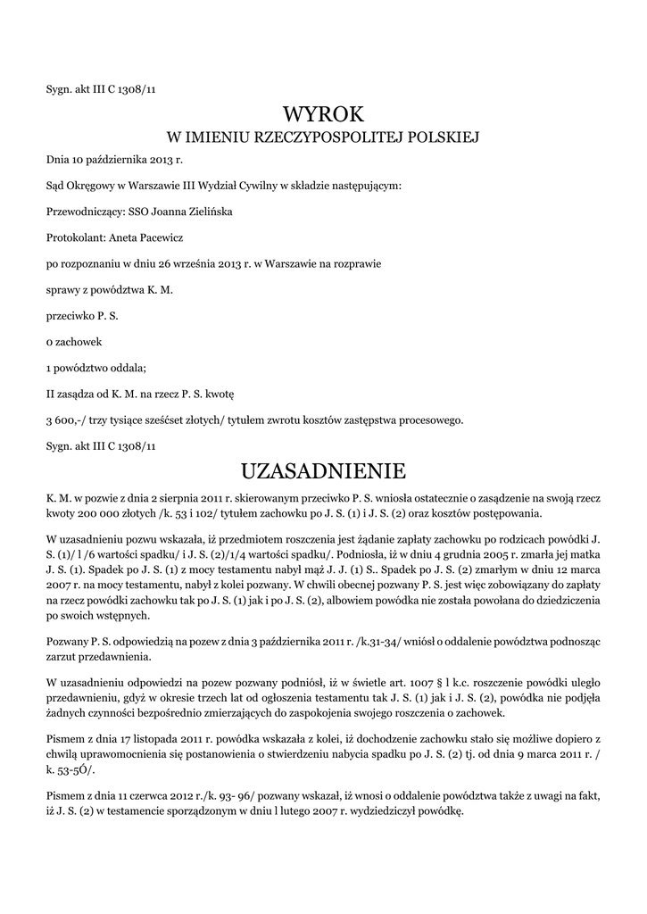 Sygn. akt III C 1308/11 WYROK W IMIENIU RZECZYPOSPOLITEJ POLSKIEJ Dnia 10 października 2013 r. Sąd Okręgowy w Warszawie III Wydział Cywilny w składzie następującym: Przewodniczący: SSO Joanna Zielińska Protokolant: Aneta Pacewicz po rozpoznaniu w dniu 26 września 2013 r. w Warszawie na rozprawie sprawy z powództwa K. M. przeciwko P. S. 0 zachowek 1 powództwo oddala; II zasądza od K. M. na rzecz P. S. kwotę 3 600,-/ trzy tysiące sześćset złotych/ tytułem zwrotu kosztów zastępstwa procesowego. Sygn. akt III C 1308/11 UZASADNIENIE K. M. w pozwie z dnia 2 sierpnia 2011 r. skierowanym przeciwko P. S. wniosła ostatecznie o zasądzenie na swoją rzecz kwoty 200 000 złotych /k. 53 i 102/ tytułem zachowku po J. S. (1) i J. S. (2) oraz kosztów postępowania. W uzasadnieniu pozwu wskazała, iż przedmiotem roszczenia jest żądanie zapłaty zachowku po rodzicach powódki J. S. (1)/ l /6 wartości spadku/ i J. S. (2)/1/4 wartości spadku/. Podniosła, iż w dniu 4 grudnia 2005 r. zmarła jej matka J. S. (1). Spadek po J. S. (1) z mocy testamentu nabył mąż J. J. (1) S.. Spadek po J. S. (2) zmarłym w dniu 12 marca 2007 r. na mocy testamentu, nabył z kolei pozwany. W chwili obecnej pozwany P. S. jest więc zobowiązany do zapłaty na rzecz powódki zachowku tak po J. S. (1) jak i po J. S. (2), albowiem powódka nie została powołana do dziedziczenia po swoich wstępnych. Pozwany P. S. odpowiedzią na pozew z dnia 3 października 2011 r. /k.31-34/ wniósł o oddalenie powództwa podnosząc zarzut przedawnienia. W uzasadnieniu odpowiedzi na pozew pozwany podniósł, iż w świetle art. 1007 § l k.c. roszczenie powódki uległo przedawnieniu, gdyż w okresie trzech lat od ogłoszenia testamentu tak J. S. (1) jak i J. S. (2), powódka nie podjęła żadnych czynności bezpośrednio zmierzających do zaspokojenia swojego roszczenia o zachowek. Pismem z dnia 17 listopada 2011 r. powódka wskazała z kolei, iż dochodzenie zachowku stało się możliwe dopiero z chwilą uprawomocnienia się postanowienia o stwierdzeniu nabycia spadku po J. S. (2) tj. od dnia 9 marca 2011 r. / k. 53-5Ó/. Pismem z dnia 11 czerwca 2012 r./k. 93- 96/ pozwany wskazał, iż wnosi o oddalenie powództwa także z uwagi na fakt, iż J. S. (2) w testamencie sporządzonym w dniu l lutego 2007 r. wydziedziczył powódkę. Sąd ustalił następujący stan faktyczny: Powódka jest córką J. i J. S. (1) /odpis aktu urodzenia k.- 17/. W latach 80 - tych powódka wyjechała na stałe z Polski do Włoch. W 1987 roku zawarła związek małżeński z obywatelem Włoch M. M.. Razem z mężem prowadziła we Włoszech hotel. Zarówno brat powódki M. S. (1), jej mama J. S. (1) oraz ojciec J. S. (2) odwiedzili powódkę we Włoszech w na początku lat 90-tych. Po tym czasie powódka nie miała częstego kontaktu z rodzicami, ale starała się raz na rok przyjechać do Polski i utrzymywała w miarę regularny kontakt telefoniczny z rodzicami. J. S. (1) i J. S. (2) zamieszkiwali w W. w lokalu przy ul. (...) o pow. 74,50 m2, który miał zbyt duży metraż na ich potrzeby. Z tych przyczyn zdecydowali się na zamianę tego lokalu na lokal przy ulicy (...) o pow. 34,88 m2 stanowiący własność rodziców pozwanego - M. i M. S. (2), przy czym zamiany tej dokonano za dopłatą kwoty 40 000 zł dla J. i J. małż. S. - umowa z dnia I. 1998 r.(k.35-37). Matka powódki J. S. (1) w 1995 r. miała udar i była częściowo sparaliżowana. Oboje rodzice powódki po 2000 roku wymagali stałej opieki. W 2002 r. przeprowadzili się do mieszkania przy ul. (...), które stanowiło ich jedyny majątek. Ich syn M. S. (1) przejął całkowitą opiekę nad nimi i w tym celu zrezygnował z pracy w 2002 r., pomimo iż nie przysługiwało mu jeszcze świadczenie emerytalne i nie posiadał żadnych innych świadczeń. Stan zdrowia J. S. (1) z czasem pogarszał się. Trzeba było ją myć, karmić, zmieniać pampersy, rozmasowywać ręce i nogi. J. S. (2) w tym czasie przeszedł operację prostaty i musiał jeździć na wymianę cewnika, co również wymagało czasu i zaangażowania ze strony M. S. (1) - ojca pozwanego jak i całej rodziny pozwanego. W dniu 4 stycznia 1998 r. J. S. (1) sporządziła przez notariuszem T. C. testament, w którym do całości spadku po sobie powołała jako jedynego spadkodawcę swojego męża J. S. (2) /testament - k. l/. J. S. (1) zmarła w dniu 4 grudnia 2005r. /odpis aktu zgonu k. 8/. Sąd Rejonowy dla Warszawy Żoliborza w Warszawie w sprawie sygn. akt I Ns 1871/06 w dniu 12 stycznia 2007 r. dokonał otwarcia i ogłoszenia testamentu J. S. (1) i postanowieniem z dnia 12 stycznia 2007 r. /k. 28/ stwierdził, iż spadek po zmarłej J. S. (1) nabył w całości z mocy ww. testamentu J. S. (2). Do śmierci J. S. (1) podczas pobytów w Polsce raz w roku - powódka zatrzymywała się w domu rodziców, ale zdarzało się też, że przez czas pobytu powódka mieszkała w hotelach. Jej ojciec J. S. (2) po 2002 r. był wielokrotnie hospitalizowany z uwagi na zdiagnozowaną chorobę nowotworową. Powódka przez cały czas od śmierci matki przebywała we W., a poinformowana o znacznym pogorszeniu stanu zdrowia ojca w 2006r. przyleciała do Polski na dwa dni, ale nie odwiedziła ojca i nie uczestniczyła w żadnej formie w opiece nad J. S. (2). Pismem z dnia 23 stycznia 2007 r. powódka wezwała J. S. (2) do zapłaty zachowku po J. S. (1) /pismo k. 11 -12/. Stan zdrowia J. S. (2) uległ znaczącemu pogorszeniu w 2007 r. J. S. (2) sporządził testament własnoręczny w dniu l lutego 2007 r., którym do całego spadku powołał wnuka P. S.. W testamencie wskazał: „nie wd%$potrzeby oddawania majątku w re.ce M. i K..".... „Córka moja K. wysyła %a mą^ %a Włocha M. M. (2) i od tej pory odwiedziła nas dwukrotnie nie utrzymując ścisłych syuią^ków. Po śmierci Babci 4 grudnia 2005 r. oderwała są jej chej nagarnięcia majątku". J. S. (2) zmarł w dniu 12 marca 2007 r. /odpis aktu zgonu k. l O/. Postanowieniem