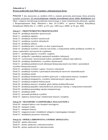 Załącznik nr 2 Proszę podkreślić kod PKD zgodnie z dokumentacją firmy Priorytet 1 aby skorzystać ze środków KFS w ramach priorytetu pierwszego firma powinna posiadać przypisany dla przeważającego rodzaju prowadzonej przez siebie działalności kod PKD - wsparcie zawodowego kształcenia ustawicznego w niżej wymienionych sektorach, zgodnie z Rozporządzeniem Rady Ministrów z dnia 24.12.2007r. w sprawie Polskiej Klasyfikacji Działalności (PKD) (Dz. U. z 2007r. nr 251, poz. 1885 oraz z 2009r. nr 59, poz. 489): Sekcja C - PRZETWÓRSTWO PRZEMYSŁOWE Dział 10 - produkcja artykułów spożywczych Dział 11 - produkcja napojów Dział 12 - produkcja wyrobów tytoniowych Dział 13 - produkcja wyrobów tekstylnych Dział 14 - produkcja odzieży Dział 15 - produkcja skór i wyrobów ze skór wyprawionych Dział 16 - produkcja wyrobów z drewna oraz korka, z wyłączeniem mebli; produkcja wyrobów ze słomy i materiałów używanych do wyplatania Dział 17 - produkcja papieru i wyrobów z papieru Dział 18 - poligrafia i reprodukcja zapisanych nośników informacji Dział 19 - wytwarzanie i przetwarzanie koksu i produktów rafinacji ropy naftowej Dział 20 - produkcja chemikaliów i wyrobów chemicznych Dział 21 - produkcja podstawowych substancji farmaceutycznych oraz leków i pozostałych wyrobów farmaceutycznych Dział 22 - produkcja wyrobów z gumy i tworzyw sztucznych Dział 23 - produkcja wyrobów z pozostałych mineralnych surowców niemetalicznych Dział 24 - produkcja metali Dział 25 - produkcja metalowych wyrobów gotowych, z wyłączeniem maszyn i urządzeń Dział 26 - produkcja komputerów, wyrobów elektronicznych i optycznych Dział 27 - produkcja urządzeń elektrycznych Dział 28 - produkcja maszyn i urządzeń, gdzie indziej niesklasyfikowana Dział 29 - produkcja pojazdów samochodowych, przyczep i naczep, z wyłączeniem motocykli Dział 30 - produkcja pozostałego sprzętu transportowego Dział 31 - produkcja mebli Dział 32 - pozostała produkcja wyrobów Dział 33 - naprawa, konserwacja i instalowanie maszyn i urządzeń, Sekcja H - TRANSPORT I GOSPODARKA MAGAZYNOWA Dział 49 - transport lądowy oraz transport rurociągowy Dział 50 - transport wodny Dział 51 - transport lotniczy Dział 52 - magazynowanie i działalność usługowa wspomagająca transport Dział 53 - działalność pocztowa i kurierska Sekcja Q - OPIEKA ZDROWOTNA I POMOC SPOŁECZNA Dział 86 - opieka zdrowotna Dział 87 - pomoc społeczna z zakwaterowaniem Dział 88 - pomoc społeczna bez zakwaterowania WAŻNE: Nie kwalifikują się do korzystania ze środków KFS w ramach powyższego priorytetu firmy klasyfikowane w poniższych sekcjach, działach bądź grupach, czyli z kodem dla przeważającego rodzaju działalności rozpoczynającym się od liczb, odpowiednio: 33.1 - firmy zajmujące się wykonywaniem generalnych przeglądów i napraw środków transportu, z wyłączeniem pojazdów samochodowych 42 – firmy zajmujące się budową, utrzymaniem i naprawą dróg kołowych, szynowych, portów morskich, płyt lotnisk, 45.20 – firmy zajmujące się konserwacją i naprawą pojazdów samochodowych, 77.1 i 77.3 – firmy prowadzące wynajmem środków transportu bez kierowcy lub załogi. Nie są finansowane ze środków KFS staże podyplomowe wraz z kosztem obsługi określonym w przepisach o zawodach lekarza i lekarza dentysty oraz szkolenia specjalizacyjne lekarzy i lekarzy dentystów, o których mowa w przepisach o zawodach lekarza i lekarza dentysty, a także specjalizacje pielęgniarek i położnych, o których mowa w przepisach o zawodach pielęgniarki i położnej.
