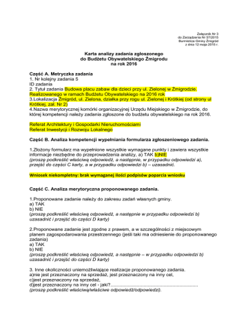 Załącznik Nr 3 do Zarządzenia Nr 57/2015 Burmistrza Gminy Żmigród z dnia 12 maja 2015 r. Karta analizy zadania zgłoszonego do Budżetu Obywatelskiego Żmigrodu na rok 2016 Część A. Metryczka zadania 1. Nr kolejny zadania 5 ID zadania 2. Tytuł zadania Budowa placu zabaw dla dzieci przy ul. Zielonej w Żmigrodzie. Realizowanego w ramach Budżetu Obywatelskiego na 2016 rok 3.Lokalizacja Żmigród, ul. Zielona, działka przy rogu ul. Zielonej i Krótkiej (od strony ul Krótkiej, zał. Nr 2) 4.Nazwa merytorycznej komórki organizacyjnej Urzędu Miejskiego w Żmigrodzie, do której kompetencji należy zadania zgłoszone do budżetu obywatelskiego na rok 2016. Referat Architektury i Gospodarki Nieruchomościami Referat Inwestycji i Rozwoju Lokalnego Część B. Analiza kompetencji wypełniania formularza zgłoszeniowego zadania. 1.Złożony formularz ma wypełnione wszystkie wymagane punkty i zawiera wszystkie informacje niezbędne do przeprowadzenia analizy, a) TAK b)NIE (proszę podkreślić właściwą odpowiedź, a następnie, w przypadku odpowiedzi a), przejść do części C karty, a w przypadku odpowiedzi b) – uzasadnić. Wniosek niekompletny: brak wymaganej ilości podpisów poparcia wniosku Część C. Analiza merytoryczna proponowanego zadania. 1.Proponowane zadanie należy do zakresu zadań własnych gminy. a) TAK b) NIE (proszę podkreślić właściwą odpowiedź, a następnie w przypadku odpowiedzi b) uzasadnić i przejść do części D karty) 2.Proponowane zadanie jest zgodne z prawem, a w szczególności z miejscowym planem zagospodarowania przestrzennego (jeśli taki ma odniesienie do proponowanego zadania) a) TAK b) NIE (proszę podkreślić właściwą odpowiedź, a następnie – w przypadku odpowiedzi b) uzasadnić i przejść do części D karty) 3. Inne okoliczności uniemożliwiające realizacje proponowanego zadania. a)nie jest przeznaczony na sprzedaż, jest przeznaczony na inny cel, c)jest przeznaczony na sprzedaż, d)jest przeznaczony na inny cel - jaki?.................................................................. (proszę podkreślić właściwą/właściwe odpowiedź/odpowiedzi). 4. Proponowane zadanie jest przewidziane do uwzględnienia w budżecie gminy Żmigród na 2016 r. poza budżetem obywatelskim: a) TAK b) NIE (proszę podkreślić właściwą odpowiedź, a następnie - w przypadku odpowiedzi a) - przejść do części D karty) 5. Zadanie jest możliwe do realizacji w trakcie jednego roku budżetowego: a) TAK b) NIE 6. Szacunkowe koszty proponowanego zadania: 7. Opinia o technicznej wykonalności (jeśli dotyczy) proponowanego zadania: a)pozytywna b)negatywna c)nie dotyczy (proszę podkreślić właściwą odpowiedź, a w przypadku odpowiedzi b) - uzasadnić ją). 8. Opinia o celowości realizacji proponowanego zadania w kontekście ustawowych wymogów w zakresie gospodarności: a)pozytywna b)negatywna (proszę podkreślić właściwą odpowiedź, a następnie uzasadnić ją). 9. Opinia o kosztach eksploatacji proponowanego zadania (o ile wystąpi) w kontekście wymogów gospodarności: a)pozytywna b)negatywna c)nie dotyczy (proszę podkreślić właściwą odpowiedź, a w przypadku odpowiedzi a) i b) uzasadnić ją). 10.Inne okoliczności uniemożliwiające realizację proponowanego zadania. a)nie są znane w okresie prowadzenia analizy, b)są znane w okresie prowadzenia analizy (proszę podkreślić właściwą odpowiedź, a w przypadku odpowiedzi b) opisać te okoliczności i wyjaśnić ich wpływ na realizację zadania). Część D. Rekomendacja dotycząca uwzględnienia propozycji zadania zgłoszonego do budżetu obywatelskiego na karcie do głosowania: a)pozytywna b)negatywna (proszę podkreślić właściwą odpowiedź, a następnie uzasadnić ją) E. Potwierdzenie ustaleń i opinii z części B i części C oraz rekomendacji z części D karty analizy zadania zgłoszonego do budżetu obywatelskiego na 2016 r. Odrzucony ze względów formalnych (wniosek niekompletny: brak wymaganej ilości podpisów) Zespół ds. Budżetu Obywatelskiego