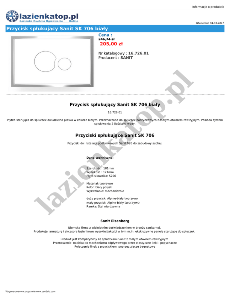 Informacje o produkcie Utworzono 04-03-2017 Przycisk spłukujący Sanit SK 706 biały Cena : 246,74 zł 205,00 zł p. pl Nr katalogowy : 16.726.01 Producent : SANIT Przycisk spłukujący Sanit SK 706 biały to 16.726.01 Płytka sterująca do spłuczek dwudzielna płaska w kolorze białym. Przeznaczona do spłuczek podtynkowych z małym otworem rewizyjnym. Posiada system spłukiwania 2 ilościami wody. ka Przyciski spłukujące Sanit SK 706 Przyciski do instalacji podtynkowych Sanit 995 do zabudowy suchej. en Dane techniczne: la zi Szerokość : 181mm Wysokość : 121mm Płyta siłownika: S706 Materiał: tworzywo Kolor: biały połysk Wyzwalanie: mechanicznie duży przycisk: Alpine-biały tworzywo mały przycisk: Alpine-biały tworzywo Ramka: Stal nierdzewna Sanit Eisenberg Niemcka firma z wieloletnim doświadczeniem w branży sanitarnej. Produkuje armaturę i akcesora łazienkowe wysokiej jakości w tym m.in. ekskluzywne panele sterujące do spłuczek. Produkt jest kompatybilny ze spłuczkami Sanit z małym otworem rewizyjnym Przenoszenie nacisku do mechanizmu odpływowego przez elastyczne linki - popychacze Połączenie linek z przyciskiem poprzez złącze bagnetowe Wygenerowano w programie www.oscGold.com pl p. to ka en zi la Zdjęcia poglądowe płytki spłukującej Sanit płaskiej białej obrazują efektowny połysk powierzchni przypominający szkło. la zi en ka to p. pl Informacje o produkcie Wygenerowano w programie www.oscGold.com