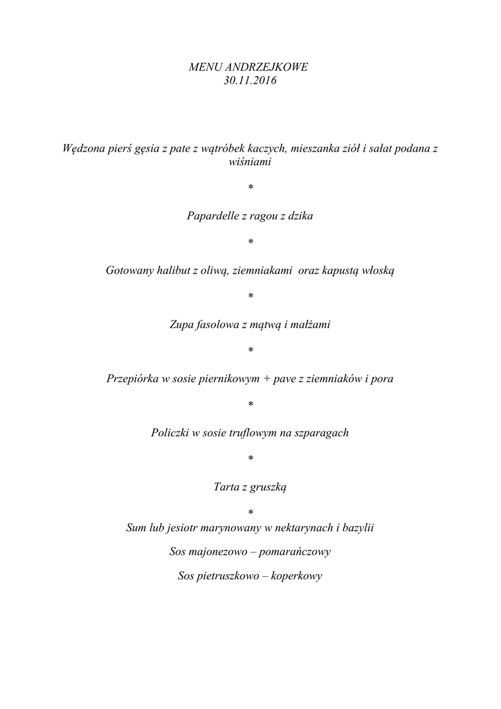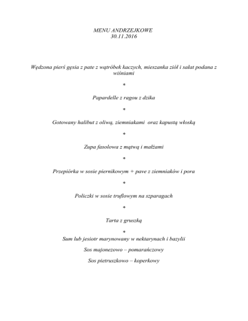 MENU ANDRZEJKOWE 30.11.2016 Wędzona pierś gęsia z pate z wątróbek kaczych, mieszanka ziół i sałat podana z wiśniami * Papardelle z ragou z dzika * Gotowany halibut z oliwą, ziemniakami oraz kapustą włoską * Zupa fasolowa z mątwą i małżami * Przepiórka w sosie piernikowym + pave z ziemniaków i pora * Policzki w sosie truflowym na szparagach * Tarta z gruszką * Sum lub jesiotr marynowany w nektarynach i bazylii Sos majonezowo – pomarańczowy Sos pietruszkowo – koperkowy