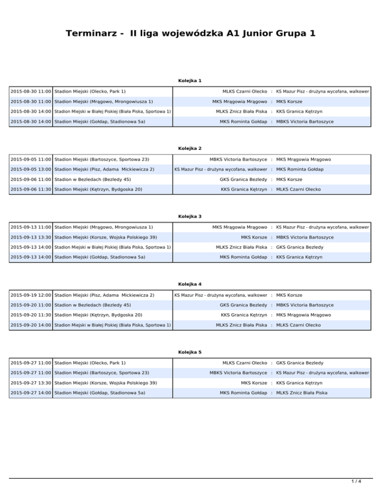 Terminarz - II liga wojewódzka A1 Junior Grupa 1 Kolejka 1 2015-08-30 11:00 Stadion Miejski (Olecko, Park 1) MLKS Czarni Olecko : KS Mazur Pisz - drużyna wycofana, walkower 2015-08-30 11:00 Stadion Miejski (Mrągowo, Mrongowiusza 1) MKS Mrągowia Mrągowo : MKS Korsze 2015-08-30 14:00 Stadion Miejski w Białej Piskiej (Biała Piska, Sportowa 1) MLKS Znicz Biała Piska : KKS Granica Kętrzyn 2015-08-30 14:00 Stadion Miejski (Gołdap, Stadionowa 5a) MKS Rominta Gołdap : MBKS Victoria Bartoszyce Kolejka 2 2015-09-05 11:00 Stadion Miejski (Bartoszyce, Sportowa 23) 2015-09-05 13:00 Stadion Miejski (Pisz, Adama Mickiewicza 2) MBKS Victoria Bartoszyce : MKS Mrągowia Mrągowo KS Mazur Pisz - drużyna wycofana, walkower : MKS Rominta Gołdap 2015-09-06 11:00 Stadion w Bezledach (Bezledy 45) GKS Granica Bezledy : MKS Korsze 2015-09-06 11:30 Stadion Miejski (Kętrzyn, Bydgoska 20) KKS Granica Kętrzyn : MLKS Czarni Olecko Kolejka 3 2015-09-13 11:00 Stadion Miejski (Mrągowo, Mrongowiusza 1) MKS Mrągowia Mrągowo : KS Mazur Pisz - drużyna wycofana, walkower 2015-09-13 13:30 Stadion Miejski (Korsze, Wojska Polskiego 39) MKS Korsze : MBKS Victoria Bartoszyce 2015-09-13 14:00 Stadion Miejski w Białej Piskiej (Biała Piska, Sportowa 1) MLKS Znicz Biała Piska : GKS Granica Bezledy 2015-09-13 14:00 Stadion Miejski (Gołdap, Stadionowa 5a) MKS Rominta Gołdap : KKS Granica Kętrzyn Kolejka 4 2015-09-19 12:00 Stadion Miejski (Pisz, Adama Mickiewicza 2) KS Mazur Pisz - drużyna wycofana, walkower : MKS Korsze 2015-09-20 11:00 Stadion w Bezledach (Bezledy 45) GKS Granica Bezledy : MBKS Victoria Bartoszyce 2015-09-20 11:30 Stadion Miejski (Kętrzyn, Bydgoska 20) KKS Granica Kętrzyn : MKS Mrągowia Mrągowo 2015-09-20 14:00 Stadion Miejski w Białej Piskiej (Biała Piska, Sportowa 1) MLKS Znicz Biała Piska : MLKS Czarni Olecko Kolejka 5 2015-09-27 11:00 Stadion Miejski (Olecko, Park 1) 2015-09-27 11:00 Stadion Miejski (Bartoszyce, Sportowa 23) 2015-09-27 13:30 Stadion Miejski (Korsze, Wojska Polskiego 39) 2015-09-27 14:00 Stadion Miejski (Gołdap, Stadionowa 5a) MLKS Czarni Olecko : GKS Granica Bezledy MBKS Victoria Bartoszyce : KS Mazur Pisz - drużyna wycofana, walkower MKS Korsze : KKS Granica Kętrzyn MKS Rominta Gołdap : MLKS Znicz Biała Piska 1/4 Terminarz - II liga wojewódzka A1 Junior Grupa 1 Kolejka 6 2015-10-04 11:00 Stadion w Bezledach (Bezledy 45) GKS Granica Bezledy : KS Mazur Pisz - drużyna wycofana, walkower 2015-10-04 11:00 Stadion Miejski (Olecko, Park 1) MLKS Czarni Olecko : MKS Rominta Gołdap 2015-10-04 12:00 Stadion Miejski (Kętrzyn, Bydgoska 20) KKS Granica Kętrzyn : MBKS Victoria Bartoszyce 2015-10-04 14:00 Stadion Miejski w Białej Piskiej (Biała Piska, Sportowa 1) MLKS Znicz Biała Piska : MKS Mrągowia Mrągowo Kolejka 7 2015-10-11 11:00 Stadion Miejski (Mrągowo, Mrongowiusza 1) 2015-10-11 12:00 Stadion Miejski (Pisz, Adama Mickiewicza 2) MKS Mrągowia Mrągowo : MLKS Czarni Olecko KS Mazur Pisz - drużyna wycofana, walkower : KKS Granica Kętrzyn 2015-10-11 13:30 Stadion Miejski (Korsze, Wojska Polskiego 39) MKS Korsze : MLKS Znicz Biała Piska 2015-10-11 14:00 Stadion Miejski (Gołdap, Stadionowa 5a) MKS Rominta Gołdap : GKS Granica Bezledy Kolejka 8 2015-10-18 11:00 Stadion w Bezledach (Bezledy 45) GKS Granica Bezledy : KKS Granica Kętrzyn 2015-10-18 11:00 Stadion Miejski (Olecko, Park 1) MLKS Czarni Olecko : MKS Korsze 2015-10-18 14:00 Stadion Miejski w Białej Piskiej (Biała Piska, Sportowa 1) MLKS Znicz Biała Piska : MBKS Victoria Bartoszyce 2015-10-18 14:00 Stadion Miejski (Gołdap, Stadionowa 5a) MKS Rominta Gołdap : MKS Mrągowia Mrągowo Kolejka 9 2015-10-24 11:00 Stadion Miejski (Bartoszyce, Sportowa 23) 2015-10-24 13:00 Stadion Miejski (Pisz, Adama Mickiewicza 2) MBKS Victoria Bartoszyce : MLKS Czarni Olecko KS Mazur Pisz - drużyna wycofana, walkower : MLKS Znicz Biała Piska 2015-10-25 11:00 Stadion Miejski (Mrągowo, Mrongowiusza 1) MKS Mrągowia Mrągowo : GKS Granica Bezledy 2015-10-25 13:30 Stadion Miejski (Korsze, Wojska Polskiego 39) MKS Korsze : MKS Rominta Gołdap Kolejka 10 -0001-11-30 00:00 2016-04-16 12:00 Stadion Miejski (Bartoszyce, Sportowa 23) 2016-04-17 11:00 Stadion Miejski (Kętrzyn, Bydgoska 20) 2016-04-17 13:30 Stadion Miejski (Korsze, Wojska Polskiego 39) KS Mazur Pisz - drużyna wycofana, walkower : MLKS Czarni Olecko MBKS Victoria Bartoszyce : MKS Rominta Gołdap KKS Granica Kętrzyn : MLKS Znicz Biała Piska MKS Korsze : MKS Mrągowia Mrągowo 2/4 Terminarz - II liga wojewódzka A1 Junior Grupa 1 Kolejka 11 -0001-11-30 00:00 MKS Rominta Gołdap : KS Mazur Pisz - drużyna wycofana, walkower 2016-04-23 11:00 Stadion Miejski (Mrągowo, Mrongowiusza 1) MKS Mrągowia Mrągowo : MBKS Victoria Bartoszyce 2016-04-24 11:00 Stadion Miejski (Olecko 1) MLKS Czarni Olecko : KKS Granica Kętrzyn 2016-04-24 13:00 Stadion Miejski (Korsze, Wojska Polskiego 39) MKS Korsze : GKS Granica Bezledy Kolejka 12 -0001-11-30 00:00 KS Mazur Pisz - drużyna wycofana, walkower : MKS Mrągowia Mrągowo 2016-04-30 12:00 Stadion Miejski (Bartoszyce, Sportowa 23) MBKS Victoria Bartoszyce : MKS Korsze 2016-05-01 11:00 Stadion w Bezledach (Bezledy 45) GKS Granica Bezledy : MLKS Znicz Biała Piska 2016-05-04 17:30 Stadion Miejski (Kętrzyn, Bydgoska 20) KKS Granica Kętrzyn : MKS Rominta Gołdap Kolejka 13 -0001-11-30 00:00 MKS Korsze : KS Mazur Pisz - drużyna wycofana, walkower 2016-05-07 12:00 Stadion Miejski (Bartoszyce, Sportowa 23) MBKS Victoria Bartoszyce : GKS Granica Bezledy 2016-05-08 11:00 Stadion Miejski (Mrągowo, Mrongowiusza 1) MKS Mrągowia Mrągowo : KKS Granica Kętrzyn 2016-05-08 11:00 Stadion Miejski (Olecko 1) MLKS Czarni Olecko : MLKS Znicz Biała Piska Kolejka 14 -0001-11-30 00:00 KS Mazur Pisz - drużyna wycofana, walkower : MBKS Victoria Bartoszyce 2016-05-15 11:00 Stadion w Bezledach (Bezledy 45) GKS Granica Bezledy : MLKS Czarni Olecko 2016-05-15 11:00 Stadion Miejski (Kętrzyn, Bydgoska 20) KKS Granica Kętrzyn : MKS Korsze 2016-05-15