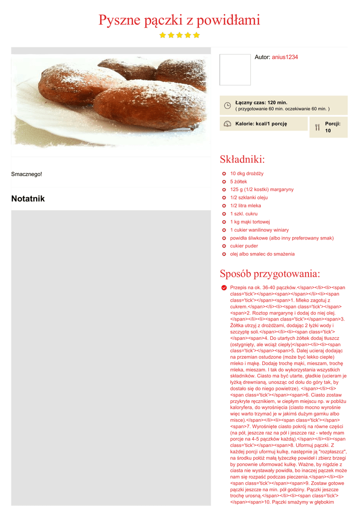 Pyszne pączki z powidłami Autor: anius1234 Łączny czas: 120 min. ( przygotowanie 60 min. oczekiwanie 60 min. ) Kalorie: kcal/1 porcję Porcji: 10 Składniki: Smacznego! 10 dkg drożdży 5 żółtek 125 g (1/2 kostki) margaryny Notatnik 1/2 szklanki oleju 1/2 litra mleka 1 szkl. cukru 1 kg mąki tortowej 1 cukier wanilinowy winiary powidła śliwkowe (albo inny preferowany smak) cukier puder olej albo smalec do smażenia Sposób przygotowania: Przepis na ok. 3640 pączków.</span></li><li><span class='tick'></span><span></span></li><li><span class='tick'></span><span>1. Mleko zagotuj z cukrem.</span></li><li><span class='tick'></span> <span>2. Roztop margarynę i dodaj do niej olej. </span></li><li><span class='tick'></span><span>3. Żółtka utrzyj z drożdżami, dodając 2 łyżki wody i szczyptę soli.</span></li><li><span class='tick'> </span><span>4. Do utartych żółtek dodaj tłuszcz (ostygnięty, ale wciąż ciepły)</span></li><li><span class='tick'></span><span>5. Dalej ucieraj dodając na przemian ostudzone (może być lekko ciepłe) mleko i mąkę. Dodaję trochę mąki, mieszam, trochę mleka, mieszam. I tak do wykorzystania wszystkich składników. Ciasto ma być utarte, gładkie (ucieram je łyżką drewnianą, unosząc od dołu do góry tak, by dostało się do niego powietrze). </span></li><li> <span class='tick'></span><span>6. Ciasto zostaw przykryte ręcznikiem, w ciepłym miejscu np. w pobliżu kaloryfera, do wyrośnięcia (ciasto mocno wyrośnie więc warto trzymać je w jakimś dużym garnku albo misce).</span></li><li><span class='tick'></span> <span>7. Wyrośnięte ciasto pokrój na równe części (na pół, jeszcze raz na pół i jeszcze raz wtedy mam porcje na 45 pączków każdą).</span></li><li><span class='tick'></span><span>8. Uformuj pączki. Z każdej porcji uformuj kulkę, następnie ją "rozpłaszcz", na środku połóż małą łyżeczkę powideł i zbierz brzegi by ponownie uformować kulkę. Ważne, by nigdzie z ciasta nie wystawały powidła, bo inaczej pączek może nam się rozpaść podczas pieczenia.</span></li><li> <span class='tick'></span><span>9. Zostaw gotowe pączki jeszcze na min. pół godziny. Pączki jeszcze trochę urosną.</span></li><li><span class='tick'> </span><span>10. Pączki smażymy w głębokim tłuszczu. W wysokim garnku podgrzej olej (może też być smalec). Tłuszcz powinien zajmować ok. 67 cm wysokości. Gdy już będzie gorący delikatnie wkładamy pączki (żeby się nie poparzyć!). Układamy je tak, by gładki wierzch był skierowany w stronę dna garnka (czyli najpierw smażymy część która na pewno nam się nie rozpadnie). Po 23 minutach sprawdzamy, czy pączki są już brązowe. Jeśli tak, przekładamy je na drugą stronę. Gdy i ta strona już będzie brązowa, wyciągamy pączki i wkładamy kolejną porcję.</span></li><li><span class='tick'> </span><span>10. Pączki możesz polukrować albo po prostu posypać cukrem pudrem.