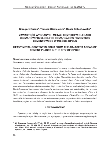 Ochrona Środowiska i Zasobów Naturalnych nr 40, 2009 r. Grzegorz Kusza*, Tomasz Ciesielczuk*, Beata Gołuchowska* Zawartość wybranych metali ciężkich w glebach obszarów przyległych do zakładów przemysłu cementowego w mieście Opolu Heavy metal content in soils from the adjacent areas of cement plants in the City of Opole Słowa kluczowe: metale ciężkie, cementownie, gleby miejskie. Key words: heavy metal, cement plants, urban soils. Cement industry belongs to the main branches of economy conditioning development of the Province of Opole. Location of cement and lime plants is directly connected to the occurrence of deposits of carbonate resources. In the Province Of Opole such deposits are situated in the central and eastern part of the region. The article describes the results of the research into soil contamination in the vicinity of two cement plants: Odra – still being in business, and Groszowice – which is closed at present. Soils in the surroundings of the plants were characterized by alkaline reaction, high content of humus and relatively law salinity. The influence of the cement plants on the environment was estimated taking into account the content of chosen trace elements in the samples taken from surface layer of the soil (0–30 cm). Investigations showed the increase in the content of lead (Pb), zinc (Zn) and cadmium (Cd) in the areas situated close to the cement plants, regardless of the activity of a plant. In addition, higher accumulation of metals was found in soils next to Odra cement plant. 1. WPROWADZENIE Opolszczyzna należy do regionów o dynamicznie rozwijającym się przemyśle cementowo-wapiennym. Na obszarze tym występują bogate złoża surowców węglanowych, * Dr Grzegorz Kusza, tel.: 77 401 60 01; e-mail: [email protected]; dr inż. Tomasz Ciesielczuk, tel.: 77 401 60 27; e-mail: [email protected]; dr. Beata Gołuchowska, tel.: 77 401 60 27; e-mail: [email protected]; Katedra Ochrony Powierzchni Ziemi, Uniwersytet Opolski, ul. Oleska 22, 45-052 Opole. 70 Zawartość wybranych metali ciężkich w glebach obszarów przyległych do zakładów... zwłaszcza wapienie muszlowe i margle kredowe. Zakłady cementowo-wapiennicze zostały zlokalizowane na obszarze pomiędzy Opolem, Gogolinem i Strzelcami Opolskim. Silna presja przemysłu cementowego, szczególnie uwidacznia się ilością wybudowanych w Opolu cementowni. Z istniejących w tym mieście pięciu cementowni (Wróblin, Bolko, Piast, Groszowice i Odra) funkcjonuje do dnia dzisiejszego jeden zakład: Cementownia Odra – zlokalizowany w odległości 500 m od centrum. Takie umiejscowienie oraz zastosowana technologia może przyczyniać się do pogorszenia jakości gleb, zwłaszcza wzrostu w nich deponowanych technogennych zanieczyszczeń. Bezpośredni wpływ na ilość i jakość emisji zanieczyszczeń pyłowych z cementowni i wapienników ma rodzaj zastosowanej technologii oraz szczelność procesów, przede wszystkim załadunku – dział pakowni. Prowadzone w kraju i zagranicą badania wskazują na istotne, ale tylko lokalne oddziaływanie cementowni [Przemeck 1970, Strzyszcz 1982, Gołuchowska i Strzyszcz 1999]. W pracy przeprowadzono analizę zawartości wybranych pierwiastków śladowych w glebach zlokalizowanych wokół dwóch zakładów, zamkniętej Cementowni Groszowice i funkcjonującej Cementowni Odra. 2. MATERIAŁY I METODY Prace wykonano w 2008 r., próbki pobrano z gleb nieprzekształconych mechanicznie z warstwy 0–30 cm, na każdym obiekcie wydzielono pięć poletek badawczych o powierzchni ok. 100 m2. Z każdego poletka pobrano jedną próbę mieszaną uśrednioną z 30 próbek indywidualnych. Miejsca pobrania zostały wytypowane z uwzględnieniem: • naturalnego, nieprzekształconego układu poziomów genetycznych (powierzchnie zadarnione – trawniki); • kierunku dominujących wiatrów, • lokalizacji poszczególnych wydziałów technologicznych. W próbkach gleb oznaczono podstawowe parametry fizykochemiczne: • odczyn – potencjometrycznie, • przewodnictwo właściwe – konduktometrycznie, • skład granulometryczny metodą areometryczną Casagrande’a w modyfikacji Prószyńskiego, • zawartość węgla organicznego metodą Tiurina oraz • zawartość wybranych pierwiastków: ołowiu, miedzi, kadmu, chromu, niklu, cynku i rtęci, metodą Atomowej spektrometrii absorpcyjnej po uprzednim trawieniu wodą królewską. 71 Grzegorz Kusza, Tomasz Ciesielczuk, Beata Gołuchowska 3. WYNIKI BADAŃ I DYSKUSJA Jak wskazuje Strzyszcz [1995] gleby w województwie opolskim są szczególnie narażone na oddziaływanie przemysłu cementowo-wapienniczego. Uwidacznia się ono w glebach wzrostem ilości pierwiastków śladowych oraz podniesieniem wartości pH. Podobne wnioski wyciągnięto w pracach dotyczących wpływu przemysłu cementowo-wapienniczego w okolicach Kielc [Świercz 2009]. Wokół zakładów występują wytworzone z margli kredowych rędziny właściwe i czarnoziemne. Analizowane gleby charakteryzuje alkaliczny odczyn pH w KCl w przedziale od 7,21 do 7,48 (Cementownia Groszowice) i 7,3– 7,61 (Cementownia Odra). Emitowane z wymienionych zakładów pyły alkaliczne nie wpłynęły w istotny sposób na odczyn badanych gleb, przedstawione powyżej wartości pH są typowe dla rędzin. Drugim mierzonym parametrem było przewodnictwo właściwe, stanowiące miarę zasolenia gleb. Największą wartość przewodnictwa odnotowano w próbce nr 3, pobranej w pobliżu Cementowni Odra, wynoszącą 0,972 mS·cm-1. Pozostałe próbki charakteryzowało małe zasolenie, o przewodnictwie właściwym nieprzekraczającym 0,3 mS·cm-1. Istotnym czynnikiem wpływającym na jakość gleb jest ilość węgla organicznego. W badanych próbkach stwierdzono dużą zawartość węgla organicznego w zakresie od 1,88% do 7,01%, co jest charakterystyczne dla rędzin czarnoziemnych i częściowo właściwych. Stosunkowo duża zawartość próchnicy zwiększa odporność gleb na degradację ch