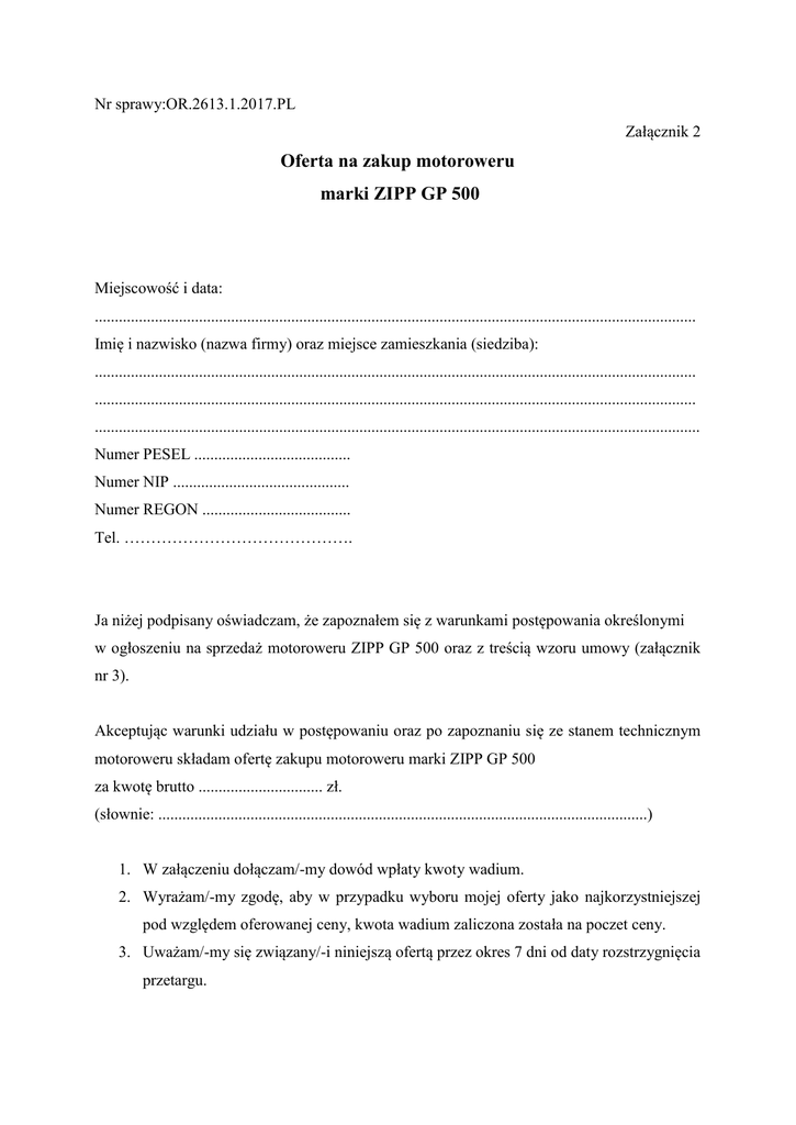 Nr sprawy:OR.2613.1.2017.PL Załącznik 2 Oferta na zakup motoroweru marki ZIPP GP 500 Miejscowość i data: ...................................................................................................................................................... Imię i nazwisko (nazwa firmy) oraz miejsce zamieszkania (siedziba): ...................................................................................................................................................... ...................................................................................................................................................... ....................................................................................................................................................... Numer PESEL ....................................... Numer NIP ............................................ Numer REGON ..................................... Tel. ……………………………………. Ja niżej podpisany oświadczam, że zapoznałem się z warunkami postępowania określonymi w ogłoszeniu na sprzedaż motoroweru ZIPP GP 500 oraz z treścią wzoru umowy (załącznik nr 3). Akceptując warunki udziału w postępowaniu oraz po zapoznaniu się ze stanem technicznym motoroweru składam ofertę zakupu motoroweru marki ZIPP GP 500 za kwotę brutto ............................... zł. (słownie: ..........................................................................................................................) 1. W załączeniu dołączam/-my dowód wpłaty kwoty wadium. 2. Wyrażam/-my zgodę, aby w przypadku wyboru mojej oferty jako najkorzystniejszej pod względem oferowanej ceny, kwota wadium zaliczona została na poczet ceny. 3. Uważam/-my się związany/-i niniejszą ofertą przez okres 7 dni od daty rozstrzygnięcia przetargu. 4. Zobowiązuję/-my się, w przypadku wyboru mojej/naszej oferty do zawarcia umowy zgodnej z niniejszą ofertą, na warunkach określonych we wzorze umowy, w miejscu i terminie wyznaczonym przez Sprzedającego. ............................................. Podpis oferenta