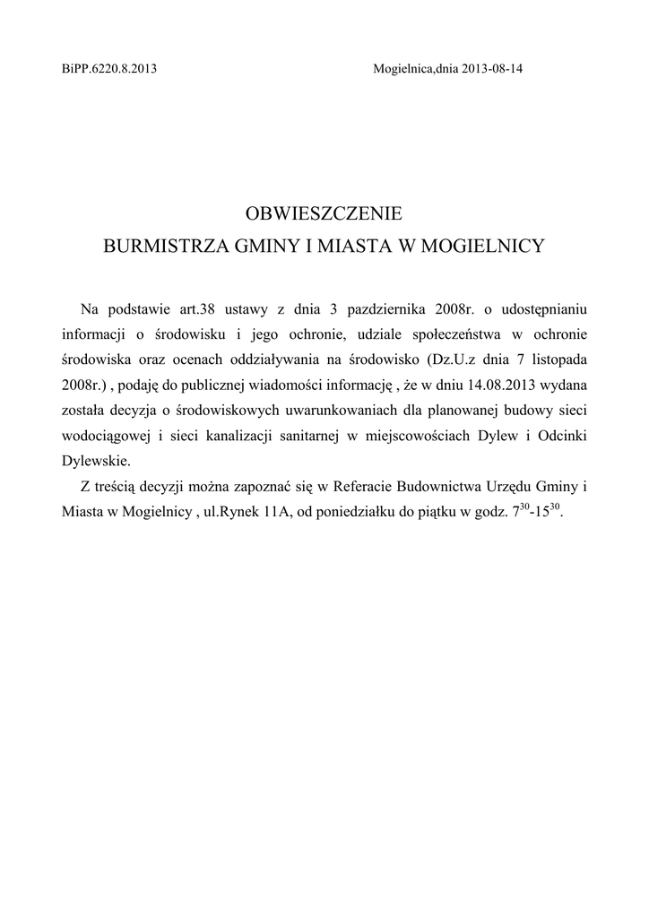 BiPP.6220.8.2013 Mogielnica,dnia 2013-08-14 OBWIESZCZENIE BURMISTRZA GMINY I MIASTA W MOGIELNICY Na podstawie art.38 ustawy z dnia 3 pazdziernika 2008r. o udostępnianiu informacji o środowisku i jego ochronie, udziale społeczeństwa w ochronie środowiska oraz ocenach oddziaływania na środowisko (Dz.U.z dnia 7 listopada 2008r.) , podaję do publicznej wiadomości informację , że w dniu 14.08.2013 wydana została decyzja o środowiskowych uwarunkowaniach dla planowanej budowy sieci wodociągowej i sieci kanalizacji sanitarnej w miejscowościach Dylew i Odcinki Dylewskie. Z treścią decyzji można zapoznać się w Referacie Budownictwa Urzędu Gminy i Miasta w Mogielnicy , ul.Rynek 11A, od poniedziałku do piątku w godz. 730-1530.