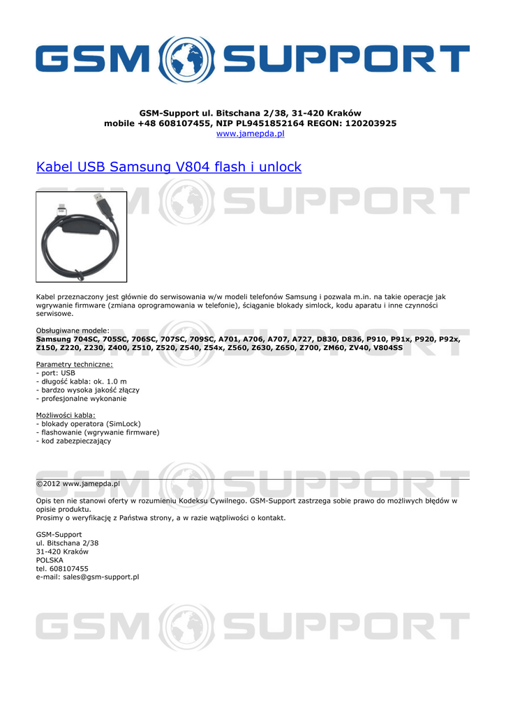 GSM-Support ul. Bitschana 2/38, 31-420 Kraków mobile +48 608107455, NIP PL9451852164 REGON: 120203925 www.jamepda.pl Kabel USB Samsung V804 flash i unlock Kabel przeznaczony jest głównie do serwisowania w/w modeli telefonów Samsung i pozwala m.in. na takie operacje jak wgrywanie firmware (zmiana oprogramowania w telefonie), ściąganie blokady simlock, kodu aparatu i inne czynności serwisowe. Obsługiwane modele: Samsung 704SC, 705SC, 706SC, 707SC, 709SC, A701, A706, A707, A727, D830, D836, P910, P91x, P920, P92x, Z150, Z220, Z230, Z400, Z510, Z520, Z540, Z54x, Z560, Z630, Z650, Z700, ZM60, ZV40, V804SS Parametry techniczne: - port: USB - długość kabla: ok. 1.0 m - bardzo wysoka jakość złączy - profesjonalne wykonanie Możliwości kabla: - blokady operatora (SimLock) - flashowanie (wgrywanie firmware) - kod zabezpieczający ©2012 www.jamepda.pl Opis ten nie stanowi oferty w rozumieniu Kodeksu Cywilnego. GSM-Support zastrzega sobie prawo do możliwych błędów w opisie produktu. Prosimy o weryfikację z Państwa strony, a w razie wątpliwości o kontakt. GSM-Support ul. Bitschana 2/38 31-420 Kraków POLSKA tel. 608107455 e-mail: [email protected] Powered by TCPDF (www.tcpdf.org)