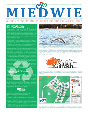 PLAŻE | KĄPIELISKA | DEPTAKI | TRASY BIEGOWE | ŚCIEŻKI ROWEROWE | CHODZENIE | BIEGANIE | JEŻDŻENIE | PŁYWANIE | NURKOWANIE | ŻEGLOWANIE MIEDWIE TOWARZYSTWO PRZYRODNICZE KOCHAMMIEDWIE.PL | BEZPŁATNA GAZETA REKLAMOWA SYMPATYKÓW I PRZYJACIÓŁ | WYDAWCA GREMEDIA DLA 21NGn.com - NUMER 1 | X 2015 JĘCZYDÓŁ–KOBYLANK A–KOSZEWO –KUNOWO –MORZYCZYN–SK ALIN–ZIELENIEWO DO DRUKU TEJ GAZETY U Ż Y L I Ś M Y PA P I E R T Y P U O FFS E T C YC LUS PR I N T 170g/m2 Recyklizacja jest jedną z metod ochrony środowiska naturalnego, której wysoki wkład społeczny jest odwrotnie proporcjonalny do generowanych kosztów. Ważnym celem recyklingu jest ograniczenie zużycia surowców naturalnych. Zmniejszenie ilości odpadów jest już tylko procesem ubocznym. Świadomi producenci oznakowują swoje wyroby kodem recyklingu. CyclusOffset to 100% recyklingowy niepowlekany, naturalny, papier offsetowy. Dzięki szczególnym właściwościom recyklingu CyclusOffset umożliwia doskonały druk przy użyciu niskiej gramatury farb drukarskich. Dobra jakość druku jest możliwa nawet przy niskiej gramaturze surowca. Odpady papierowe są jednym z głównych surowców wtórnych, którego selektywne zbieranie jest promowane przez Natur Garden. Niebieskie kontenery są przeznaczone do gromadzenia tych surowców, co jest już chyba zakodowane w naszej świadomości. Sortowany papier trafia do zakładu, gdzie surowiec poddaje się rozpuszczeniu w kadziach z wirującą wodą, która dzieli papier na włókna. Na tym etapie odzysku surowiec zwie się pulpą. Przy pomocy napowietrzania z surowca usuwa się farby i bród. Kolejnym etapem jest wzmacnianie pulpy np. celulozą. Odsączanie, prasowanie i maszynowe przerobienie surówki na papier tekturowy, gazetowy lub higieniczny kończy proces recyklingu papieru. Powstaje papier, taki jak ten użyty do wyprodukowania 1. numeru gazety MIEDWIE. Taki papier, który właśnie teraz trzymasz w rękach. N AT U R G A R D E N 1 0 0 % Z A AN G A ŻOWAN IA W O CH RO N Ę ŚRODOWISK A Nieprzypadkowy wybór papieru użytego do druku odzwierciedla nasz system wartości. Dbamy o przyrodę, z niej korzystamy. Mieszkamy blisko natury. Dla przeciętnego czytelnika rodzaj papieru użytego do druku gazety nie ma znaczenia. Dla nas są to kolejne elementy wyboru. Nawet małymi projektami możemy wzbudzić zainteresowanie u innych ochroną środowiska naturalnego. Papier z odzysku nie jest zły. Oceń jakość. Podziel się Twoją opinią (recykling@ naturgarden.info) 100% zaangażowania. Naturalnie – bez kompromisów. Taki będzie Natur Garden. Jezioro Miedwie, to bardzo głęboki, piąty największy w kraju zbiornik słodkiej wody z powierzchnią lustra 35 km2. Miedwie to jedyne ujęcie wody pitnej dla mieszkańców Szczecina. Akwen znajduje się w południowo-zachodniej części Pobrzeża Szczecińskiego, zaledwie 21 kilometrów od stolicy województwa. Linia brzegowa okala jezioro pasem gruntu długości ponad 39 km. Nad północnym brzegiem jeziora, w okolicy Morzyczyna i Zieleniewa znajduje się Ośrodek Sportu i Rekreacji z bardzo bogatą, różnorodną infrastrukturą. Poznaj osiedle Natur Garden powstające w 21 wieku w centralnej części województwa zachodniopomorskiego w bezpośrednim sąsiedztwie jeziora Miedwie oraz parku leśnego. K O N C E P C J A ZAGOSPODAROWANIA naturgarden.inf o A SK IŃ EC CZ OFERTA SZ DOMÓW 148 m² DENSKA FINSKA 2 x 72 m² Pamiętaj! – Dbaj o środowisko naturalne, tak jak my! W porównaniu do produkcji zwykłego papieru, produkcja papieru makulaturowego pochłania mniej wody, zużywa mniej energii, nie generuje hałd na składowiskach odpadów, a emisje CO2 jest znacznie niższa. Segreguj odpady, kupuj produkty z symbolem recyklingu! MIESZK AŃ SKAN GARDEN 99 m² A. 64 m² B. 66 m² 100% natury, 100% jakości życia •Otwarte ogrody poza działkami budowalnymi •Najwyższej jakości materiały budowlane •Przestrzeń zdrowego trybu życia •Używanie atrybutów natury podczas projektowania I 2 x 76 m² ISLAND 2 x 80 m² NORDIC 2 x 80 m² NORSKA SWENSKA 2 x 80 m² URBANIA.pl GRUPA URBANO REAL w Lasy Państwowe jez. Miedwie 21NGn.com WYKONAWCA OPRACOWANIA URBANIA 60 - 506 Poznań ul. Wawrzyniaka 19 TEMAT OPRACOWANIA OSIEDLE NATUR GARDEN tel. 61 221 25 21 fax 61 624 27 99 e mail: [email protected] ADRES INWESTYCJI MORZYCZYN, GMINA KOBYLANKA RYSUNEK KONCEPCJA ZAGOSPODAROWANIA TERENU SPORZĄDZIŁA NATALIA JAKUBIAK DATA SIERPIEŃ 2015 © URBANO - WSZELKIE PRAWA ZASTRZEŻONE W miejscowości Morzyczyn, zaledwie 21 kilometrów od Szczecina w otoczeniu naturalnego piękna przyrody powstaje nowoczesny kompleks mieszkaniowy Natur Garden. Się wie, że Miedwie ! N iewielka wieś letniskowa położona nad jeziorem koło Szczecina dysponuje możliwością szybkiego dojazdu do miasta, a unikatowe ukształtowanie przestrzeni, najczystszy akwen i oferta wypoczynkowo–rozrywkowa zapewnia niepokalany habitat. Morzyczyn dzisiaj to podmiejska enklawa spokoju wyposażona w promenadę długości 2000 m, 150-metrowe molo oraz nowoczesny amfiteatr. Pośród drzew, wokół jeziora rozciągają się setki metrów oświetlonych pomostów zbudowanych w naturalnym, błotnistym terenie. Podesty drewniane wpisane w naturalne środowisko ryb, płazów i gadów są czymś wyjątkowym, a miejsce przybrało nazwę Parku Przyrody. Główne miasta okolicy stanowią Szczecin i Stargard Szczeciński. HISTORIA Atrakcyjna przyrodniczo okolica zwana kiedyś Pomorskim Morzem wabi osadników już od 4 tysięcy lat. Fascynujące zdarzenia geologiczne utworzyły zbiornik akwenu, którego okolica od stuleci służy mieszkańcom urodzajnym czarnoziemem. Średniowieczne Miedwie to początek działalność cystersów. Okolica ściąga jak magnes kolonistów i turystów. Gwarantowane wspaniałe warunki do uprawiania sportów wodnych, unikatowa fauna i flora. Tylko nad Miedwiem występuje sieja miedwiańska. Dno głębokiego zbiornika spowija tajemnica wojennej torpedowni. Gmina Sta