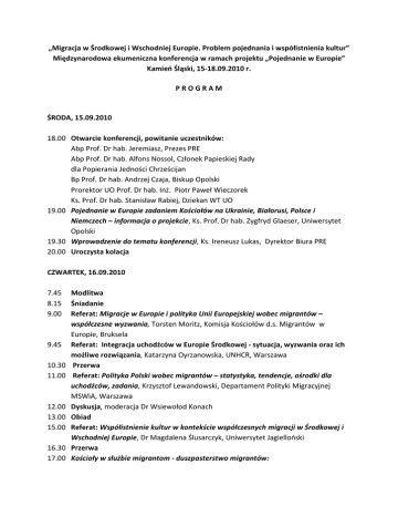 „Migracja w Środkowej i Wschodniej Europie. Problem pojednania i współistnienia kultur” Międzynarodowa ekumeniczna konferencja w ramach projektu „Pojednanie w Europie” Kamień Śląski, 15-18.09.2010 r. PROGRAM ŚRODA, 15.09.2010 18.00 Otwarcie konferencji, powitanie uczestników: Abp Prof. Dr hab. Jeremiasz, Prezes PRE Abp Prof. Dr hab. Alfons Nossol, Członek Papieskiej Rady dla Popierania Jedności Chrześcijan Bp Prof. Dr hab. Andrzej Czaja, Biskup Opolski Prorektor UO Prof. Dr hab. Inż. Piotr Paweł Wieczorek Ks. Prof. Dr hab. Stanisław Rabiej, Dziekan WT UO 19.00 Pojednanie w Europie zadaniem Kościołów na Ukrainie, Białorusi, Polsce i Niemczech – informacja o projekcie, Ks. Prof. Dr hab. Zygfryd Glaeser, Uniwersytet Opolski 19.30 Wprowadzenie do tematu konferencji, Ks. Ireneusz Lukas, Dyrektor Biura PRE 20.00 Uroczysta kolacja CZWARTEK, 16.09.2010 7.45 8.15 9.00 9.45 10.30 11.00 12.00 13.00 15.00 16.30 17.00 Modlitwa Śniadanie Referat: Migracje w Europie i polityka Unii Europejskiej wobec migrantów – współczesne wyzwania, Torsten Moritz, Komisja Kościołów d.s. Migrantów w Europie, Bruksela Referat: Integracja uchodźców w Europie Środkowej - sytuacja, wyzwania oraz ich możliwe rozwiązania, Katarzyna Oyrzanowska, UNHCR, Warszawa Przerwa Referat: Polityka Polski wobec migrantów – statystyka, tendencje, ośrodki dla uchodźców, zadania, Krzysztof Lewandowski, Departament Polityki Migracyjnej MSWiA, Warszawa Dyskusja, moderacja Dr Wsiewołod Konach Obiad Referat: Współistnienie kultur w kontekście współczesnych migracji w Środkowej i Wschodniej Europie, Dr Magdalena Ślusarczyk, Uniwersytet Jagielloński Przerwa Kościoły w służbie migrantom - duszpasterstwo migrantów: Ks. Mikołaj Danilewicz, Kościół Prawosławny, Ukraina Ks. Wasyl Potoczniak, Kościół Grekokatolicki, Ukraina Ks. Marcin Pysz, Ewangelickie Duszpasterstwo Wojskowe, Straż Graniczna 19.00 Kolacja PIĄTEK, 17.09.2010 7.45 8.15 9.00 10.30 11.00 11.30 12.00 13.00 15.00 16.30 17.00 17.45 19.00 Modlitwa Śniadanie Referat i dyskusja: Cudzoziemcy i cudzoziemki w Biblii (rola, standardy i prawa) w okresie 1850 p.n.e. - 33 r. n.e., Dr Kinga Olgyay-Stawikowska, Warszawa Przerwa Referat: Problemy adaptacyjno-integracyjne repatriantów i cudzoziemców, Jolanta Daniel, Polska Akcja Humanitarna Referat: Psychologiczne i społeczne aspekty migracji – z doświadczeń w centrach pomocy uchodźcom Caritas, Katarzyna Sekuła, Caritas Referat: Handel ludźmi w Europie Środkowo-Wschodniej, Patrycja Szeląg, La Strada Obiad Warsztaty: Kościoły wobec migracji – „Churches responding to migrations 2010”, Torsten Moritz, Komisja Kościołów d.s. Migrantów w Europie, Bruksela Przerwa Referat: Migracje nowych ruchów religijnych na terenie Białorusi, Włodzimierz Martynowicz, Białoruś Referat: Strategia Fundacji Wschód dotycząca rozwiązywania problemów migracji i handlu ludźmi, Paweł Łapin, Fundacja Wschód, Białystok Kolacja SOBOTA, 18.09.2010 7.45 8.15 9.00 9.45. Modlitwa Śniadanie „Być cudzoziemcem w Polsce” rozmowa z Issayasem Techane Mesfin (Etiopia) Rola Kościołów i religijnych organizacji w przezwyciężaniu skutków migracji zarobkowej ludności w południowej Ukrainie, Ks. Siergij Dmitriew, Ukraina 10.30 Podsumowanie i zakończenie konferencji 12.30 Obiad