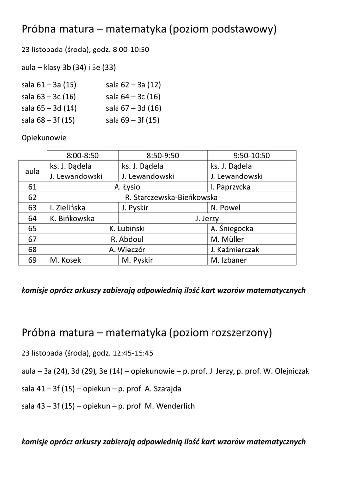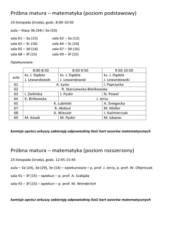 Próbna matura – matematyka (poziom podstawowy) 23 listopada (środa), godz. 8:00-10:50 aula – klasy 3b (34) i 3e (33) sala 61 – 3a (15) sala 63 – 3c (16) sala 65 – 3d (14) sala 68 – 3f (15) sala 62 – 3a (12) sala 64 – 3c (16) sala 67 – 3d (16) sala 69 – 3f (15) Opiekunowie aula 61 62 63 64 65 67 68 69 8:00-8:50 ks. J. Dądela J. Lewandowski I. Zielioska K. Biokowska M. Kosek 8:50-9:50 9:50-10:50 ks. J. Dądela ks. J. Dądela J. Lewandowski J. Lewandowski A. Łysio I. Paprzycka R. Starczewska-Bieokowska J. Pyskir N. Powel J. Jerzy K. Lubioski A. Śniegocka R. Abdoul M. Müller A. Wieczór J. Kaźmierczak M. Pyskir M. Izbaner komisje oprócz arkuszy zabierają odpowiednią ilośd kart wzorów matematycznych Próbna matura – matematyka (poziom rozszerzony) 23 listopada (środa), godz. 12:45-15:45 aula – 3a (24), 3d (29), 3e (14) – opiekunowie – p. prof. J. Jerzy, p. prof. W. Olejniczak sala 41 – 3f (15) – opiekun – p. prof. A. Szałajda sala 43 – 3f (15) – opiekun – p. prof. M. Wenderlich komisje oprócz arkuszy zabierają odpowiednią ilośd kart wzorów matematycznych