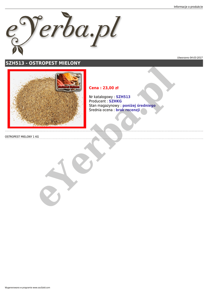 Informacje o produkcie Utworzono 04-03-2017 a. pl SZH513 - OSTROPEST MIELONY Cena : 23,00 zł eY OSTROPEST MIELONY 1 KG er b Nr katalogowy : SZH513 Producent : SZHKG Stan magazynowy : poniżej średniego Średnia ocena : brak recenzji Wygenerowano w programie www.oscGold.com