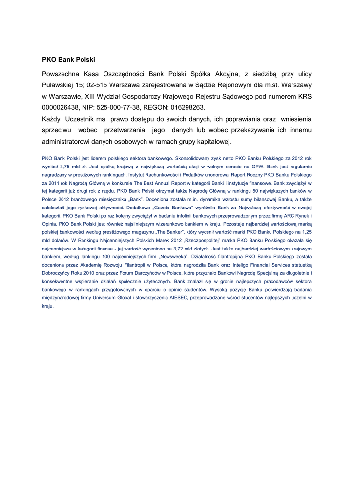PKO Bank Polski Powszechna Kasa Oszczędności Bank Polski Spółka Akcyjna, z siedzibą przy ulicy Puławskiej 15; 02-515 Warszawa zarejestrowana w Sądzie Rejonowym dla m.st. Warszawy w Warszawie, XIII Wydział Gospodarczy Krajowego Rejestru Sądowego pod numerem KRS 0000026438, NIP: 525-000-77-38, REGON: 016298263. Każdy Uczestnik ma prawo dostępu do swoich danych, ich poprawiania oraz wniesienia sprzeciwu wobec przetwarzania jego danych lub wobec przekazywania ich innemu administratorowi danych osobowych w ramach grupy kapitałowej. PKO Bank Polski jest liderem polskiego sektora bankowego. Skonsolidowany zysk netto PKO Banku Polskiego za 2012 rok wyniósł 3,75 mld zł. Jest spółką krajową z największą wartością akcji w wolnym obrocie na GPW. Bank jest regularnie nagradzany w prestiżowych rankingach. Instytut Rachunkowości i Podatków uhonorował Raport Roczny PKO Banku Polskiego za 2011 rok Nagrodą Główną w konkursie The Best Annual Report w kategorii Banki i instytucje finansowe. Bank zwyciężył w tej kategorii już drugi rok z rzędu. PKO Bank Polski otrzymał także Nagrodę Główną w rankingu 50 największych banków w Polsce 2012 branżowego miesięcznika „Bank”. Doceniona została m.in. dynamika wzrostu sumy bilansowej Banku, a także całokształt jego rynkowej aktywności. Dodatkowo „Gazeta Bankowa” wyróżniła Bank za Najwyższą efektywność w swojej kategorii. PKO Bank Polski po raz kolejny zwyciężył w badaniu infolinii bankowych przeprowadzonym przez firmę ARC Rynek i Opinia. PKO Bank Polski jest również najsilniejszym wizerunkowo bankiem w kraju. Pozostaje najbardziej wartościową marką polskiej bankowości według prestiżowego magazynu „The Banker”, który wycenił wartość marki PKO Banku Polskiego na 1,25 mld dolarów. W Rankingu Najcenniejszych Polskich Marek 2012 „Rzeczpospolitej” marka PKO Banku Polskiego okazała się najcenniejsza w kategorii finanse - jej wartość wyceniono na 3,72 mld złotych. Jest także najbardziej wartościowym krajowym bankiem, według rankingu 100 najcenniejszych firm „Newsweeka”. Działalność filantropijna PKO Banku Polskiego została doceniona przez Akademię Rozwoju Filantropii w Polsce, która nagrodziła Bank oraz Inteligo Financial Services statuetką Dobroczyńcy Roku 2010 oraz przez Forum Darczyńców w Polsce, które przyznało Bankowi Nagrodę Specjalną za długoletnie i konsekwentne wspieranie działań społecznie użytecznych. Bank znalazł się w gronie najlepszych pracodawców sektora bankowego w rankingach przygotowanych w oparciu o opinie studentów. Wysoką pozycję Banku potwierdzają badania międzynarodowej firmy Universum Global i stowarzyszenia AIESEC, przeprowadzane wśród studentów najlepszych uczelni w kraju. Biuro Informacji Kredytowej Biuro Informacji Kredytowej S.A., ul. Zygmunta Modzelewskiego 77a, 02-679 Warszawa, Numer KRS: 0000110015, Sąd Rejonowy m.st. Warszawy, XIII Wydział Gospodarczy, NIP: 951-17-78-633, REGON: 012845863. Każdy Uczestnik ma prawo dostępu do swoich danych, ich poprawiania oraz wniesienia sprzeciwu wobec przetwarzania jego danych. Biuro Informacji Kredytowej S.A. rozpoczęło działalność w 1997 roku. Powstało z inicjatywy Związku Banków Polskich oraz 23 największych banków. W tym czasie stało się liderem na rynku wymiany informacji i utrzymuje tę pozycję do dziś. Celem BIK jest minimalizowanie ryzyka kredytowego oraz zwiększenia bezpieczeństwa obrotu pieniężnego. Zadanie to BIK realizuje poprzez gromadzenie, przechowywanie i udostępnianie informacji o historii kredytowej klientów indywidualnych oraz przedsiębiorców. BIK przekazuje Bankom i SKOK-om dane w formie raportów, przedstawiających sytuację kredytową Klienta, tzn.: jego bieżące i spłacone zobowiązania wobec Banków i SKOK-ów. Raporty te wzbogacane są o informacje z baz zewnętrznych m.in.: BIG InfoMonitor oraz Systemu Dokumenty Zastrzeżone. Również Konsumenci mają możliwość weryfikacji, jakie dane na ich temat znajdują się w BIK. Obecnie w Systemach Wymiany Informacji BIK uczestniczy 650 instytucji, w tym ponad 540 Banków spółdzielczych, wszystkie SKOK-i oraz 43 Banki komercyjne. BIK utrzymuje stały kontakt z przedstawicielami środowiska bankowego m.in. ze Związkiem Banków Polskich, regulatorami tego sektora (Narodowym Bankiem Polskim, Komisją Nadzoru Bankowego, Bankowym Funduszem Gwarancyjnym), a także ośrodkami naukowymi. Współpracuje z analitykami Banku Światowego, jest także aktywnym członkiem ACCIS (Europejskiego Stowarzyszenia Biur Wymiany Informacji). W ostatnim czasie Biuro rozpoczęło wymianę informacji o kredytobiorcach ze swoim niemieckim odpowiednikiem SCHUFA Holding AG. W ramach akcji edukacyjnej, BIK organizuje konferencje, dla przedstawicieli organizacji konsumenckich. W ramach działań edukacyjnych prowadzi ścisłą współpracę z Federacją Konsumentów, Stowarzyszeniem Konsumentów Polskich, Stowarzyszeniem Krzewienia Edukacji Finansowej, Stowarzyszeniem na Rzecz bezpieczeństwa Finansowego Obywateli RP. Deloitte Deloitte Deloitte Advisory Sp. z o.o., NIP 5270207328, al. Jana Pawła II 19, 00-854 Warszawa, Numer KRS: 0000004728, Sąd Rejonowy m.st. Warszawy, XII Wydział Gospodarczy, NIP: 527-020-73-28. Każdy Uczestnik ma prawo dostępu do swoich danych, ich poprawiania oraz wniesienia sprzeciwu wobec przetwarzania jego danych lub wobec przekazywania ich innemu administratorowi danych osobowych w ramach grupy kapitałowej. Deloitte Polska to jedna z wiodących firm doradczych w kraju, świadczącą usługi profesjonalne w obszarach audytu, doradztwa podatkowego, doradztwa prawnego, konsultingu strategicznego oraz technologicznego, zarządzania ryzykiem i doradztwa finansowego. W Polsce firma Deloitte rozpoczęła swoją działalność w roku 1990. Nasze główne biuro mieści się w Warszawie, a sieć biur lokalnych obejmuje największe miasta polskie: Kraków, Gdańsk, Łódź, Wrocław, Ka