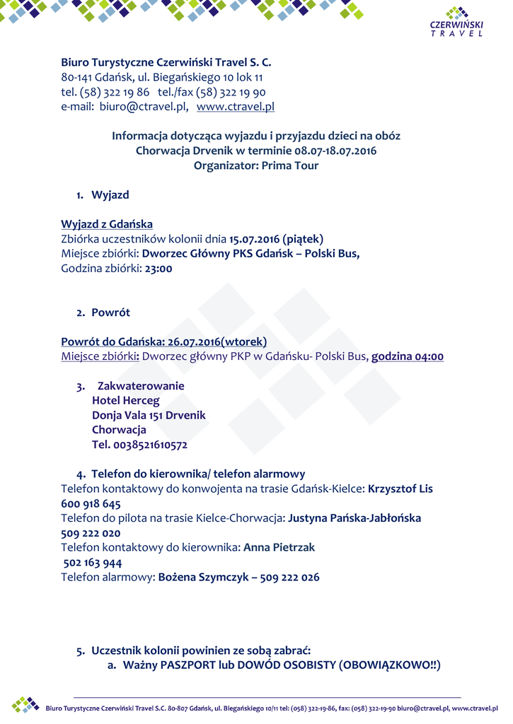 Biuro Turystyczne Czerwiński Travel S. C. 80-141 Gdańsk, ul. Biegańskiego 10 lok 11 tel. (58) 322 19 86 tel./fax (58) 322 19 90 e-mail: [email protected], www.ctravel.pl Informacja dotycząca wyjazdu i przyjazdu dzieci na obóz Chorwacja Drvenik w terminie 08.07-18.07.2016 Organizator: Prima Tour 1. Wyjazd Wyjazd z Gdańska Zbiórka uczestników kolonii dnia 15.07.2016 (piątek) Miejsce zbiórki: Dworzec Główny PKS Gdańsk – Polski Bus, Godzina zbiórki: 23:00 2. Powrót Powrót do Gdańska: 26.07.2016(wtorek) Miejsce zbiórki: Dworzec główny PKP w Gdańsku- Polski Bus, godzina 04:00 3. Zakwaterowanie Hotel Herceg Donja Vala 151 Drvenik Chorwacja Tel. 0038521610572 4. Telefon do kierownika/ telefon alarmowy Telefon kontaktowy do konwojenta na trasie Gdańsk-Kielce: Krzysztof Lis 600 918 645 Telefon do pilota na trasie Kielce-Chorwacja: Justyna Pańska-Jabłońska 509 222 020 Telefon kontaktowy do kierownika: Anna Pietrzak 502 163 944 Telefon alarmowy: Bożena Szymczyk – 509 222 026 5. Uczestnik kolonii powinien ze sobą zabrać: a. Ważny PASZPORT lub DOWÓD OSOBISTY (OBOWIĄZKOWO!!) b. Ważną legitymację szkolną (OBOWIĄZKOWO!!) – będzie zbierana podczas zbiórki c. strój kąpielowy, ręcznik kąpielowy – 2 szt, ręcznik do twarzy d. obowiązkową taksę klimatyczną 10 euro/os. kaucję zwrotną 15 Euro/os. e. Sugerowane kieszonkowe: 100 € f. przybory toaletowe jak. mydło, pastę do zębów, żel pod prysznic itp. g. ubranie „na każdą porę roku”, w tym: - ubranie przeciwdeszczowe, - czapkę z daszkiem lub inne nakrycie chroniące głowę przed słońcem, - ciepły sweter lub polar, - wygodne buty, klapki lub inne obuwie do chodzenia po pensjonacie (obuwie zmienne), - dres lub inną odzież sportową h. krem z filtrem UV, i. środek przeciwko kleszczom i komarom, j. aviomarin w przypadku choroby lokomocyjnej, k. dobry humor i pomysły 6. Biuro nie odpowiada przedmioty wartościowe fotograficzne, telefony komórkowe, ipody np. aparaty Jeżeli dziecko powinno otrzymywać leki podczas wyjazdu, a informacja ta nie została zapisana w karcie kolonijnej prosimy przygotować informację (imię i nazwisko dziecka, jakie leki powinno przyjmować oraz jak często) i przekazać ją wraz z lekami na zbiórce kierownikowi kolonii lub pracownikowi biura. Prosimy również o przygotowanie przez Państwa pisemnej zgody, na podawanie dziecku leków przez kierownika obecnego na wyjeździe. Jeżeli mają Państwo jakieś uwagi odnośnie dziecka (stanu zdrowia, zachowania itp.), które mogłyby być istotne dla wychowawców, a nie zostały zapisane w karcie kolonijnej prosimy o spisanie wszelkich niezbędnych informacji oraz przekazanie ich na zbiórce kierownikowi kolonii lub pracownikowi biura. ŻYCZYMY UDANEGO WYJAZDU !!!