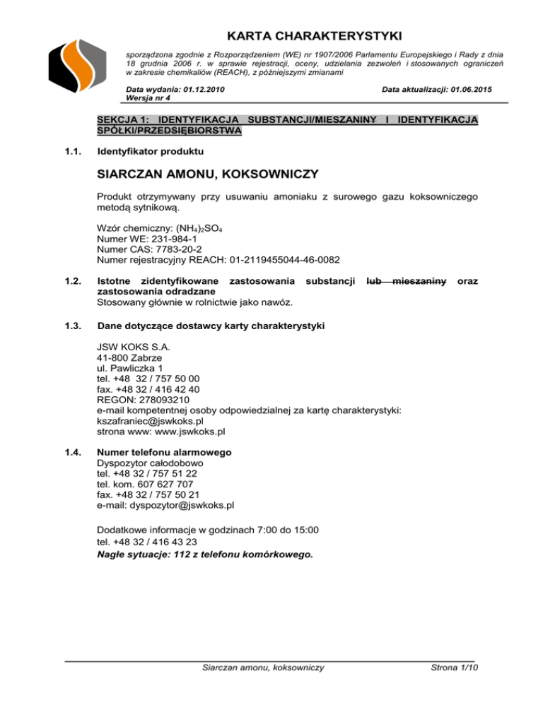 KARTA CHARAKTERYSTYKI sporządzona zgodnie z Rozporządzeniem (WE) nr 1907/2006 Parlamentu Europejskiego i Rady z dnia 18 grudnia 2006 r. w sprawie rejestracji, oceny, udzielania zezwoleń i stosowanych ograniczeń w zakresie chemikaliów (REACH), z późniejszymi zmianami Data wydania: 01.12.2010 Wersja nr 4 Data aktualizacji: 01.06.2015 SEKCJA 1: IDENTYFIKACJA SUBSTANCJI/MIESZANINY I IDENTYFIKACJA SPÓŁKI/PRZEDSIĘBIORSTWA 1.1. Identyfikator produktu SIARCZAN AMONU, KOKSOWNICZY Produkt otrzymywany przy usuwaniu amoniaku z surowego gazu koksowniczego metodą sytnikową. Wzór chemiczny: (NH4)2SO4 Numer WE: 231-984-1 Numer CAS: 7783-20-2 Numer rejestracyjny REACH: 01-2119455044-46-0082 1.2. Istotne zidentyfikowane zastosowania zastosowania odradzane Stosowany głównie w rolnictwie jako nawóz. substancji 1.3. Dane dotyczące dostawcy karty charakterystyki lub mieszaniny oraz JSW KOKS S.A. 41-800 Zabrze ul. Pawliczka 1 tel. +48 32 / 757 50 00 fax. +48 32 / 416 42 40 REGON: 278093210 e-mail kompetentnej osoby odpowiedzialnej za kartę charakterystyki: [email protected] strona www: www.jswkoks.pl 1.4. Numer telefonu alarmowego Dyspozytor całodobowo tel. +48 32 / 757 51 22 tel. kom. 607 627 707 fax. +48 32 / 757 50 21 e-mail: [email protected] Dodatkowe informacje w godzinach 7:00 do 15:00 tel. +48 32 / 416 43 23 Nagłe sytuacje: 112 z telefonu komórkowego. Siarczan amonu, koksowniczy Strona 1/10 KARTA CHARAKTERYSTYKI sporządzona zgodnie z Rozporządzeniem (WE) nr 1907/2006 Parlamentu Europejskiego i Rady z dnia 18 grudnia 2006 r. w sprawie rejestracji, oceny, udzielania zezwoleń i stosowanych ograniczeń w zakresie chemikaliów (REACH), z późniejszymi zmianami Data wydania: 01.12.2010 Wersja nr 4 Data aktualizacji: 01.06.2015 SEKCJA 2: IDENTYFIKACJA ZAGROŻEŃ 2.1 Klasyfikacja substancji lub mieszaniny Siarczan amonu może powodować niewielkie miejscowe podrażnienia skóry zwłaszcza przy kontakcie w miejscach skaleczonych. Pył może wywołać podrażnienie oczu i dróg oddechowych. Substancja nie stanowi zagrożenia dla środowiska w warunkach stosowania. W bardzo dużych stężeniach może występować przemijające zagrożenie dla wód gruntowych. 2.2 Elementy oznakowania Siarczan amonu nie jest substancją niebezpieczną, nie wymaga oznakowania zgodnie z obowiązującymi przepisami Rozporządzenia (WE) NR 1272/2008. 2.3 Inne zagrożenia Siarczan amonu jest substancją nieorganiczną, w związku z czym ocena czy substancja należy do kategorii PBT i vPvB nie jest wymagana. Nie stanowi zagrożenia dla zdrowia i środowiska. SEKCJA 3: SKŁAD/INFORMACJA O SKŁADNIKACH 3.1 Substancje Produkt otrzymywany w procesie sytnikowym zawiera do 99 % siarczanu amonu. Zawiera śladowe ilości substancji organicznej oraz drobne zanieczyszczenia innymi solami. SEKCJA 4: ŚRODKI PIERWSZEJ POMOCY 4.1. Opis środków pierwszej pomocy 4.1.1 Wytyczne dotyczące pierwszej pomocy wg dróg narażenia Kontakt z oczami Przemyć oko dużą ilością czystej wody trzymając otwarte powieki. W razie konieczności zapewnić pomoc lekarską. Kontakt ze skórą Umyć dobrze wodą z mydłem, zdezynfekować ewentualne drobne otarcia lub skaleczenia. Jeśli podrażnienie nie ustępuje skontaktować się z lekarzem. Drogi pokarmowe Możliwość pomyłkowego spożycia w większych ilościach mało prawdopodobna. W wypadku przedostania się pewnych ilości do układu pokarmowego przepłukać usta chłodną wodą. Podać do wypicia mleko oraz wodę z roztrzepanymi białkami jaj kurzych. Spowodować wymioty. Przepłukać żołądek 5% roztworem wodorowęglanu sodowego. W przypadkach szczególnych skontaktować się z lekarzem. Siarczan amonu, koksowniczy Strona 2/10 KARTA CHARAKTERYSTYKI sporządzona zgodnie z Rozporządzeniem (WE) nr 1907/2006 Parlamentu Europejskiego i Rady z dnia 18 grudnia 2006 r. w sprawie rejestracji, oceny, udzielania zezwoleń i stosowanych ograniczeń w zakresie chemikaliów (REACH), z późniejszymi zmianami Data wydania: 01.12.2010 Wersja nr 4 Drogi oddechowe Data aktualizacji: 01.06.2015 Zapewnić dostęp świeżego powietrza, w przypadkach szczególnych skontaktować się z lekarzem. 4.2 Najważniejsze ostre i opóźnione objawy oraz skutki narażenia Brak dostępnych danych 4.3 Wskazania dotyczące wszelkiej natychmiastowej i szczególnego postępowania z poszkodowanym Brak dostępnych danych pomocy lekarskiej SEKCJA 5: POSTĘPOWANIE W PRZYPADKU POŻARU Produkt niepalny, niepowodujący zagrożenia pożarowego. 5.1. Środki gaśnicze Stosować środki gaśnicze w bezpośrednim sąsiedztwie. odpowiednie do materiałów magazynowanych 5.2. Szczególne zagrożenia związane z substancją Produkt niepalny. Pożar występujący w otoczeniu magazynowanego siarczanu amonu może spowodować powstanie tlenków azotu i siarki oraz w szczególnych przypadkach amoniaku, który może potęgować pożar. W strefie pożaru stosować aparaty izolujące drogi oddechowe. 5.3 Informacje dla straży pożarnej Brak danych SEKCJA 6: POSTĘPOWANIE UWOLNIENIA DO ŚRODOWISKA W PRZYPADKU NIEZAMIERZONEGO 6.1. Indywidualne środki ostrożności, sprzęt ochronny i procedury w sytuacjach awaryjnych Produkt niepowodujący powstania zagrożenia, z terenu sytuacji awaryjnej oddalić wszystkie osoby postronne. Stosować standardowe zabezpieczenia, ubrania robocze, rękawice, okulary lub ochrony twarzy. 6.2. Środki ostrożności w zakresie ochrony środowiska Zapobiegać tworzeniu się pyłów. W razie potrzeby sypać wokół rozlewiska obwałowania. W przypadku zanieczyszczenia wód powiadomić odpowiednie władze. 6.3. Metody i materiały zapobiegające rozprzestrzenianiu się skażenia i służące do usuwania skażenia Zebrać mechanicznie i w miarę możliwości zawrócić do pełnowartościowego materiału. W przypadku zanieczyszczenia lub zawilgocenia uniemożliwiającego ponowne użycie przeznaczyć do ponownego przerobu u producenta lub usunąć w miejsce gdzie możliwe będzie bezpieczne składowanie. Siarczan