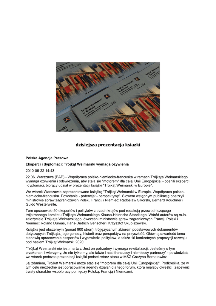 We wtorek Warszawie zaprezentowano ksiąŜkę "Trójkąt Weimarski w Europie. Współpraca polskoniemiecko-francuska. Powstanie - potencjał - perspektywy". Słowem wstępnym publikację opatrzyli