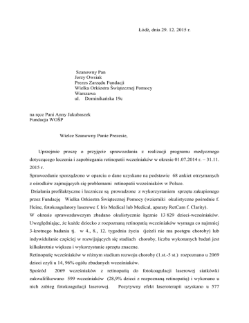 Łódź, dnia 29. 12. 2015 r. Szanowny Pan Jerzy Owsiak Prezes Zarządu Fundacji Wielka Orkiestra Świątecznej Pomocy Warszawa ul. Dominikańska 19c na ręce Pani Anny Jakubaszek Fundacja WOŚP Wielce Szanowny Panie Prezesie, Uprzejmie proszę o przyjęcie sprawozdania z realizacji programu medycznego dotyczącego leczenia i zapobiegania retinopatii wcześniaków w okresie 01.07.2014 r. – 31.11. 2015 r. Sprawozdanie sporządzono w oparciu o dane uzyskane na podstawie 68 ankiet otrzymanych z ośrodków zajmujących się problemami retinopatii wcześniaków w Polsce. Działania profilaktyczne i lecznicze są prowadzone z wykorzystaniem sprzętu zakupionego przez Fundację Wielka Orkiestra Świątecznej Pomocy (wzierniki okulistyczne pośrednie f. Heine, fotokoagulatory laserowe f. Iris Medical lub Medical, aparaty RetCam f. Clarity). W okresie sprawozdawczym zbadano okulistycznie łącznie 13 829 dzieci-wcześniaków. Uwzględniając, że każde dziecko z rozpoznaną retinopatią wcześniaków wymaga co najmniej 3-krotnego badania tj. w 4., 8., 12. tygodniu życia (jeżeli nie ma postępu choroby) lub indywidulanie częściej w rozwijających się stadiach choroby, liczba wykonanych badań jest kilkakrotnie większa i wykorzystanie sprzętu znaczne. Retinopatię wcześniaków w różnym stadium rozwoju choroby (1.st.-5 st.) rozpoznano u 2069 dzieci czyli u 14, 96% ogółu zbadanych wcześniaków. Spośród 2069 wcześniaków z retinopatią do fotokoagulacji laserowej siatkówki zakwalifikowano 599 wcześniaków (28,9% dzieci z rozpoznaną retinopatią) i wykonano u nich zabieg fotokoagulacji laserowej. Pozytywny efekt laseroterapii uzyskano u 577 leczonych wcześniaków, czyli u 96,3% poddanych tej terapii. Inaczej mówiąc tej grupie -577 dzieciom - uratowano wzrok, umożliwiając im dalszy prawidłowy rozwój psychofizyczny. Na podstawie danych ankietowych w 2015 roku, najliczniejsza grupa dzieci była zbadana (w kolejności alfabetycznej) w ośrodkach w: Lublinie -2856, Poznaniu -450, Tarnowie -467, Warszawie (IMID) -722 Warszawie (IPCZD) - 500, Wrocławiu (Ośrodek Retinopatii Wcześniaków) -1772. Najwięcej zabiegów fotokoagulacji laserowej siatkówki wykonano w ośrodkach (wg kolejności alfabetycznej): Katowice (Klinika Neonatologii)- 37, Kraków-30, Poznań (Klinika Neonatologii)- 45, Szczecin (PUM) – 49, Wałbrzych – 44, Warszawa (IPCZD) -72, Wrocław (Ośrodek Retinopatii Wcześniaków)- 131. Łącznie od początku prowadzenia programu do końca 2015 r. zbadano okulistycznie 193094 dzieci przedwcześnie urodzonych, korzystając ze sprzętu zakupionego przez Fundację WOŚP. Retinopatię w stadium kwalifikującym do laseroterapii siatkówki rozpoznano i wykonano zabieg u 7949 niemowląt, za pomocą laserów otrzymanych od Fundacji WOŚP. Zabieg był skuteczny u 7609 (95,7%) dzieci poddanych laseroterapii, czyli tej grupie dzieci uratowano wzrok w okresie realizacji programu. Wieloletnia, bezinteresowna pomoc świadczona przez WOŚP na rzecz dzieci z retinopatią, przynosi trwałe rezultaty zdrowotne u diagnozowanych i leczonych dzieci, ale także znacznie podnosi poziom świadczonych usług medycznych, dzięki darowanej, wysokiej jakości, aparaturze medycznej. Zrozumienie Fundacji dla potrzeb dzieci z retinopatią wcześniaków, która jest główną przyczyną ślepoty u najmłodszych pacjentów, budzi niezmiennie szacunek i uczucie wdzięczności. Pozostaję w przekonaniu, że Fundacja Wielka Orkiestra Świątecznej Pomocy zechce nadal pomagać dzieciom-wcześniakom z chorobami narządu wzroku i służyć pomocą sprzętową umożliwiając działalność ośrodków zajmujących się retinopatią wcześniaków. Dzięki wsparciu prowadzonej przez Pana Prezesa Fundacji rozwinęła się i utrzymuje wysokie standardy opieka okulistyczna nad dzieckiem z retinopatią wcześniaków. Łączę wyrazy głębokiego szacunku i serdecznie pozdrawiam prof. dr hab. n. med. Mirosława Grałek