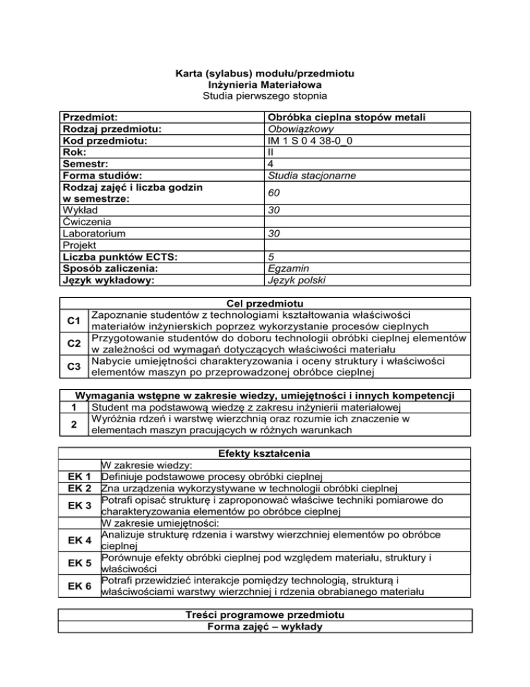 Karta (sylabus) modułu/przedmiotu Inżynieria Materiałowa Studia pierwszego stopnia Przedmiot: Rodzaj przedmiotu: Kod przedmiotu: Rok: Semestr: Forma studiów: Rodzaj zajęć i liczba godzin w semestrze: Wykład Ćwiczenia Laboratorium Projekt Liczba punktów ECTS: Sposób zaliczenia: Język wykładowy: C1 C2 C3 Obróbka cieplna stopów metali Obowiązkowy IM 1 S 0 4 38-0_0 II 4 Studia stacjonarne 60 30 30 5 Egzamin Język polski Cel przedmiotu Zapoznanie studentów z technologiami kształtowania właściwości materiałów inżynierskich poprzez wykorzystanie procesów cieplnych Przygotowanie studentów do doboru technologii obróbki cieplnej elementów w zależności od wymagań dotyczących właściwości materiału Nabycie umiejętności charakteryzowania i oceny struktury i właściwości elementów maszyn po przeprowadzonej obróbce cieplnej Wymagania wstępne w zakresie wiedzy, umiejętności i innych kompetencji 1 Student ma podstawową wiedzę z zakresu inżynierii materiałowej Wyróżnia rdzeń i warstwę wierzchnią oraz rozumie ich znaczenie w 2 elementach maszyn pracujących w różnych warunkach EK 1 EK 2 EK 3 EK 4 EK 5 EK 6 Efekty kształcenia W zakresie wiedzy: Definiuje podstawowe procesy obróbki cieplnej Zna urządzenia wykorzystywane w technologii obróbki cieplnej Potrafi opisać strukturę i zaproponować właściwe techniki pomiarowe do charakteryzowania elementów po obróbce cieplnej W zakresie umiejętności: Analizuje strukturę rdzenia i warstwy wierzchniej elementów po obróbce cieplnej Porównuje efekty obróbki cieplnej pod względem materiału, struktury i właściwości Potrafi przewidzieć interakcje pomiędzy technologią, strukturą i właściwościami warstwy wierzchniej i rdzenia obrabianego materiału Treści programowe przedmiotu Forma zajęć – wykłady W1 W2 W3 W4 W5 W6 L1 L2 L3 L4 L5 L6 1 2 Treści programowe Teoretyczne podstawy obróbki cieplnej Hartowanie, hartowanie powierzchniowe i odpuszczanie stali Obróbka cieplna żeliwa i innych stopów Obróbka cieplno-chemiczna elementów maszyn Zjawiska związane z oddziaływaniem wysokiej temperatury na elementy stalowe. Urządzenia przemysłowe wykorzystywane przy obróbce cieplnej Zagrożenia dla środowiska naturalnego występujące w związku z obróbką cieplną elementów Forma zajęć – laboratoria Treści programowe Hartowanie i badanie hartowności stali Odpuszczanie i wyżarzanie stali Obróbka cieplno-chemiczna stali Projektowanie i modelowanie procesów obróbki cieplnej Struktury i właściwości stali po obróbce cieplnej i cieplno-chemicznej Wady powstające w wyniku obróbki cieplnej Metody dydaktyczne Wykład z prezentacjami multimedialnymi Ćwiczenia laboratoryjne – wykonywanie doświadczeń - metoda praktyczna oparta na obserwacji i analizie Obciążenie pracą studenta Średnia liczba godzin na zrealizowanie Forma aktywności aktywności Godziny kontaktowe z wykładowcą, 65 w tym: udział w wykładach 30 udział w laboratoriach 30 konsultacje 5 Praca własna studenta, w tym: 60 przygotowanie do laboratorium 20 przygotowanie do egzaminu 40 Łączny czas pracy studenta 125 Sumaryczna liczba punktów ECTS dla 5 przedmiotu: Liczba punktów ECTS w ramach zajęć o charakterze praktycznym (ćwiczenia, 2 laboratoria, projekty) 1 2 3 Literatura podstawowa Dobrzański L.A.: Metalowe materiały inżynierskie. WNT, Warszawa 2004 Pełczyński T.: Obróbka cieplno-chemiczna metali i półprzewodników. Wyd. PL, Lublin 2000 Błaszczyński J., Stupnicka H., Weroński A.: Procesy technologiczne podwyższające trwałość elementów maszyn, urządzeń i pojazdów. Wyd. PL, Lublin 1995 1 2 Literatura uzupełniająca Krajczyk A.: Podręczny atlas mikrostruktur metali i stopów. Wyd. Politechniki Wrocławskiej, Wrocław 2005 Kubiński W., Materiałoznawstwo. T. 2, Wyd. AGH 2011 Macierz efektów kształcenia Odniesienie danego efektu kształcenia do Efekt efektów kształcenia zdefiniowanych dla całego programu (PEK) IM1A_W07 (+) IM1A_W08 (+) EK1 IM1A_W10 (+) IM1A_W11 (+) EK2 IM1A_W11 (+) IM1A_W08 (+) IM1A_W11 (+) EK3 IM1A_W14 (+ +) IM1A_U21 (+) EK4 IM1A_U25 (++) IM1A_U09 (+) EK5 IM1A_U11 (+) IM1A_U09 (++) IM1A_U11 (+) EK6 IM1A_U14 (++) IM1A_U16 (+) IM1A_U21 (+) Cele przedmiotu Treści programowe Metody dydaktyczne Metody oceny C1 W1 – W6 1,2 O3 C2 W5, W6 1, 2 O3 C2 W1 – W5 1, 2 O3 C3 L1 – L3, L5, L6 2 O1 - O3 C3 L5, L6 2 O1 - O3 C3 L4 – L6 2 O1 - O3 Metody i kryteria oceny Symbol metody oceny O1 O2 O3 Opis metody oceny Ocena teoretycznego przygotowania do zajęć laboratoryjnych Sprawozdania z wykonanych doświadczeń laboratoryjnych Egzamin Autor Kazimierz Drozd programu: Adres e-mail: [email protected] Jednostka Katedra Inżynierii Materiałowej organizacyjna: Próg zaliczeniowy 50% 80% 50%