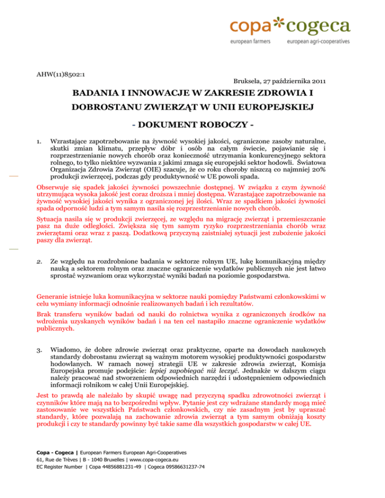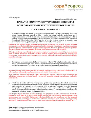 AHW(11)8502:1 Bruksela, 27 października 2011 BADANIA I INNOWACJE W ZAKRESIE ZDROWIA I DOBROSTANU ZWIERZĄT W UNII EUROPEJSKIEJ - DOKUMENT ROBOCZY 1. Wzrastające zapotrzebowanie na żywność wysokiej jakości, ograniczone zasoby naturalne, skutki zmian klimatu, przepływ dóbr i osób na całym świecie, pojawianie się i rozprzestrzenianie nowych chorób oraz konieczność utrzymania konkurencyjnego sektora rolnego, to tylko niektóre wyzwania z jakimi zmaga się europejski sektor hodowli. Światowa Organizacja Zdrowia Zwierząt (OIE) szacuje, że co roku choroby niszczą co najmniej 20% produkcji zwierzęcej, podczas gdy produktywność w UE powoli spada. Obserwuje się spadek jakości żywności powszechnie dostępnej. W związku z czym żywność utrzymująca wysoka jakość jest coraz droższa i mniej dostępna. Wzrastające zapotrzebowanie na żywność wysokiej jakości wynika z ograniczonej jej ilości. Wraz ze spadkiem jakości żywności spada odporność ludzi a tym samym nasila się rozprzestrzenianie nowych chorób. Sytuacja nasila się w produkcji zwierzęcej, ze względu na migrację zwierząt i przemieszczanie pasz na duże odległości. Zwiększa się tym samym ryzyko rozprzestrzeniania chorób wraz zwierzętami oraz wraz z paszą. Dodatkową przyczyną zaistniałej sytuacji jest zubożenie jakości paszy dla zwierząt. 2. Ze względu na rozdrobnione badania w sektorze rolnym UE, lukę komunikacyjną między nauką a sektorem rolnym oraz znaczne ograniczenie wydatków publicznych nie jest łatwo sprostać wyzwaniom oraz wykorzystać wyniki badań na poziomie gospodarstwa. Generanie istnieje luka komunikacyjna w sektorze nauki pomiędzy Państwami członkowskimi w celu wymiany informacji odnośnie realizowanych badań i ich rezultatów. Brak transferu wyników badań od nauki do rolnictwa wynika z ograniczonych środków na wdrożenia uzyskanych wyników badań i na ten cel nastapiło znaczne ograniczenie wydatków publicznych. 3. Wiadomo, że dobre zdrowie zwierząt oraz praktyczne, oparte na dowodach naukowych standardy dobrostanu zwierząt są ważnym motorem wysokiej produktywności gospodarstw hodowlanych. W ramach nowej strategii UE w zakresie zdrowia zwierząt, Komisja Europejska promuje podejście: lepiej zapobiegać niż leczyć. Jednakże w dalszym ciągu należy pracować nad stworzeniem odpowiednich narzędzi i udostępnieniem odpowiednich informacji rolnikom w całej Unii Europejskiej. Jest to prawdą ale należało by skupić uwagę nad przyczyną spadku zdrowotności zwierząt i czynników które mają na to bezpośredni wpływ. Pytanie jest czy wdrażane standardy mogą mieć zastosowanie we wszystkich Państwach członkowskich, czy nie zasadnym jest by upraszać standardy, które pozwalają na zachowanie zdrowia zwierząt a tym samym obniżają koszty produkcji i czy te standardy powinny być takie same dla wszystkich gospodarstw w całej UE. Copa - Cogeca | European Farmers European Agri-Cooperatives 61, Rue de Trèves | B - 1040 Bruxelles | www.copa-cogeca.eu EC Register Number | Copa 44856881231-49 | Cogeca 09586631237-74 Działania prewencyjne powinny być rozpatrywane na poziomie poszczególnych Państw w zależności od specyfiki regionu. Odpowiednie narzędzia powinny być tworzone dla szerokiej gamy systemów zwierząt, dla wszystkich państw członkowskich UE 4. Utrzymanie dobrych warunków zdrowia i dobrostanu zwierząt w Europie leży w interesie całego społeczeństwa. Należy położyć większy nacisk na badania i innowacje mające na celu poprawę zdrowia i dobrostanu zwierząt na poziomie UE w ramach 7. Ramowego Programu Badań (FP7- KBBE Biogospodarka oparta na wiedzy) lecz również na poziomie państw członkowskich. Nowe wieloletnie ramy finansowe na lata 2014-2020 zawierają nową linię budżetową w wysokości €4,5 miliarda na biogospodarkę, badania i innowacje w rolnictwie objęte przyszłymi badawczymi programami ramowymi HORIZON 2020. Jest oczywiste, że Konsumenci chcą wiedzieć, że zwierzęta, z wyjątkiem ich uboju do celów konsumpcyjnych, były dobrze traktowane oraz są wolne od chorób. Jednak kwestie dobrostanu zwierząt są bardzo subiektywne w całej UE. W wielu przypadkach poprawa dobrostanu poprawi zdrowie, ale jeżeli zwierzęta w środowisku, są zdrowe, nie wykazują oznak stresu i utrzymują prawidłowe funkcje biologiczne, musimy jeszcze poprawić warunki opieki … . Musimy pamiętać, by znaleźć równowagę, gdyż nadmierna infrastruktura obsługi produkcji podnosi koszty produkcji oraz obniża konkurencyjność rolników na rynku. Niektóre grupy społeczeństwa, chcą zhumanizować produkcję zwierzęcą. Dlatego należy zadać sobie pytanie: Jak daleko trzeba iść ze standardami? Czy inicjatywa jest wyszła od rolników w konsultacji z konsumentami, czy też strona trzecia podniosła tę kwestię? 5. Stały Komitet ds. Badań Naukowych w Dziedzinie Rolnictwa (SCAR) odgrywa ważną rolę pomagając Komisji i państwom członkowskim w lepszej koordynacji badań w europejskiej społeczności naukowej. Komitet ten reprezentujący wszystkie państwa członkowskie oraz 10 państw nie należących do UE ma ogromne znaczenie w dalszym wzmacnianiu badań w gospodarstwach hodowlanych. 6. W 2004 roku powstała Europejska Platforma Technologiczna na rzecz ogólnego zdrowia zwierząt (ETPGAH), której celem jest udostępnienie mechanizmów ustanawiających priorytety badań, mających na celu stworzenie nowych, lepszych narzędzi, jak na przykład szczepionek weterynaryjnych i badań diagnostycznych. ETPGAH jest inicjatywą zainteresowanych stron, która powstała w ramach 6. Ramowego Programu Badań (FP6) Komisji Europejskiej.1 Copa-Cogeca jest jej aktywnym członkiem. ETPGAH pełni ważną funkcję w przekazywaniu priorytetów badawczych darczyńcom (np. Komisji Europejskiej, rządom narodowym). Jednym z przykładów inicjatywy poprowadzonej przez ETPGAH było stworzenie Europejskiej Przestrzeni Badawczej (E