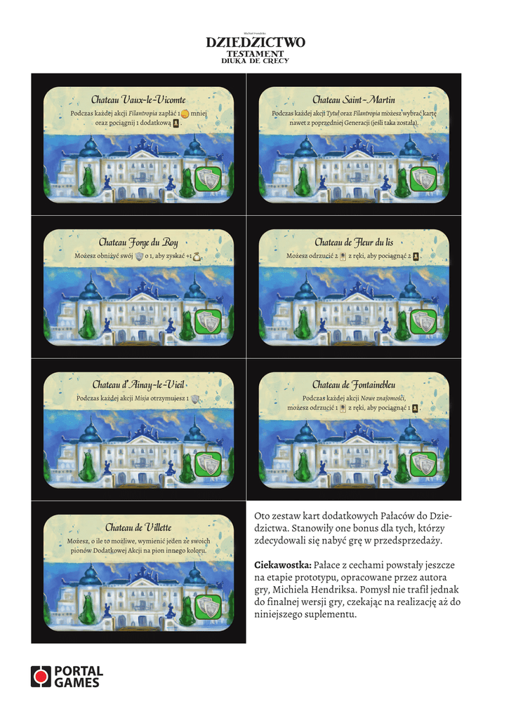 Chateau Vaux-le-Vicomte Podczas każdej akcji Filantropia zapłać 1 oraz pociągnij 1 dodatkową . Chateau Saint-Martin mniej Chateau Forge du Roy Możesz obniżyć swój Chateau de Fleur du lis o 1, aby zyskać +1 . Chateau d’Ainay-le-Vieil Podczas każdej akcji Misja otrzymujesz 1 Podczas każdej akcji Tytuł oraz Filantropia możesz wybrać kartę nawet z poprzedniej Generacji (jeśli taka została). Możesz odrzucić 2 z ręki, aby pociągnąć 2 . Chateau de Fontainebleu . Chateau de Villette Możesz, o ile to możliwe, wymienić jeden ze swoich pionów Dodatkowej Akcji na pion innego koloru. Podczas każdej akcji Nowe znajomości, możesz odrzucić 1 z ręki, aby pociągnąć 1 . Oto zestaw kart dodatkowych Pałaców do Dziedzictwa. Stanowiły one bonus dla tych, którzy zdecydowali się nabyć grę w przedsprzedaży. Ciekawostka: Pałace z cechami powstały jeszcze na etapie prototypu, opracowane przez autora gry, Michiela Hendriksa. Pomysł nie trafił jednak do finalnej wersji gry, czekając na realizację aż do niniejszego suplementu. Obecnie karty są dostępne w niniejszym pliku pdf do wydrukowania. Możesz też zakupić ich zestaw naszym portalowym sklepiku. JAK UŻYWAĆ DODATKOWYCH PAŁACY? Dodatkowe Pałace mogą zastapić karty Pałaców z podstawowej wersji gry. Każdy dodatkowy Pałac nie tylko zwiększa Prestiż gracza, ale dodatkowo ma także swój unikalny efekt. Jesli nie napisano inaczej, unikalny efekt Pałacu rozpatruje się jednorazowo, w momencie wykonania akcji Pałac. WARIANT: POCZĄTKOWE PAŁACE Każdy gracz rozpoczyna grę z jednym z dodatkowych Pałaców spośród następujących: Chateau de Fontainebleu, Chateau de Vaux-le-Vicomte, Chateau de Saint-Martin, Chateau de d’Ainay-le-Veil. Począwszy od ostatniego gracza i kontynuując w kierunku przeciwnym do ruchu wskazówek zegara, każdy gracz wybiera jeden z wymienionych Pałaców. To jego startowa siedziba: nie zwiększa ona Prestiżu, jednak jej unikalny efekt jest aktywny od początku gry. Karta Pałacu nie jest przydzielana żadnemu członkowi rodziny, kładzie się ją obok rodziny. Odwiedź naszą stronę i odkryj inne mini-dodatki do gier Portal Games.