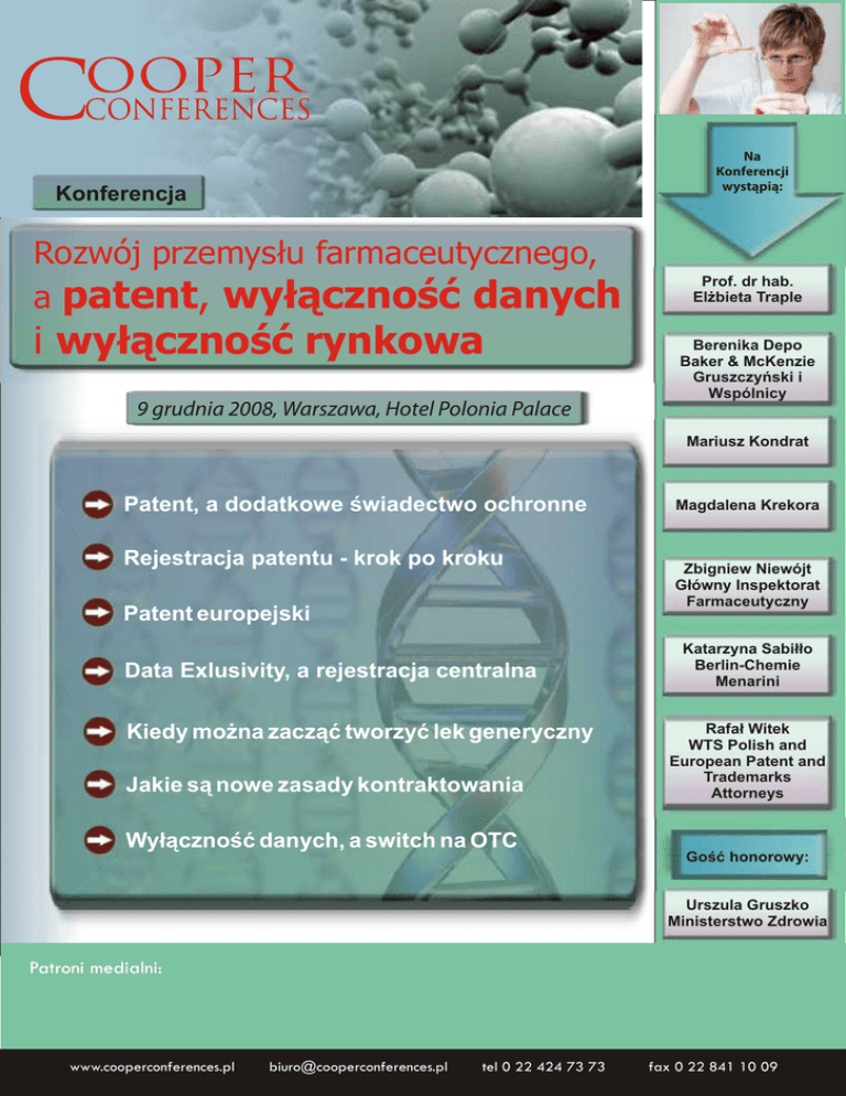 Na Konferencji wystąpią: Konferencja Rozwój przemysłu farmaceutycznego, a patent, wyłączność danych i wyłączność rynkowa 9 grudnia 2008, Warszawa, Hotel Polonia Palace Prof. dr hab. Elżbieta Traple Berenika Depo Baker & McKenzie Gruszczyński i Wspólnicy Mariusz Kondrat Patent, a dodatkowe świadectwo ochronne Rejestracja patentu - krok po kroku Patent europejski Data Exlusivity, a rejestracja centralna Kiedy można zacząć tworzyć lek generyczny Jakie są nowe zasady kontraktowania Wyłączność danych, a switch na OTC Magdalena Krekora Zbigniew Niewójt Główny Inspektorat Farmaceutyczny Katarzyna Sabiłło Berlin-Chemie Menarini Rafał Witek WTS Polish and European Patent and Trademarks Attorneys Gość honorowy: Urszula Gruszko Ministerstwo Zdrowia www.cooperconferences.pl [email protected] tel 0 22 424 73 73 fax 0 22 841 10 09 Rozwój przemysłu farmaceutycznego, a patent, wyłączność danych i wyłączność rynkowa Berenika Depo - Rzecznik Patentowy, Baker & McKenzie Gruszczyński i Wspólnicy Specjalista w zakresie znaków towarowych, nieuczciwej konkurencji i postępowania o ochronę własności przemysłowej. Zajmuje się również wspólnotowym prawem własności przemysłowej. Jest członkiem Polskiej Izby Rzeczników Patentowych oraz jest wpisana na listę rzeczników patentowych europejskich (EPI) i na listę zawodowych pełnomocników Urzędu Harmonizacji Rynku Wewnętrznego w Alicante. W kadencji 2005- 2009 jest Sekretarzem Krajowej Rady Rzeczników Patentowych i członkiem Prezydium. Dr Mariusz Kondrat - KONDRAT Kancelaria Prawno - Patentowa Wcześniej związany z UKIE, gdzie zajmował się m.in. wspólnotowym prawem farmaceutycznym. Od ponad 7 lat czynnie zaangażowany w tworzenie i interpretowanie polskiego prawa farmaceutycznego i prawa własności przemysłowej. Magdalena Krekora - Doktor Nauk Prawnych Swoją pracę doktorską pt. "Gwarancje ochrony własności intelektualnej w procedurze dopuszczania do obrotu produktów leczniczych w Polsce na tle prawnoporównawcznym" obroniła na Uniwersytecie Jagiellońskim w 2005 roku. Jest rzecznikiem patentowym od 1999 roku, Europejskim Rzecznikiem Patentowym od 2005 roku oraz pełnomocnikiem przed Urzędem ds. Harmonizacji Rynku Wewnętrznego od 2004 roku, jednakże własnością przemysłową zajmuje się od 1996 roku. W 1999 roku Magdalena Krekora odbyła staż w Komisji Europejskiej w Brukseli, a w 2000 roku brała udział jako ekspert rządowy w przygotowaniu projektu ustawy - Prawo farmaceutyczne, uchwalonego 6 września 2001 roku i obowiązującego do dziś. Jest autorką licznych publikacji dotyczących prawa własności przemysłowej oraz prawa farmaceutycznego, w tym komentarza do prawa farmaceutycznego i książki "Contract Manufacturing of Medicines" wydanej przez Wolters Kluwer Netherlands i sprzedawanej na całym świecie. Prowadziła także wiele szkoleń w tym zakresie nie tylko w języku polskim, ale i w angielskim. Katarzyna Sabiłło - Dyrektor ds. Rejestracji i Regulacji Prawnych, Berlin-Chemie/ Menarini Polska Sp. z o.o. Wykształcenie farmaceutyczne (Wydział Farmacji Akademii Medycznej w Warszawie). Absolwentka podyplomowych studiów w zakresie zarządzania (MBA Uniwersytet w Łodzi/Universite Lyon III, Francja) oraz prestiżowego kursu "European Regulatory Affairs Course" prowadzonego pod auspicjami EMEA. Reprezentant Stowarzyszenia Przedstawicieli Firm Farmaceutycznych w Polsce (obecnie ZP INFARMA) w pracach parlamentarnych nad implementacją przepisów unijnych do Prawa Farmaceutycznego (2002, 2004). Członek Zespołu ds. Nowelizacji Prawa Farmaceutycznego (styczeń - luty 2006) Wykładowca na Studiach Podyplomowych "Farmacja Przemysłowa “(CollegiumMedicum, Uniwersytet Jagielloński). Odpowiada za kwestie związane z szerokopojętym procesem dopuszczania do obrotu oraz refundacji produktów leczniczych, jak również za kwestie związane z zapewnieniem zgodności prowadzonych działań Firmy z obowiązującymi przepisami prawa. 9.00 Rejestracja Uczestników oraz powitalna kawa 9.30 Naruszenie patentu w dziedzinie farmacji elementy istotne dla powoda i pozwanego - Istotne elementy oceny przedmiotowego zakresu patentu (rola opisu i zastrzeżeń , wyjątki z art. 69) - Wniosek o zabezpieczenie przed wniesieniem pozwu - Roszczenie o naprawienie szkody a roszczenie o wydanie bezpodstawnie uzyskanych korzyści - Problem winy w naruszeniu Prof. dr hab. Elżbieta Traple 10.30 Wyłączność danych rejestracyjnych - Pojęcie i znaczenie wyłączności danych - Wyłączność danych produktów zarejestrowanych przed 1 maja 2004 r. - Wyłączność danych a wyłączność rynkowa - Okresy 8+2+1 czy 6 i 10 lat - Wyłączność danych a brak implementacji dyrektywy - Scenariusze możliwych okresów wyłączności danych - Wyłączność danych za OTC switch i badania pediatryczne Mariusz Kondrat 11.30 Przerwa na kawę 11.45 Ochrona danych rejestracyjnych a rejestracja leku odtwórczego w kontekście różnic w przepisach prawa obowiązujących w Unii Europejskiej i Polsce - Leki odtwórcze - cechy wniosków rejestracyjnych - "Puzzle" nowej europejskiej koncepcji wyłączności danych: a. "8+2+1" b. Europejski Produkt Referencyjny c. Globalne pozwolenie na dopuszczenie do obrotu d. Odpowiednik generyczny - Aktualne przepisy w praktyce Katarzyna Sabiłło, Berlin-Chemie/ Menarini Polska Sp. z o.o. 12.30 Lunch www.cooperconferences.pl [email protected] tel 0 22 424 73 73 fax 0 22 841 10 09 fax 0 22 435 54 92 Rozwój przemysłu farmaceutycznego, a patent, wyłączność danych i wyłączność rynkowa 13.30 Produkty Lecznicze - wyłączności danych w prawie polskim i wspólnotowym - Regulacje prawne - Zmiany w prawie i przepisy przejściowe - Rodzaj ochrony gwarantowanej przez wyłączność danych - Dochodzenie roszczeń w oparciu o przepisy o wyłączności danych Magdalena Krekora 14.15 Tendencje zmian w prawie własności przemysłowej i prawie farmaceutycznym - Sąd w sprawie własności 