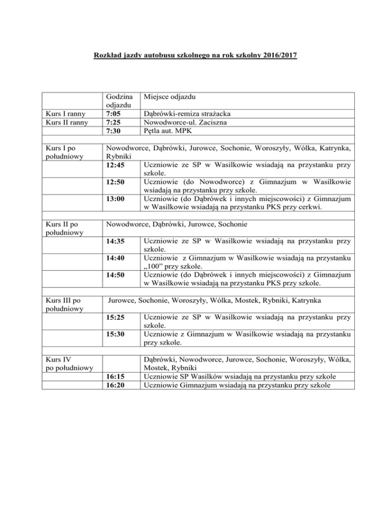 Rozkład jazdy autobusu szkolnego na rok szkolny 2016/2017