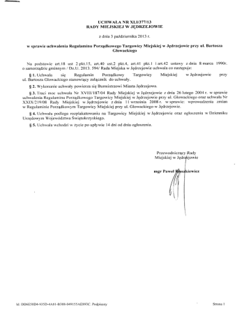 UCHWAI,A NR XLI/377I13 RADY MIEJSKIEJ W JEDRZEJOWIE z dnia 3 pafdziernika 201 3 r. w sprawie uchwalenia Regulaminu Porz4dkowego Targowicy Miejskiej w Jgdrzejowie przy ul. Bartosza Glowackiego Na podstawie art.l8 ust 2 pkt. 15, art.40 ust.2 pkt.4, art.4l pkt. 1 iaft.42 ustawy zdnia 8 marca 1990r. o samorz4dziegminnyrn I DzU. 2013. 5941Rada Miejska w Jgdrzejowieucl-rwalaco nastgpuje: Miejskiej Targowicy Porz4dkowy Regulamin sig $ l. Uchwala ul. BartoszaGlowackiego stanowi4cy zalqcznik do uchwaty. w Jpdrzejowie przy $ 2. Wykonanieuchwaly powierza siq Burmistrzowi Miasta Jgdrzejowa. g 3. Traci moc uchwala Nr XVlll/18'7104 Rady Miejskiej w Jgdrzejowiez dnia 26 lutego 2004 r. w sprawie uchwaleniaRegulaminuPorz4dkowegoTargowicy Miejskiej w Jgdrzejowieprzy ul. Glowackiegooraz uchwalaNr XXlXl219l08 Rady Miejskiej w Jpdrzejowie z dnia I 1 wrzeénia 2008 r. w sprawie: wprowadzenia zmian w RegulaminiePorz4dkowymTargowicy Miejskiej przy ul. Glowackiegow Jgdrzejowie. $ 4. Uchwala podtega rozplakatowaniuna Targowicy Miejskiej w Jqdrzejowieoraz ogloszeniuw Dzienniku UrzEdowymWojewództwaSwigtokrzyskiego. $ 5. Uchwala wchodzi w Zycie po uptywie l4 dni od dnia ogloszenia. PrzewodniczqcyRady Miejskiejw mgr Pawel I d : D D 6 E 5 0 D 4 - 9 3 5 D - 4l -A883 8 8 - 0 4 9 1 5 5 4 E 8 9 3PCo.d p i s a n v Strona I ZalqcznikNr I do Uchwaly Nr XLI/377I13 Rady Miejskiej w Jgdrzejowie z dnia3 paidziernika2\l3 r. REGULAMTN PORZADKOWY TARGOWICY MIEJSKIEJ W JEDRZEJOWIE l. Targowicajest wlasnoéci4Gminy JEdrzejówijest administrowanaw imieniu ina rzecz Gminy Jgdrzejów przezjednostkEbudzetowq pod nazw4.,Administracja i Obsluga" (zwanqdalej .,Administratorem Targowicy"). 2. Cala Targowica podzielona zostalana 4 sektory. 3. Handel winien odbywaó sig w miejscach do tego celu wyznaczonych tj. asortyment danego towaru w odpowiednichsektorachi tak: a) sektor nr I handel arlykulami spozywczymi- jaja, drób Zywy, nasiona,miód pszczeli, b) sektornr 2 - handelodzie24 obuwiem, galanteri4 c) sektor nr 3 - handel sprzgtem RTV, krawiectwo, warzywa, owoce, miEso, pieczywo, ryby, d) sektor nr 4 - handel arlykulami przemyslo'r"lymi,plodami rolnymi, meblami. wgdliny, 4 . Z a b r a n i as i g : a) prowadzenia na Targowicy sprzeda2y towarów w drodze publicznych losowaú lub przetargów z wyj4tkiem losów loterii ksiEZkowych, b)naje2d2ania. parkowania. zafrzymywania pojazdów mechanicznych oraz przyczep na kostce z.,polbruku", c) wsektorze nr 1,2,3,4 parkowania oraz handlu zpojazdów mechanicznych iprzyczep nieprzeznaczonych do sprzedaZybezpoSredniej, d) spozywanianapojów alkoholowych, e) handlu artykulami spozywczo-przemyslowymiprzy kioskachmigsnych, f) parkowaniasamochodówprzy kioskachz migsemprzez ich uZytkowników. 5. Dopuszczalnejest parkowanie samochodów, z których dokonywany jest handel: wpdlinami, rybami, artykulami spozywczymi, pieczywem, meblami, dywanami, maszynami rolniczymi, siatk4 rowerami, wiklinq i sprzgtemAGD. 6. Na Targowicy mogq byó sprzedawanewszystkie towary z wyj4tkiem: a) napojów alkoholowych. b) nafty, benzyny, spirytr-rsuska2onego/denaturatu/, trucizn, Srodków leczniczych, Srodków ochrony roSlin, przedmiotów, karnieni i metali oraz wykonanych z nich c) szlachetnych d) zagranicznychbanknotów i monet, e) papierówwarloÉciowych, f) broni, arnunicji, materialów oraz artykulów pirotechnicznych i wybuchowych, g) innych artykulów spozywczych i przemyslowych, których sprzeda2jest zabroniona na podstawie odrqbnych przepisówi rozporzqdzen. 7. Na Targowicy w handlu obwoZnym nie mog4 byó wprowadzanedo obrotu nastppuj4cearrykuly spozywcze bez opakowaújednostkowych: l) mleko nie pasteryzowane i nie poddane obróbce termicznej oraz przetwory mleczne, w tym 2 ) t l u s z c z er o i l i n n e i z w i e r z g c e . lody, 3) rnigsnoi przetwory migsne oraz podroby i przetwory podrobowe zwierzqtrzeínych, 4) drób bity i przetwory drobiowe oraz podroby i przetwory podrobowe z drobiu, ld: DD6E50D4-935D-4A81-8388-049155AE P8 o9 d3 oC r s.a n v Strona I 5) dziczyznai przetworyzdziczyzny, 6) przetwory rybne, 7) mroZoneSrodki spo2ywcze,w tym zawieraj4cew swoim skladzie érodki spozywcze wymienione w pkt.2-6, 8) potrawy i wyroby garmaieryjne do bezpoSredniegospoZycia, 9) przetwory grzybowe, l0) pieczywo i wyroby ciastkarskie. 8. Na Targowicy dopt-tszczasig handel migsern i podrobami ze zwierzqt rzeLnych wylqcznie w punktach stalych sprzeda2yzakwalifikowanych, jako kioski miEsne na warunkach okreSlonych obowi4zuj4cymi przepisami w tym zakresie. 9. Osoby prowadz4ce handel na Targowicy s4 zobowiqzane do utrzymania nale2ytego porz4dku swojego stoiska oraz pozostawienie go w czysto5ci po zakohczonym handlu jak równiez do przestrzeganiaregulaminu Targowicy i przepisówprzeciwpoZarowych. 10. Miejsce sprzeda2ywyznaczy Administrator Targowicy, b4dZ osoba prze niego upowa2niona. Osoby frzyczne i prawne dokonuj4ce sprzeda?y na Targowicy mog4 dokonywaó rezerwacji miejsc wykonywania handlu we wszystkich sektorach,tj. 1, 2,3,4. PodstawEdokonania rezerwacji jest umowa rezerwacji zawartaprzez Administratora Targowicy dzialalqcegow imieniu i narzecz Gminy JEdrzejówz osob4 prowadz4c4handelna Targowicy. Rezerwacjamo2ebyó dokonywanana okres od I miesi4cado jednego roku za pobraniem dodatkowej oplaty w wysokoSci 36, 00 zl. brutto za 1 miesi4c. Oplata rezerwacyjnajest pobierana w imieniu i na rzeczGminy Jgdrzejówprzez AdministratoraTargowicy w budynku administracjiTargowicy za wydaniem dowodu rvplaty. Rezerwacji nalezy dokonywaó w 2 pierwsze dni targowe miesi4ca. Rezerwacja obowi4zuje do godz. 700.Nielrsprawiedliwiony brak rezerwacji przezjeden miesi4c powodLrjeutratg zajmowanego miejsca. Okazanie umowy rezerwacji miejsca upowaZnia do bezplatnego korzystania zsanitariatów na Targowicy Miejskiej. 11. Miejsce sprzedazy nie mo2e byó:a) wyznaczone na jezdniach, przejéciaclr przeznaczonychdo ruchu lub w sposóbhamuj4cyruch.b) odstgpowaneprzez osobg,której miejsceto wyznaczono. 12. Winni naruszenia postanowieñ Regulaminu Porz4dkowego Targo