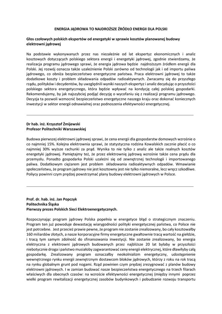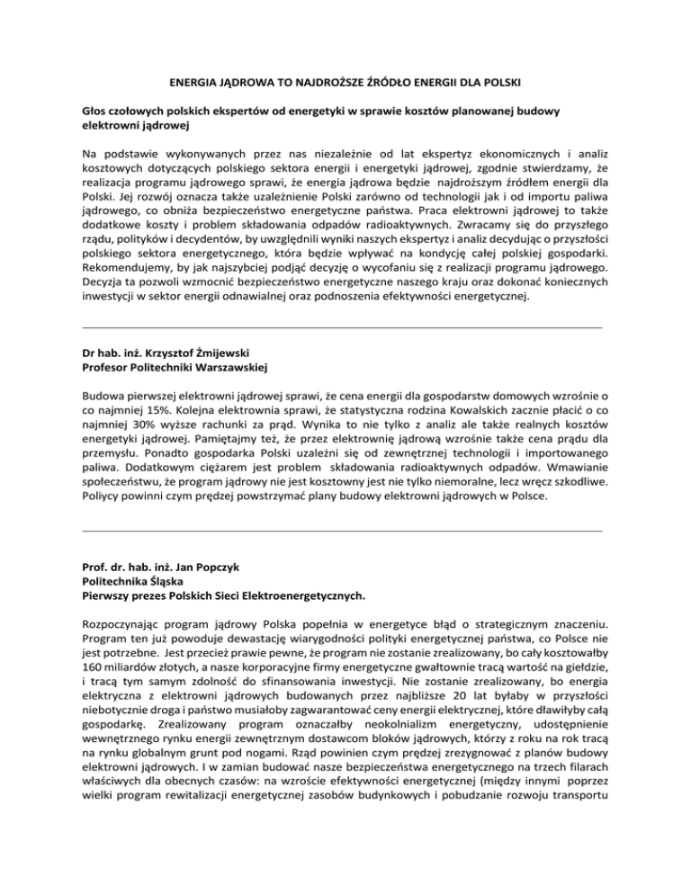 ENERGIA JĄDROWA TO NAJDROŻSZE ŹRÓDŁO ENERGII DLA POLSKI Głos czołowych polskich ekspertów od energetyki w sprawie kosztów planowanej budowy elektrowni jądrowej Na podstawie wykonywanych przez nas niezależnie od lat ekspertyz ekonomicznych i analiz kosztowych dotyczących polskiego sektora energii i energetyki jądrowej, zgodnie stwierdzamy, że realizacja programu jądrowego sprawi, że energia jądrowa będzie najdroższym źródłem energii dla Polski. Jej rozwój oznacza także uzależnienie Polski zarówno od technologii jak i od importu paliwa jądrowego, co obniża bezpieczeństwo energetyczne państwa. Praca elektrowni jądrowej to także dodatkowe koszty i problem składowania odpadów radioaktywnych. Zwracamy się do przyszłego rządu, polityków i decydentów, by uwzględnili wyniki naszych ekspertyz i analiz decydując o przyszłości polskiego sektora energetycznego, która będzie wpływać na kondycję całej polskiej gospodarki. Rekomendujemy, by jak najszybciej podjąć decyzję o wycofaniu się z realizacji programu jądrowego. Decyzja ta pozwoli wzmocnić bezpieczeństwo energetyczne naszego kraju oraz dokonać koniecznych inwestycji w sektor energii odnawialnej oraz podnoszenia efektywności energetycznej. Dr hab. inż. Krzysztof Żmijewski Profesor Politechniki Warszawskiej Budowa pierwszej elektrowni jądrowej sprawi, że cena energii dla gospodarstw domowych wzrośnie o co najmniej 15%. Kolejna elektrownia sprawi, że statystyczna rodzina Kowalskich zacznie płacić o co najmniej 30% wyższe rachunki za prąd. Wynika to nie tylko z analiz ale także realnych kosztów energetyki jądrowej. Pamiętajmy też, że przez elektrownię jądrową wzrośnie także cena prądu dla przemysłu. Ponadto gospodarka Polski uzależni się od zewnętrznej technologii i importowanego paliwa. Dodatkowym ciężarem jest problem składowania radioaktywnych odpadów. Wmawianie społeczeństwu, że program jądrowy nie jest kosztowny jest nie tylko niemoralne, lecz wręcz szkodliwe. Poliycy powinni czym prędzej powstrzymać plany budowy elektrowni jądrowych w Polsce. Prof. dr. hab. inż. Jan Popczyk Politechnika Śląska Pierwszy prezes Polskich Sieci Elektroenergetycznych. Rozpoczynając program jądrowy Polska popełnia w energetyce błąd o strategicznym znaczeniu. Program ten już powoduje dewastację wiarygodności polityki energetycznej państwa, co Polsce nie jest potrzebne. Jest przecież prawie pewne, że program nie zostanie zrealizowany, bo cały kosztowałby 160 miliardów złotych, a nasze korporacyjne firmy energetyczne gwałtownie tracą wartość na giełdzie, i tracą tym samym zdolność do sfinansowania inwestycji. Nie zostanie zrealizowany, bo energia elektryczna z elektrowni jądrowych budowanych przez najbliższe 20 lat byłaby w przyszłości niebotycznie droga i państwo musiałoby zagwarantować ceny energii elektrycznej, które dławiłyby całą gospodarkę. Zrealizowany program oznaczałby neokolnializm energetyczny, udostępnienie wewnętrznego rynku energii zewnętrznym dostawcom bloków jądrowych, którzy z roku na rok tracą na rynku globalnym grunt pod nogami. Rząd powinien czym prędzej zrezygnować z planów budowy elektrowni jądrowych. I w zamian budować nasze bezpieczeństwa energetycznego na trzech filarach właściwych dla obecnych czasów: na wzroście efektywności energetycznej (między innymi poprzez wielki program rewitalizacji energetycznej zasobów budynkowych i pobudzanie rozwoju transportu elektrycznego), na źródłach odnawialnych (w tym na restrukturyzacji rolnictwa w oparciu o inwestycje w biomasowe źródła energii) i na inteligentnej infrastrukturze (środowisku życia młodego pokolenia). Prof. dr hab. inż. Maciej Nowicki Były dwukrotny Minister Środowiska Plan budowy elektrowni jądrowej w Polsce jest pomysłem czysto politycznym, nie popartym żadnymi poważnymi analizami ekonomicznymi, bilansującymi posiadane środki finansowe z czekającymi nas wielkimi i niezbędnymi inwestycjami w sektorze energetycznym. Koszty inwestycyjne takiej elektrowni są 3 – 4 razy wyższe od kosztów równoważnej elektrowni węglowej, a w efekcie pokrywałaby ona zaledwie kilka procent zapotrzebowania na energię elektryczną w kraju, nie ratując nas przed kryzysem braku energii. Tymczasem fundusze te są niezbędne dla głębokiej modernizacji istniejących elektrowni i sieci energetycznych oraz dla poprawy efektywności energetycznej w przemyśle, transporcie i w gospodarstwach domowych To są kluczowe elementy polskiego systemu energetycznego, który powinien współpracować w coraz większym stopniu z odnawialnymi źródłami energii, zapewniając krajowi energię z własnych źródeł, dając pracę dziesiątkom tysięcy osób i zyski dla polskich producentów. Uważam więc za konieczne, aby jak najszybciej wycofać się z programu budowy elektrowni jądrowej. Ani złotówka więcej nie powinna być wydana na ten szkodliwy projekt.