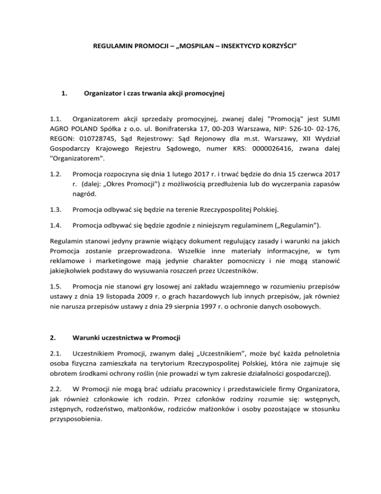 REGULAMIN PROMOCJI – „MOSPILAN – INSEKTYCYD KORZYŚCI” 1. Organizator i czas trwania akcji promocyjnej 1.1. Organizatorem akcji sprzedaży promocyjnej, zwanej dalej "Promocją" jest SUMI AGRO POLAND Spółka z o.o. ul. Bonifraterska 17, 00-203 Warszawa, NIP: 526-10- 02-176, REGON: 010728745, Sąd Rejestrowy: Sąd Rejonowy dla m.st. Warszawy, XII Wydział Gospodarczy Krajowego Rejestru Sądowego, numer KRS: 0000026416, zwana dalej "Organizatorem". 1.2. Promocja rozpoczyna się dnia 1 lutego 2017 r. i trwać będzie do dnia 15 czerwca 2017 r. (dalej: „Okres Promocji”) z możliwością przedłużenia lub do wyczerpania zapasów nagród. 1.3. Promocja odbywać się będzie na terenie Rzeczypospolitej Polskiej. 1.4. Promocja odbywać się będzie zgodnie z niniejszym regulaminem („Regulamin”). Regulamin stanowi jedyny prawnie wiążący dokument regulujący zasady i warunki na jakich Promocja zostanie przeprowadzona. Wszelkie inne materiały informacyjne, w tym reklamowe i marketingowe mają jedynie charakter pomocniczy i nie mogą stanowić jakiejkolwiek podstawy do wysuwania roszczeń przez Uczestników. 1.5. Promocja nie stanowi gry losowej ani zakładu wzajemnego w rozumieniu przepisów ustawy z dnia 19 listopada 2009 r. o grach hazardowych lub innych przepisów, jak również nie narusza przepisów ustawy z dnia 29 sierpnia 1997 r. o ochronie danych osobowych. 2. Warunki uczestnictwa w Promocji 2.1. Uczestnikiem Promocji, zwanym dalej „Uczestnikiem”, może być każda pełnoletnia osoba fizyczna zamieszkała na terytorium Rzeczypospolitej Polskiej, która nie zajmuje się obrotem środkami ochrony roślin (nie prowadzi w tym zakresie działalności gospodarczej). 2.2. W Promocji nie mogą brać udziału pracownicy i przedstawiciele firmy Organizatora, jak również członkowie ich rodzin. Przez członków rodziny rozumie się: wstępnych, zstępnych, rodzeństwo, małżonków, rodziców małżonków i osoby pozostające w stosunku przysposobienia. 3. Zasady przeprowadzania Promocji 3.1. Celem Promocji jest popularyzacja środka ochrony roślin Mospilan 20 SP. Nagrodami w promocji są rabaty, do których prawo nabywa Uczestnik na warunkach podanych poniżej. 3.2. Promocją objęte są zakupy preparatu Mospilan 20 SP w następujących opakowaniach standardowych: 0,125 kg; 0,2 kg; 0,6 kg; 3 x 0,6 kg; 4 x 0,6 kg; 8 x 1,2 kg oraz w nowych opakowaniach zawierających torebki wodnorozpuszczalne: 125 g, 200 g, 3 x 200 g, 9 x 200 g, 6 x 200 g oraz 12 x 200 g. 3.3. Promocja polega na udzieleniu rabatu przy zakupie preparatu Mospilan 20 SP na podstawie posiadanego kuponu. Wysokość rabatu jest uzależniona od wielkości opakowania i wynosi, odpowiednio: • za opakowanie 0,125 kg – rabat w wysokości 7,00 zł (brutto) • 0,2 kg – 11,00 zł • 0,6 kg - 33,00 zł • 3 x 0,6 kg – 100,00 zł • 4 x 0,6 kg - 133,00 zł • 8 x 1,2 kg - 533,00 zł 3.4. Rabat nalicza się za każde zakupione opakowanie, przy czym minimalna wielkość zakupu objętego rabatem wynosi 0,6 kg. 3.5. Podstawą do uczestnictwa w Promocji jest zakup preparatu Mospilan 20 SP do zastosowania wyłącznie w uprawie rzepaku i wypełnienie Kuponu Promocyjnego zwanego dalej "Kuponem ”. Wzór Kuponu stanowi załącznik nr 1 do Regulaminu. 3.6. Promocja nie obejmuje zakupów preparatu Mospilan do wykorzystania pod inne uprawy, niż rzepak. 3.7. Promocja nie łączy się z innymi promocjami dotyczącymi zakupów preparatu Mospilan 20 SP prowadzonymi przez Sumi Agro w 2017 roku, w tym między innymi: • zakupów dokonanych w ramach programu Shogun Władca Ziemi, w tym zakupów dokonanych w ramach programu Yamato Gold. 3.8. Warunkiem otrzymania nagrody jest, poza wyżej określonymi, łączne spełnienie poniższych warunków: • uzyskanie Kuponu przez Uczestnika, • dokonanie zakupu w okresie promocji preparatu Mospilan 20 SP w ilości co najmniej 0,6 kg. Zakupu można dokonać w punktach sprzedaży Autoryzowanych Dystrybutorów Organizatora (zwanych dalej „Autoryzowanymi Dystrybutorami”), których wykaz znajduje się w załączniku nr 2 do niniejszego Regulaminu, bądź w punktach sprzedaży środków ochrony roślin nienależących do Autoryzowanych Dystrybutorów Organizatora, a będących uczestnikami Programu Partnerskiego Shogun, prowadzących sprzedaż preparatu Mospilan 20 SP – zwanych dalej łącznie „Punktami Sprzedaży” • poprawne wypełnienie i podpisanie Kuponu promocyjnego oraz pozostawienie wypełnionego Kuponu promocyjnego wraz z kopią dowodu zakupu preparatu Mospilan 20 SP w Punkcie Sprzedaży. 3.9. Rabat udzielany jest w Puncie Sprzedaży bezpośrednio przy zakupie. 3.10. Za „Uczestnika” uważa się osobę dokonującą faktycznej czynności zakupu, niezależnie od podmiotu, na którego rachunek dokonuje zakupu. 4. Postępowanie reklamacyjne 4.1. Każdemu Uczestnikowi przysługuje prawo wniesienia pisemnej reklamacji w czasie trwania Promocji, nie później jednak niż do dnia 31 lipca 2017 r. Reklamacje wniesione po upływie powyższego terminu nie będą rozpatrywane. Za datę wniesienia reklamacji uważa się datę stempla pocztowego na przesyłce zawierającej reklamację. 4.2. Zgłoszenie reklamacyjne powinno być wysłane na adres Organizatora (ul. Bonifraterska 17, 00-203 Warszawa) i musi zawierać: dokładne dane personalne zgłaszającego reklamację (imię, nazwisko, dokładny adres wraz z kodem pocztowym reklamującego) oraz przyczynę reklamacji, treść żądania reklamującego oraz opis okoliczności uzasadniających reklamację. Reklamacje należy kierować na piśmie do Organizatora z dopiskiem „Mospilan – insektycyd korzyści”. 4.3. Osoba wnosząca reklamację zostanie powiadomiona o rozstrzygnięciu w formie pisemnej najpóźniej w terminie 14 dni od daty otrzymania reklamacji przez Organizatora (data wysłania pisma przez Organizatora). 4.4. Decyzja rozstrzygająca reklamację jest ostateczna i nie przysługuje od niej odwołanie w ramach postępo