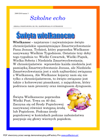 2009/2010 numer 3 Szkolne echo SZKOŁA PODSTAWOWA IM. WŁ. BARTKOWIAKA W JUTROSINIE Wielkanoc - najstarsze i najważniejsze święto chrześcijańskie upamiętniające Zmartwychwstanie Pana Jezusa. Tydzień, który poprzedza Wielkanoc nazywamy Wielkim Tygodniem. Ostatnie trzy doby tego tygodnia to: Wielki Czwartek, Wielki Piątek, Wielka Sobota i Niedziela Zmartwychwstania. W chrześcijaństwie wprawdzie każda niedziela jest pamiątką Zmartwychwstanie Jezusa, ale Niedziela Zmartwychwstania jest z nich najbardziej związana z Wielkanocą. Ale Wielkanoc kojarzy nam się nie tylko z chrześcijaństwem, to święto związane jest także z kolorowymi pisankami, z zajączkiem, który podrzuca nam prezenty oraz śmingusem dyngusem. Święta Wielkanocne poprzedza Wielki Post. Trwa on 40 dni. Zaczyna się od Środy Popielcowej nazywanej również wstępną środą lub Popielcem. Podczas środy popielcowej w kościołach podczas nabożeństwa posypuje się głowy wiernych popiołem. PDF stworzony przez wersję demonstracyjną pdfFactory Pro www.pdffactory.pl/ Str. 2 Szkolne echo Wielka Sobota była dniem radosnego oczekiwania. Koniecznie należało tego dnia poświęcić koszyczek z jedzeniem. Nie mogło w nim zabraknąć baranka (symbolu Chrystusa Zmartwychwstałego), mięsa i wędlin (na znak, że kończy się post). Święcono też chrzan, – bo „gorycz męki Pańskiej i śmierci została zwyciężona przez słodycz zmartwychwstania”, masło – oznakę dobrobytu – i jajka – symbol narodzenia. Święconkę jadło się następnego dnia na wielkanocne śniadanie. KaMa PDF stworzony przez wersję demonstracyjną pdfFactory Pro www.pdffactory.pl/ Anoreksja Jak wszyscy wiemy wielkimi krokami zbliża się Dzień Kobiet. To okres szczególnie trudny dla wszystkich pań i dziewczyn, a zwłaszcza dla nas – biednych mężczyzn. Święto to przypada wiosną, a ta pora roku odkrywa wszystkie kobiece wdzięki ukrywane zimą pod grubymi kurtkami i płaszczami. Jeśli podczas paru zimowych miesięcy przybyło kobietkom kilka centymetrów w pasie i biodrach, to są one w stanie zrobić wszystko, żeby się ich pozbyć. I co robią? ODCHUDZAJĄ SIĘ! Nadmierne odchudzanie prowadzi do choroby zwanej anoreksją. Jest to dolegliwość niewątpliwie psychiczna, której podłoże znajduje się w rodzinie, środowisku chorego – w pracy, szkole – i ogółem w nieprawidłowych relacjach interpersonalnych. Przypadłość rozpoczyna się zupełnie niewinnie – od zwykłych prób odchudzania się. Czasem osoba ogranicza jedzenie do tego stopnia, że je jedynie kromkę chleba z masłem i sałatę z kiełkami. Przypominam, że dzienne zapotrzebowanie kalorii człowieka wynosi do 2000 kcal a opisany wcześniej posiłek ma jedynie 300kcal. Początkowo uważamy, że odchudzamy się tylko po to, aby zrzucić kilka kilogramów, lecz gdy schudniemy trochę, chcemy jeszcze więcej! To uzależnienie, ale od nadmiernie szczupłej sylwetki! Najczęściej płeć żeńska postępuje tak przed wieczorkami, balami lub dyskotekami. Muszę niestety stwierdzić, że według przeprowadzonych statystyk coraz więcej mężczyzn zapada właśnie na tę chorobę. Chłopacy pamiętajcie , że my mężczyźni musimy być silni, męscy i pełni energii. Miejmy to na uwadze w tak ważne święto dla wszystkich pań! (a)Dzik PDF stworzony przez wersję demonstracyjną pdfFactory Pro www.pdffactory.pl/ 8 marca 2010, w Szkole Podstawowej im. Władysława Bartkowiaka Jutrosinie odbył się apel poświęcony kobietom - tym małym i tym dużym… Uroczystość rozpoczęła się występem przygotowanym przez szkolne kółko teatralne. Skecz dotyczyła zesłania kobiety, Ewy, na Ziemię do Adama, który znudzony ciągłą samotnością zażyczył sobie czegoś ładnego. Z czasem jednak okazało się, że stworzenie zesłane w prezencie od Boga jest bardzo natrętne i potrzebuje ciągłej uwagi. Adam znudził się nowym prezentem dość wcześnie, ale Ewa ciągle starała przypodobać się partnerowi. Przedstawienie kończy się na tym, iż Adam został sam na świecie i bardzo tęskni za naprzykrzającą się, marudzącą, ale kochającą Ewą Autorką przedstawienia była pani Marlena Janura, która wraz z uczniami przygotowała scenariusz. Zadbała o grę aktorską, kostiumy i rekwizyty. Scenografią zajęła się pani Joanna Głowacz, razem z uczniami naszej szkoły. Muzyką uprzyjemniała czas pani Beata Wielebska - Felisiak. Pod koniec uroczystości pani Renata Piotrowska wręczyła kwiaty najsympatyczniejszym dziewczynom w szkole. Oto wyniki ankiety przeprowadzonej wśród chłopców naszej szkoły: klasa 4a - Kamila Kędzia, klasa 4b - Karolina Duda, klasa 5a - Paulina Karaś, klasa 5b - Kamila Wierzyk, klasa 5c - Magdalena Stanisławska, klasa 6a - Katarzyna Majsnerowska, klasa 6b - Jagoda Wojtyra, klasa 6c- Sandra Bielicka; Wszystkim paniom serdecznie gratulujemy! Natalia S. :) PDF stworzony przez wersję demonstracyjną pdfFactory Pro www.pdffactory.pl/ 2009/2010 numer 3 Baran (21.03-20.04) Cierpliwośc, co ma przyjść do Ciebie, przyjdzie. A czy to ma być za dzień, tydzień, miesiąc czy rok, i tak się doczekasz. Nie schodź z obranego kursu, pracuj dalej, jeszcze będziesz zbierać plony obfitości. Nie bój się sukcesu, kto jak kto, ale Ty na niego zasługujesz. Coś się oczyści i coś będziesz z troską pielęgnować. Str. 5 nizować sobie czas i życie, żeby zarabiać je łatwo i w przyjemny sposób. Za mało w siebie wierzysz, masz niczym nie uzasadniony strach przed ubóstwem i bezrobociem. Spójrz realistycznie, nic takiego Ci nie grozi, a nawet jest lepiej niż przeciętnie. Lew (23.07-23.08) Będziesz pędzić naprzód jak zdobywca, nie martwiąc się o konsekwencje. Powiedzie Ci się, los Ci Byk (21.04-20.05) sprzyja i jesteś świetnie przygotoWyznaczyłaś sobie długoterminowe wana i do pracy i do walki, jak pozadanie, ta sprawa trwa. Zbliżasz trzeba. Uwierz, że rzeczy niezbędsię mniej więcej do połow