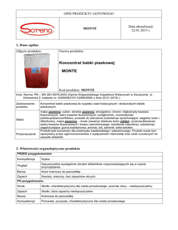 OPIS PRODUKTU GOTOWEGO MONTE Data aktualizacji: 22.01.2015 r. 1. Dane ogólne Zdjęcie produktu: Nazwa produktu: Koncentrat babki piaskowej MONTE Kod produktu: MONTE Inne: Norma: PN – EN ISO 6579:2003 (Opinia Wojewódzkiego Inspektora Weterynarii w Szczecinie, ul. Ostrawicka 2, badanie nr: A/00049/210115/MS/0084 z dnia 22.01.2015r.) Zastosowanie produktu Skład Przeznaczenie Koncentrat babki piaskowej do wypieku ciast tradycyjnych i doskonałych babek piaskowych mąka pszenna, cukier, skrobia pszenna, emulgatory: (mono i diglicerydy kwasów tłuszczowych, estry kwasów tłuszczowych i poliglicerolu, monooleinian polioksyetylenosorbitolu), proszek do pieczenia (substancje spulchniające: węglany sodu i difosforany, mąka pszenna, - może zawierać śladowe ilości mleka), przeciwutleniacze: (estry kwasów tłuszczowych i kwasu askorbinowego, tokoferole naturalne), substancja zagęszczająca: guma ksantanowa, aromat, sól, barwnik: beta karoten. Produkt jest surowcem dla przemysłu ciastkarskiego i piekarniczego. Produkt może być spożywany przez ogół konsumentów z wyłączeniem niemowląt oraz osób uczulonych na zawarte składniki. 2. Właściwości organoleptyczne produktu PRZED przygotowaniem Konsystencja Sypka Wygląd Dopuszczalne wystąpienie zbryleń składników rozprowadzających się w czasie przyrządzania; Barwa Kolor kremowy do jasnożółtej Zapach Swoisty, mleczny, bez zapachów obcych PO przygotowaniu Smak Słodki, charakterystyczny dla ciasta proszkowego, posmak obcy – niedopuszczalny; Zapach Słodki, obce zapachy niedopuszczalne Barwa Kremowa do jasnożółtej Konsystencja Porowata, puszysta, charakterystyczna dla ciasta proszkowego 3. Właściwości fizykochemiczne produktu Ołów nie więcej niż 0,30 mg/kg Obecność metali szkodliwych dla zdrowia Kadm nie więcej niż 0,10 mg/kg Rtęć nie więcej niż 0,02 mg/kg Arsen nie więcej niż 0,20 mg/kg Obecność zanieczyszczeń Niedopuszczalna 4. Właściwości mikrobiologiczne produktu Ogólna liczba drobnoustrojów w 1g Gronkowce chorobotwórcze w 0,1g Pałeczki Salmonella w 25g 5 Nie więcej niż: 2 x 10 Nieobecne Nieobecne 5. Opakowanie produktu Rodzaj opakowania Masa netto w opakowaniu Paletyzacja Worek papierowy z warstwą folii 20 kg 30 x 20 kg Opakowania, które mają bezpośrednią styczność z produktami są przeznaczone do bezpośredniego kontaktu z żywnością. 6. Przechowywanie produktu Warunki przechowywania Opakowania zamknięte (zszyte), szczelne, zabezpieczone przed dostępem wilgoci, powietrza i światła, w pomieszczeniach suchych, czystych i chłodnych, wolnych od szkodników. Okres przechowywania 8 miesięcy od daty produkcji 7. Oznakowanie produktu Na etykiecie powinny znaleźć się następujące informacje: - nazwa produktu, - nazwa i adres producenta, - skład, - przeznaczenie - zawartość netto, - przepis przygotowania - data ważności, - oznaczenie partii produkcyjnej - sposób i warunki przechowywania 8. Transport Odbywa się za pomocą transportu środków spożywczych, w warunkach zapewniających właściwe utrzymanie jakości produktu. 9. Oświadczenie GMO Niniejszym oświadczamy, że nie podlega modyfikacją genetycznym oraz nie zawiera składników genetycznie modyfikowanych. 10. Składniki alergenne produktu Deklaracja o obecności składników alergennych Dyrektywa Komisji 2000/13/WE z późniejszymi zmianami Produkt / surowiec zawiera Lp. Nazwa składnika Objaśnienie / komentarz TAK NIE Zboża zawierające gluten (tj. pszenica, żyto, jęczmień, owies zwyczajny, pszenica oplewiona / 1. X orkisz, kamut lub ich szczepy hybrydowe) i produkty pochodne 2. Skorupiaki i produkty pochodne X 3. Jaja i produkty pochodne X 4. Ryby i produkty pochodne X Orzeszki ziemne / orzeszki arachidowe i produkty pochodne 6. Nasiona soi i produkty pochodne 5. 7. Mleko i z laktozą) produkty pochodne (łącznie X X X Orzechy, tj. migdał, orzech laskowy, orzech włoski, 8. nerkowiec, orzech pekan, orzech brazylijski, pistacja, orzech pistacjowy, orzech makdamia. X 9. Seler i produkty pochodne X 10. Gorczyca i produkty pochodne X 11. Nasiona sezamu i produkty pochodne X 12. Dwutlenek siarki i siarczyny w stężeniach powyżej 10 mg/kg lub 10 mg/l w przeliczeniu na SO2 X 13. Łubin i produkty pochodne X 14. Mięczaki i produkty pochodne X Może zawierać śladowe ilości: jaj, soi, orzechów, sezamu i łubinu 11. Wartość energetyczna i odżywcza produktu Wartość energetyczna Tłuszcze W tym kwasy tłuszczowe nasycone 370 kcal / 1535 kJ 1,0 g 0,6 g Białko 3,8 g Węglowodany 84,4 g Wartości obliczone na podstawie deklaracji dostawców i tabel wartości odżywczych IŻIŻ. Wartości te podlegają biologicznym W tym cukier 41,8 g Błonnik 1,4 g Sód 0,3 g i produkcyjno – technicznym naturalnym wahaniom. Dokument został przygotowany w wersji elektronicznej i jest ważny bez podpisu. Informacje zawarte w dokumencie zostały opracowane na podstawie danych uzyskanych od naszych dostawców; naszej wiedzy i doświadczeniu oraz obowiązujących przepisach prawa. Wszystkie dane są aktualne w chwili obecnej, jednak dane te mogą ulec zmianie w zależności od właściwości surowców użytych w produkcji. Niniejszy dokument ma charakter informacyjny.
