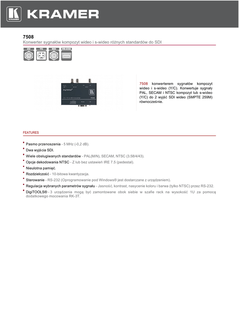 7508 Konwerter sygnałów kompozyt wideo i s-wideo różnych standardów do SDI 7508 konwerterem sygnałów kompozyt wideo i s-wideo (Y/C). Konwertuje sygnały PAL, SECAM i NTSC kompozyt lub s-wideo (Y/C) do 2 wyjść SDI wideo (SMPTE 259M) równocześnie. FEATURES Pasmo przenoszenia - 5 MHz (-0,2 dB). Dwa wyjścia SDI. Wiele obsługiwanych standardów - PAL(M/N), SECAM, NTSC (3.58/4/43). Opcje dekodowania NTSC - Z lub bez ustawień IRE 7.5 (pedestal). Nieulotna pamięć. Rozdzielczość - 10-bitowa kwantyzacja. Sterowanie - RS-232 (Oprogramowanie pod Windows® jest dostarczane z urządzeniem). Regulacja wybranych parametrów sygnału - Jasność, kontrast, nasycenie koloru i barwa (tylko NTSC) przez RS-232. DigiTOOLS® - 3 urządzenia mogą być zamontowane obok siebie w szafie rack na wysokość 1U za pomocą dodatkowego mocowania RK-3T. 7508 TECHNICAL SPECIFICATIONS WEJŚCIE: 1 kompozyt wideo 1 Vpp/75 Ω na złączu BNC; 1 s-wideo 1 Vpp, 0.3 Vpp/75 Ω na złączu 4-pinowym. WYJŚCIE: 2 SDI SMPTE-259M, ITU-R BT.601 na złączach BNC. ROZDZIELCZOŚĆ KWANTYZACJI: 10 bitów. PASMO PRZENOSZENIA: 5 MHz (-0,2 dB). STOSUNEK SYGNAŁ/SZUM: 57 dB. WSPÓŁCZYNNIK ZAWARTOŚCI HARMONICZNYCH: RÓŻNICA FAZ: <0.2%. WZMOCNIENIE RÓŻNICOWE: 1%. NIELINIOWOŚĆ LUMINANCJI: 1%. OPÓŹNIENIE CHROMINANCJA/LUMINANCJA: <15 ns. STEROWANIE: Jasność, kontrast, barwa, nasycenie, ostrość przez RS-232. ŹRÓDŁO ZASILANIA: 12 V DC, 210 mA. WYMIARY: 12 cm x 7.5 cm x 2.5 cm (4.7" x 2.95" x 0.98") szer., głęb., wys. MASA: Ok. 0,3 kg (0,66 lbs). AKCESORIA: Zasilacz 12 V DC, zestaw montażowy. OPCJE: Mocowanie do szaf rack 19" RK-3T. 1%.