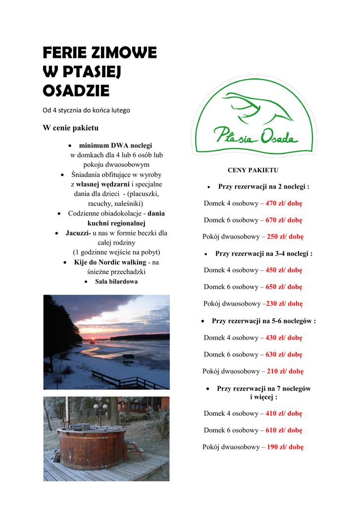 FERIE ZIMOWE W PTASIEJ OSADZIE Od 4 stycznia do końca lutego W cenie pakietu minimum DWA noclegi w domkach dla 4 lub 6 osób lub pokoju dwuosobowym Śniadania obfitujące w wyroby z własnej wędzarni i specjalne dania dla dzieci - (placuszki, racuchy, naleśniki) Codzienne obiadokolacje - dania kuchni regionalnej Jacuzzi- u nas w formie beczki dla całej rodziny (1 godzinne wejście na pobyt) Kije do Nordic walking - na śnieżne przechadzki Sala bilardowa CENY PAKIETU Przy rezerwacji na 2 noclegi : Domek 4 osobowy – 470 zł/ dobę Domek 6 osobowy – 670 zł/ dobę Pokój dwuosobowy – 250 zł/ dobę Przy rezerwacji na 3-4 noclegi : Domek 4 osobowy – 450 zł/ dobę Domek 6 osobowy – 650 zł/ dobę Pokój dwuosobowy –230 zł/ dobę Przy rezerwacji na 5-6 noclegów : Domek 4 osobowy – 430 zł/ dobę Domek 6 osobowy – 630 zł/ dobę Pokój dwuosobowy – 210 zł/ dobę Przy rezerwacji na 7 noclegów i więcej : Domek 4 osobowy – 410 zł/ dobę Domek 6 osobowy – 610 zł/ dobę Pokój dwuosobowy – 190 zł/ dobę