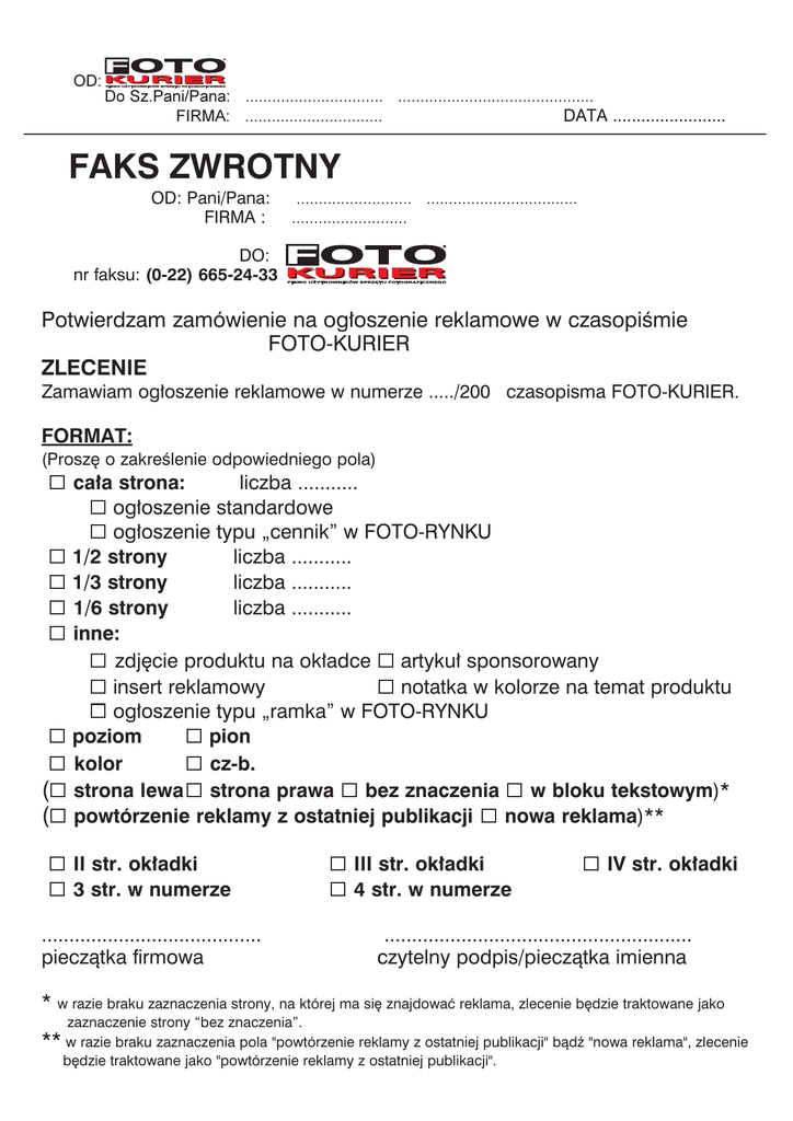 OD: Do Sz.Pani/Pana: ............................... ............................................ FIRMA: ............................... DATA ........................ FAKS ZWROTNY OD: Pani/Pana: FIRMA : .......................... .................................. .......................... DO: nr faksu: (0-22) 665-24-33 Potwierdzam zamówienie na ogłoszenie reklamowe w czasopiśmie FOTO-KURIER ZLECENIE Zamawiam ogłoszenie reklamowe w numerze ...../200 czasopisma FOTO-KURIER. FORMAT: (Proszę o zakreślenie odpowiedniego pola) ( ( cała strona: liczba ........... ogłoszenie standardowe ogłoszenie typu „cennik” w FOTO-RYNKU 1/2 strony liczba ........... 1/3 strony liczba ........... 1/6 strony liczba ........... inne: zdjęcie produktu na okładce artykuł sponsorowany insert reklamowy notatka w kolorze na temat produktu ogłoszenie typu „ramka” w FOTO-RYNKU poziom pion kolor cz-b. strona lewa strona prawa bez znaczenia w bloku tekstowym)* powtórzenie reklamy z ostatniej publikacji nowa reklama)** II str. okładki 3 str. w numerze ........................................ pieczątka firmowa * III str. okładki 4 str. w numerze IV str. okładki ........................................................ czytelny podpis/pieczątka imienna w razie braku zaznaczenia strony, na której ma się znajdować reklama, zlecenie będzie traktowane jako zaznaczenie strony “bez znaczenia”. ** w razie braku zaznaczenia pola "powtórzenie reklamy z ostatniej publikacji" bądź "nowa reklama", zlecenie będzie traktowane jako "powtórzenie reklamy z ostatniej publikacji".