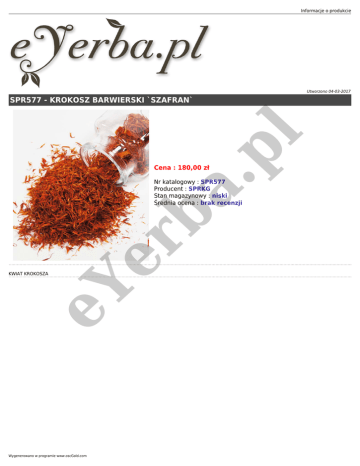 Informacje o produkcie Utworzono 04-03-2017 a. pl SPR577 - KROKOSZ BARWIERSKI `SZAFRAN` Cena : 180,00 zł eY KWIAT KROKOSZA er b Nr katalogowy : SPR577 Producent : SPRKG Stan magazynowy : niski Średnia ocena : brak recenzji Wygenerowano w programie www.oscGold.com