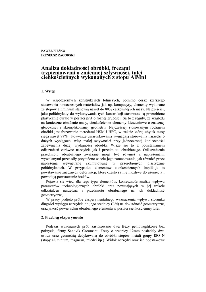PAWEŁ PIEŚKO IRENEUSZ ZAGÓRSKI Analiza dokładności obróbki, frezami trzpieniowymi o zmiennej sztywności, tulei cienkościennych wykonanych z stopu AlMn1 1. Wstęp W współczesnych konstrukcjach lotniczych, pomimo coraz szerszego stosowania nowoczesnych materiałów jak np. kompozyty, elementy wykonane ze stopów aluminium stanowią nawet do 80% całkowitej ich masy. Najczęściej, jako półfabrykaty do wykonywania tych konstrukcji stosowane są przerobione plastycznie durale w postaci płyt o różnej grubości. Są to z reguły, ze względu na konieczne obniżenie masy, cienkościenne elementy kieszeniowe o znacznej głębokości i skomplikowanej geometrii. Najczęściej stosowanym rodzajem obróbki jest frezowanie metodami HSM i HPC, w trakcie której ubytek masy sięga nawet 97%. Powyższe uwarunkowania wymagają stosowania narzędzi o dużych wysięgach, więc małej sztywności przy jednoczesnej konieczności zapewnienia dużej wydajności obróbki. Wiąże się to z powstawaniem odkształceń zarówno narzędzia jak i przedmiotu obrabianego. Odkształcenia przedmiotu obrabianego związane mogą być również z naprężeniami wywołanymi przez siły przyłożone w celu jego zamocowania, jak również przez naprężenia wewnętrzne skumulowane w przerobionych plastycznie półfabrykatach. W przypadku elementów cienkościennych implikuje to powstawanie znacznych deformacji, które często są nie możliwe do usunięcia i powodują powstawanie braków. Pojawia się więc, dla tego typu elementów, konieczność analizy wpływu parametrów technologicznych obróbki oraz powstających w jej trakcie odkształceń narzędzia i przedmiotu obrabianego na ich dokładność geometryczną. W pracy podjęto próbę eksperymentalnego wyznaczenia wpływu stosunku długości wysięgu narzędzia do jego średnicy (L/d) na dokładność geometryczną oraz jakość powierzchni obrabianego elementu w postaci cienkościennej tulei. 2. Przebieg eksperymentu Podczas wykonanych prób zastosowano dwa frezy pełnowęglikowe bez pokrycia, firmy Sandvik Coromant. Frezy o średnicy 12mm posiadały dwa ostrza oraz geometrią dedykowaną do obróbki stopów metali grupy ISO N (stopy aluminium, magnezu, miedzi itp.). Widok narzędzi oraz ich podstawowe parametry geometryczne przedstawiono na rys.1. Rys. 1. Widok i geometria narzędzi zastosowanych do badań Wysięg narzędzi regulowano poprzez ich odpowiednie wysunięcie i mocowanie w oprawkach z tulejami sprężystymi. Dla każdego z narzędzi zastosowano trzy różne długości wysięgu. Zestawianie poszczególnych wysięgów narzędzi przedstawiono w tabeli 1. TABELA 1. Zestawianie wysięgów narzędzi dł. wysięgu Lp. Oznaczenie narzędzia L [mm] 1 Frez1_dł.1 40 mm Stosunek długości do średnicy narzędzia L/d 3,33 2 Frez1_dł.2 45 mm 3,75 3 Frez1_dł.3 50 mm 4,17 4 Frez2_dł.1 55 mm 4,58 5 Frez2_dł.2 60 mm 5,00 6 Frez2_dł.3 65 mm 5,42 Na dokładność wykonywanych elementów w bezpośredni sposób przekłada się dokładność wykonania narzędzi. W celu sprawdzenia i ewentualnego skorygowania niedokładności narzędzi, wykonano pomiary ich promieni za pomocą optycznego systemu pomiarowego NC4, którego podstawowe parametry techniczne zawarto w tabeli 2. Punkty pomiarowe rozmieszczono, co 2mm na całej długości krawędzi skrawającej biorącej udział w procesie obróbki zgodnie z rys. 1. Wyniki pomiarów przedstawiono na rys. 2. TABELA 2. Specyfikacja techniczna sondy NC4 [17] Sposób pomiaru bezdotykowy, laserowy pomiar narzędzia i detekcja uszkodzeń narzędzi w dowolnym miejscu wzdłuż wiązki laserowej. Kierunki działania ±X, ±Z Typowa powtarzalność 2 σ ±0,25 μm Minimalna średnica mierzonego narzędzia 0,2 mm Odległość pomiędzy nadajnikiem a odbiornikiem 225 mm Z otrzymanych wyników pomiaru (rys.2) można stwierdzić, że pierwszy frez jest zbieżny w kierunku części chwytowej natomiast drugi w kierunku czoła. Zbieżność ta w przypadku drugiego narzędzia jest nieznaczna (0,006 mm) w odróżnieniu do narzędzia pierwszego, dla którego wynosi 0,03 mm na długości 22mm. Zmiany promienia narzędzia na długości krawędzi skrawającej uwzględniono przy pomiarach gotowych elementów. Rys. 2. Odchyłka wartości promienia odniesiona do pomiaru w odległości 22 mm od czoła narzędzia Jako materiał na próbki zastosowano walcowany pręt o przekroju kwadratowym 40x40 mm wykonany ze stopu AlMn1. Właściwości tego stopu przedstawiono w tabeli 3. Charakteryzuje się on bardzo dużą podatnością do obróbki plastycznej na gorąco i na zimno, jest dobrze spawalny oraz odporny na korozję. Posiada stosunkowo dobrą skrawalność. Głównym problemem podczas obróbki skrawaniem jest jego duża plastyczność, która powoduje powstawanie narostów oraz „zalepianie” powierzchni natarcia. TABELA 3. Oznaczenia oraz właściwości stopu AlMn1 [5] Znak Znak Znak Cecha wg. PN-EN 573-3 wg. ASTM wg. PN-76/88026 EN AW-AlMn1 3103 AlMn1 PA1 Wł. mechaniczne Wł. fizyczne Rm Rp0,2 A α Temp. ρ HB [MPa] [MPa] % [1/Ko] top.[Co] [g/cm3] 80-230 35-180 1-35 27-62 ≤23,1 640-655 2,71 Próbki frezowano wstępnie z zewnątrz na głębokości 22 mm, na trzy rożne średnice: f=38, f=36, f=34 mm. Po obróbce dokonano pomiaru powstałych w ten sposób walców. Następnie próbki frezowano wewnątrz zgrubnie na głębokość 30 mm pozostawiając naddatek 1 mm na obróbkę wykańczającą. Po obróbce wykańczającej, wykonywanej w jednym przejściu na głębokości 22 mm otrzymywano elementy w postaci tulei cienkościennych o średnicach wewnętrznych: f=35, f=34, f=33 mm i grubościach ścianek odpowiednio: 1,5; 1,0; 0,5 mm. W tak otrzymanych elementach mierzono zarówno zewnętrzne jak i wewnętrzne powierzchnie walcowe w punktach przedstawionych na rys.3. Rys. 3. Widok próbek oraz położenie punktów pomiarowych Pomiary średnic zewnętrznych i wewnętrznych wykonano bezpośrednio na obrabiarce z zastosowaniem sondy dotykowej OMP60