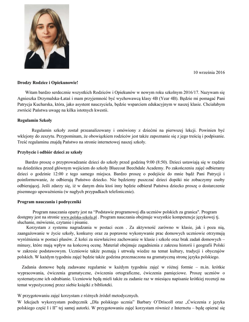 10 września 2016 Drodzy Rodzice i Opiekunowie! Witam bardzo serdecznie wszystkich Rodziców i Opiekunów w nowym roku szkolnym 2016/17. Nazywam się Agnieszka Drzymalska-Łataś i mam przyjemność być wychowawcą klasy 4B (Year 4B). Będzie mi pomagać Pani Patrycja Kucharska, która, jako asystent nauczyciela, będzie wsparciem edukacyjnym w naszej klasie. Chciałabym zwrócić Państwa uwagę na kilka istotnych kwestii. Regulamin Szkoły Regulamin szkoły został przeanalizowany i omówiony z dziećmi na pierwszej lekcji. Powinien być wklejony do zeszytu. Przypominam, że obowiązkiem rodziców jest także zapoznanie się z jego treścią i podpisanie. Treść regulaminu znajdą Państwo na stronie internetowej naszej szkoły. Przybycie i odbiór dzieci ze szkoły Bardzo proszę o przyprowadzanie dzieci do szkoły przed godziną 9:00 (8:50). Dzieci ustawiają się w rzędzie na dziedzińcu przed głównym wejściem do szkoły Bluecoat Beechdale Academy. Po zakończeniu zajęć odbieramy dzieci o godzinie 12:00 z tego samego miejsca. Bardzo proszę o podejście do mnie bądź Pani Patrycji i poinformowanie, że odbierają Państwo dziecko. Nie będziemy puszczać dzieci dopóki nie zobaczymy osoby odbierającej. Jeśli zdarzy się, iż w danym dniu ktoś inny będzie odbierał Państwa dziecko proszę o dostarczenie pisemnego upoważnienia (w nagłych przypadkach telefonicznie). Program nauczania i podręczniki Program nauczania oparty jest na “Podstawie programowej dla uczniów polskich za granica". Program dostępny jest na stronie www.polska-szkola.pl . Program nauczania obejmuje wszystkie kompetencje językowej tj. słuchanie, mówienie, czytanie i pisanie. Korzystam z systemu nagradzania w postaci ocen . Za aktywność zarówno w klasie, jak i poza nią, zaangażowanie w życie szkoły, konkursy oraz za poprawne wykonywanie prac domowych uczniowie otrzymują wyróżnienia w postaci plusów. Z kolei za niewłaściwe zachowanie w klasie i szkole oraz brak zadań domowych – minusy, które mają wpływ na końcową ocenę. Materiał obejmuje zagadnienia z zakresu historii i geografii Polski w zakresie podstawowym. Uczniowie także poznają i utrwalą wiedze na temat kultury, tradycji i obyczajów polskich. W każdym tygodniu zajęć będzie także godzina przeznaczona na gramatyczną stronę języka polskiego. Zadania domowe będą zadawane regularnie w każdym tygodniu zajęć w różnej formie – m.in. krótkie wypracowania, ćwiczenia gramatyczne, ćwiczenia ortograficzne, ćwiczenia pamięciowe. Proszę uczniów o systematyczne ich odrabianie. Uczniowie będą mieli także za zadanie raz w miesiącu napisanie krótkiej recenzji na temat wypożyczonej przez siebie książki z biblioteki. W przygotowaniu zajęć korzystam z różnych źródeł metodycznych. W lekcjach wykorzystam podręcznik „Dla polskiego ucznia” Barbary O’Driscoll oraz „Ćwiczenia z języka polskiego część I i II” tej samej autorki. W przygotowaniu zajęć korzystam również z Internetu – będę opierać się na różnorodnych materiałach edukacyjnych. W czasie zajęć uczniowie będą otrzymywać materiały ksero, zawierające teksty, ćwiczenia - ułatwiające naukę. Uczniowie zobowiązani są do przechowywania tych materiałów w teczkach. Plan lekcji, przerwy oraz sklepik Lekcje odbywają się zgodnie z planem zajęć, który dostępny jest na stronie internetowej szkoły. Proszę pomóc dzieciom spakować zeszyt oraz niezbędne przybory szkolne, a także dopilnować, aby nie przynosiły zabawek i telefonów komórkowych. Pierwszy zeszyt jest darmowy. Natomiast koszt każdego następnego to 50 pensów. Raz w miesiącu organizujemy zajęcia w bibliotece. Dzieci mogą wtedy wypożyczyć interesujące je książki. Należy dopilnować, aby zostały one zwrócone w wyznaczonym terminie. W czasie przerwy międzylekcyjnej funkcjonuje sklepik szkolny, gdzie można zakupić napoje, owoce czy słodycze. Wychodzimy również wtedy na zewnątrz. Bardzo proszę więc o zaopatrzenie dzieci w kurtki lub ciepłe bluzy! Jest to ważne ponieważ część z Państwa przywozi dzieci samochodem i zapomina o tym w chłodne dni. Zajęcia pozalekcyjne W godzinach 12:00-13:00 odbywać się będą różne formy zajęć pozalekcyjnych. Lista zajęć i szczegółowe informacje dostępne są na stronie internetowej szkoły. Proszę o zapoznanie się z nimi i zapisywanie dzieci na interesujące je fakultety. Zmiana adresu/danych Ze względów bezpieczeństwa wszelakie zmiany adresu, danych czy informacji medycznych dzieci prosimy jak najszybciej przekazywać pisemnie do sekretariatu szkoły. Benchmark Test Pod koniec roku odbędzie się egzamin – Benchmark Test. Jest to egzamin sprawdzający umiejętności pisania, czytania, słuchania i mówienia w języku polskim. Dlatego proszę o systematyczną pomoc dzieciom w nauce, przygotowaniu do lekcji i rzetelnym odrabianiu zadań domowych. Wszystkie informacje m.in. na temat: regulaminu szkoły, zajęć dodatkowych, oraz wszelkich bieżących wydarzeniach i aktualnościach znajdą Państwo na stronie internetowej szkoły: www.polishschoolnottingham.co.uk. Kontakt telefoniczny ze szkołą tel. 07960364303. Zachęcam również do zapoznania się z utworzonym portalem społecznościowym – Facebook w celach promocyjnych szkoły. Z chęcią odpowiem na nurtujące Państwa pytania, jak również wysłucham wszelkich uwag i sugestii. Jestem zawsze do dyspozycji po lekcjach podczas odbierania dzieci ze szkoły. Życzę udanego roku szkolnego. Z poważaniem, Agnieszka Drzymalska-Łataś