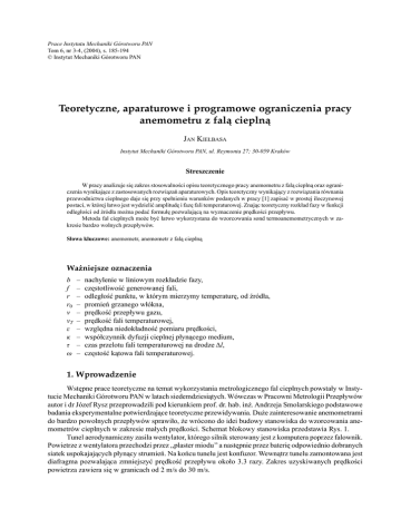 185 Prace Instytutu Mechaniki Górotworu PAN Tom 6, nr 3-4, (2004), s. 185-194 © Instytut Mechaniki Górotworu PAN Teoretyczne, aparaturowe i programowe ograniczenia pracy anemometru z falą cieplną JAN KIEŁBASA Instytut Mechaniki Górotworu PAN, ul. Reymonta 27; 30-059 Kraków Streszczenie W pracy analizuje się zakres stosowalności opisu teoretycznego pracy anemometru z falą cieplną oraz ograniczenia wynikające z zastosowanych rozwiązań aparaturowych. Opis teoretyczny wynikający z rozwiązania równania przewodnictwa cieplnego daje się przy spełnieniu warunków podanych w pracy [1] zapisać w prostej iloczynowej postaci, w której łatwo jest wydzielić amplitudę i fazę fali temperaturowej. Znając teoretyczny rozkład fazy w funkcji odległości od źródła można podać formułę pozwalającą na wyznaczenie prędkości przepływu. Metoda fal cieplnych może być łatwo wykorzystana do wzorcowania sond termoanemometrycznych w zakresie bardzo wolnych przepływów. Słowa kluczowe: anemometr, anemometr z falą cieplną Ważniejsze oznaczenia b f r r0 v vT ε κ τ ω – – – – – – – – – – nachylenie w liniowym rozkładzie fazy, częstotliwość generowanej fali, odległość punktu, w którym mierzymy temperaturę, od źródła, promień grzanego włókna, prędkość przepływu gazu, prędkość fali temperaturowej, względna niedokładność pomiaru prędkości, współczynnik dyfuzji cieplnej płynącego medium, czas przelotu fali temperaturowej na drodze Δl, częstość kątowa fali temperaturowej. 1. Wprowadzenie Wstępne prace teoretyczne na temat wykorzystania metrologicznego fal cieplnych powstały w Instytucie Mechaniki Górotworu PAN w latach siedemdziesiątych. Wówczas w Pracowni Metrologii Przepływów autor i dr Józef Rysz przeprowadzili pod kierunkiem prof. dr. hab. inż. Andrzeja Smolarskiego podstawowe badania eksperymentalne potwierdzające teoretyczne przewidywania. Duże zainteresowanie anemometrami do bardzo powolnych przepływów sprawiło, że wrócono do idei budowy stanowiska do wzorcowania anemometrów cieplnych w zakresie małych prędkości. Schemat blokowy stanowiska przedstawia Rys. 1. Tunel aerodynamiczny zasila wentylator, którego silnik sterowany jest z komputera poprzez falownik. Powietrze z wentylatora przechodzi przez ,,plaster miodu’’ a następnie przez baterię odpowiednio dobranych siatek uspokajających płynący strumień. Na końcu tunelu jest konfuzor. Wewnątrz tunelu zamontowana jest diafragma pozwalająca zmniejszyć prędkość przepływu około 3.3 razy. Zakres uzyskiwanych prędkości powietrza zawiera się w granicach od 2 m/s do 30 m/s. Jan Kiełbasa 186 dysza wylotowa siatki ulownica wentylator silnik v koordynatometr CCC2002 PC IBM 586 zasilacz stolika zasilacz wentylatora Klawiatura Rys. 1. Schemat blokowy stanowiska pomiarowego Z ramą tunelu powiązany jest sterowany komputerowo stolik koordynatometryczny pozwalający przesuwać zamontowaną na nim sondę termoanemometryczną w zakresie 80 mm na 150 mm z krokiem 0.001 mm. Sondy termoanemometryczne (do czterech sztuk) obsługuje czterokanałowy układ anemometryczny sterowany także poprzez komputer. Całość nadzoruje komputer IBM 584 z odpowiednim programem. 2. Zarys teorii pomiaru W teorii rozpatrywano propagacją zmiennego sygnału cieplnego generowanego przez nieskończenie długi drut, którego temperatura zmienia się sinusoidalnie, opływany przez prostopadły strumień o ustalonej prędkości (Rys. 2). Rys. 2. Liniowe źródło ciepła opływane przez medium Równanie opisujące takie zagadnienie ma postać [1]: Q T T 2T 2T v ( 2 v 2 ) 0 ( x) ( y ) exp(i t ) t x c x y (1) z warunkiem początkowym T ( x, y,0) 0 (2) Teoretyczne, aparaturowe i programowe ograniczenia pracy anemometru z falą cieplną 187 i brzegowym lim T ( x, y, t ) 0 r x2 y2 gdzie r (3) Rozwiązanie tego równania konstruuje się za pomocą funkcji Greena. Ma ono kształt: t T ( x, y; t ) q ( , , ) ( , ; x, y; ; t ) d d d (4) 0 Symbol ψ (...) oznacza tutaj funkcję Greena, która w zagadnieniu dwuwymiarowym wyraża się następująco: ( , ; x , y ; ; t ) 1 [ x v (t )]2 ( y )2 exp[ ]. 4 ( t ) 4 (t ) (5) Gdy wykorzysta się przy całkowaniu własności funkcji Diraca, że F ( z z ) dz F ( z ) 0 (6) 0 dostaje się t Q0 vx 1 r 2 v 2 T ( x, y ; t ) exp( i t ) exp[(i )]d 4c 2 4 4 0 (7) Zauważmy, że słuszna jest relacja T ( x, y ; t ) Q0 vx i t )[ ... d ... d ] exp( 4 c 2 t 0 Q0 vx i t )[T1 ( x, y ) T2 ( x, y ; t ] exp( 4 c 2 Q0 vx T ( x, y; t ) i t )T1 ( x, y )[1 2 ] exp( T1 ( x, y ) 4 c 2 (8) Ze wzoru (8) widzimy, że funkcja T1(x,y) nie zależy od czasu, a więc o rozkładzie temperatury T(x,y;t) będzie decydowała wartość funkcji T2(x,y;t). Wiadomo jednak, że T2 ( x, y; t ) t t t t r2 v 2 1 exp[(i )]d 4 4 r2 v 2 1 exp[(i )] d 4 4 r2 v 2 1 exp[(i )] exp[( )]d 4 4 r2 v 2 1 exp[( )]d 4 4 1 v 2 2 v t exp[ 4 ] d Ei( 4 ) t (9) v 2t ) 4 v 2t 4 exp( Jan Kiełbasa 188 Asymptotyczne zachowanie funkcji –Ei(–x) określa zależność [5]: 1 Ei ( x) e x [ x n 1 (1) n n! ]0 x n1 (10) Funkcja Ei(–x) jest stabelaryzowana. Rysunek 3 przedstawia graficznie jej przebieg w tym zakresie. 0.6 0.5 –Ei(–x) 0.4 0.3 0.2 0.1 0 0.5 2.5 4.5 6.5 8.5 x Rys. 3. Funkcja Ei(–x) Pamiętając, że x v 2t 4 (11) możemy wyznaczyć czas tmin jaki musi upłynąć od załączenia źródła Q(t) aby wpływ warunku początkowego był do zaniedbania. 3. Ograniczenia wynikające z teorii Z rozważań teoretycznych dotyczących propagacji fal cieplnych wynika, że: 1. Aby uformowała się fala cieplna musi upłynąć pewien czas od momentu załączenia źródła, który wynosi t 30 v2 (12) gdzie: κ – współczynnik dyfuzji cieplnej płynącego medium; v – prędkość medium. Wartość czasu wylicza się wg wzoru (12). Szacunkowo winno się odczekać ok. 10 okresów fali. 2. Jeżeli fala ma pokonać dystans l0, to też potrzebny jest na to czas. Zatem jeśliby rozpocząć pomiary natychmiast