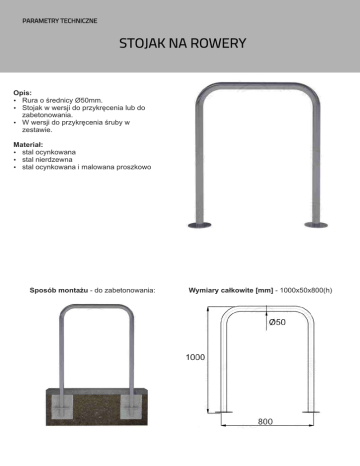 PARAMETRY TECHNICZNE STOJAK NA ROWERY Opis: ź Rura o średnicy Ø50mm. ź Stojak w wersji do przykręcenia lub do zabetonowania. ź W wersji do przykręcenia śruby w zestawie. Materiał: ź stal ocynkowana ź stal nierdzewna ź stal ocynkowana i malowana proszkowo Sposób montażu - do zabetonowania: Wymiary całkowite [mm] - 1000x50x800(h)