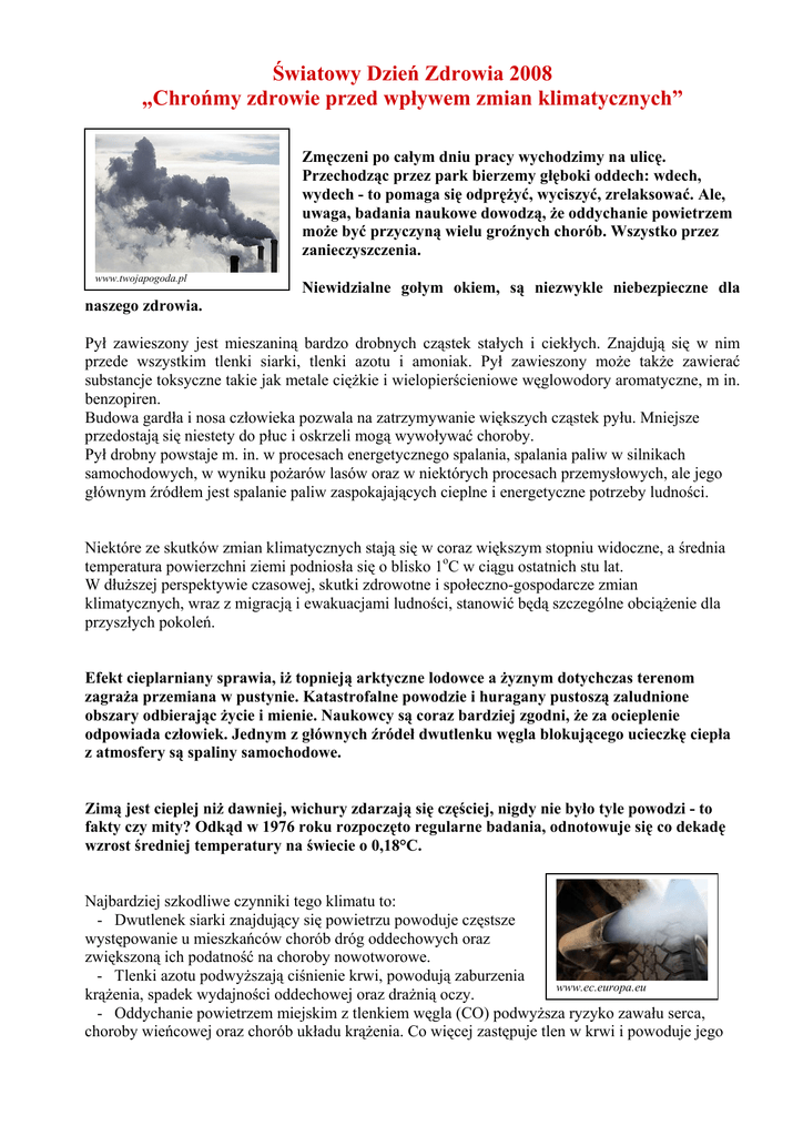 Światowy Dzień Zdrowia 2008 „Chrońmy zdrowie przed wpływem zmian klimatycznych” Zmęczeni po całym dniu pracy wychodzimy na ulicę. Przechodząc przez park bierzemy głęboki oddech: wdech, wydech - to pomaga się odprężyć, wyciszyć, zrelaksować. Ale, uwaga, badania naukowe dowodzą, że oddychanie powietrzem może być przyczyną wielu groźnych chorób. Wszystko przez zanieczyszczenia. www.twojapogoda.pl Niewidzialne gołym okiem, są niezwykle niebezpieczne dla naszego zdrowia. Pył zawieszony jest mieszaniną bardzo drobnych cząstek stałych i ciekłych. Znajdują się w nim przede wszystkim tlenki siarki, tlenki azotu i amoniak. Pył zawieszony może także zawierać substancje toksyczne takie jak metale ciężkie i wielopierścieniowe węglowodory aromatyczne, m in. benzopiren. Budowa gardła i nosa człowieka pozwala na zatrzymywanie większych cząstek pyłu. Mniejsze przedostają się niestety do płuc i oskrzeli mogą wywoływać choroby. Pył drobny powstaje m. in. w procesach energetycznego spalania, spalania paliw w silnikach samochodowych, w wyniku pożarów lasów oraz w niektórych procesach przemysłowych, ale jego głównym źródłem jest spalanie paliw zaspokajających cieplne i energetyczne potrzeby ludności. Niektóre ze skutków zmian klimatycznych stają się w coraz większym stopniu widoczne, a średnia temperatura powierzchni ziemi podniosła się o blisko 1oC w ciągu ostatnich stu lat. W dłuższej perspektywie czasowej, skutki zdrowotne i społeczno-gospodarcze zmian klimatycznych, wraz z migracją i ewakuacjami ludności, stanowić będą szczególne obciążenie dla przyszłych pokoleń. Efekt cieplarniany sprawia, iż topnieją arktyczne lodowce a żyznym dotychczas terenom zagraża przemiana w pustynie. Katastrofalne powodzie i huragany pustoszą zaludnione obszary odbierając życie i mienie. Naukowcy są coraz bardziej zgodni, że za ocieplenie odpowiada człowiek. Jednym z głównych źródeł dwutlenku węgla blokującego ucieczkę ciepła z atmosfery są spaliny samochodowe. Zimą jest cieplej niż dawniej, wichury zdarzają się częściej, nigdy nie było tyle powodzi - to fakty czy mity? Odkąd w 1976 roku rozpoczęto regularne badania, odnotowuje się co dekadę wzrost średniej temperatury na świecie o 0,18°C. Najbardziej szkodliwe czynniki tego klimatu to: - Dwutlenek siarki znajdujący się powietrzu powoduje częstsze występowanie u mieszkańców chorób dróg oddechowych oraz zwiększoną ich podatność na choroby nowotworowe. - Tlenki azotu podwyższają ciśnienie krwi, powodują zaburzenia www.ec.europa.eu krążenia, spadek wydajności oddechowej oraz drażnią oczy. - Oddychanie powietrzem miejskim z tlenkiem węgla (CO) podwyższa ryzyko zawału serca, choroby wieńcowej oraz chorób układu krążenia. Co więcej zastępuje tlen w krwi i powoduje jego niedobór co może prowadzić do uszkodzeń systemu nerwowego i mózgu, nawet do śmierci. - Kadm (Cd) kumuluje się w wątrobie, nerkach i kościach. Może powodować raka płuc i osteoporozę. Wzmaga także nadciśnienie tętnicze. - Kolejny metal ciężki, ołów (Pb) osadza się w kościach i wpływa na nerki oraz system nerwowy np. może powodować choroby umysłowe. Jest szkodliwy dla wątroby oraz osłabia oczy. - Fluor (F) jest potrzebny dla organizmu (np. kości, zęby), lecz w niewielkich ilościach. Zbyt wielkie dawki niszczą kości, nerki i płuca, mogą powodować raka płuc. - Ozon troposferyczny (O3) powodujący np. smog foto-chemiczny drażni oczy i system oddechowy, może nawet częściowo uszkodzić górne drogi oddechowe. Duże znaczenie dla organizmu człowieka ma także znaczne natężenie hałasu w mieście. Wprawdzie jego szkodliwość zależy ściśle od wielkości natężenia, częstotliwości i czasu działania, niemniej jednak mieszkańcy miast są szczególnie narażeni na www.ec.europa.eu częste bóle głowy, nudności oraz zaburzenia snu, zmniejsza się ich wydajność w pracy, możliwe są także częściowe uszkodzenia słuchu. Stałe przebywanie w hałasie o natężeniu 71-85 dB (decybeli) powoduje trwałe osłabienie słuchu (głuchotę). Hałas o natężeniu 86-130 dB powoduje zaburzenia funkcjonowania organizmu, zaś 130 dB to próg bólu fizycznego. Negatywnie na organizm człowieka wpływa również obecność nad miastem miejskiej wyspy ciepła. Odczuwalność cieplna człowieka kształtowana jest przez tzw. zespół bodźców termicznych, czyli temperaturę, wilgotność powietrza oraz jego ruch. Powodują one, iż człowiek ma obniżoną zdolność odczuwania i oceniania bodźców termicznych. W upalne letnie dni wiele osób w mieście ma odczucie przegrzania organizmu, wynikające nie tylko z wyższej temperatury powietrza wywołanej emisją ciepła sztucznego, przegrzaniem budynków i podłoża, ale dodatkowo duże znaczenie mają obniżone w centrum miasta prędkości wiatru. Powietrze ciepłe w mieście prawie nie przemieszcza się, co znacznie utrudnia chłodzenie organizmu. Dodatkowo latem występuje tzw. zjawisko parności, czyli duszności powietrza. Organizm ludzki ma duże zdolności do przystosowania się do danych warunków termicznych. Proces termoregulacji umożliwia, aby bilans cieplny pozostawał w równowadze. Gdy dochodzi do wzrostu temperatury w organizmie człowieka rozszerzają się naczynia krwionośne i zwiększa się skórny przepływ krwi, co ułatwia ochładzanie organizmu. Poza tym następuje wzmożone wydzielanie potu, przez co organizm człowieka traci dużo ciepła, które jest pochłaniane w procesie parowania kropelek potu. - - - - Pamiętajmy o segregacji odpadów, starajmy się ich wytwarzać mniej. Plastikowa torebka jednorazowego użycia, która dostajemy w supermarkecie, nie jest niezbędna. www.komax.pl Wyłączajmy światło. Nie tylko w łazience i w piwnicy. Jesteśmy przecież otoczeni różnokolorowymi diodami komputera, telewizora, radia włączonymi bez przerwy. Prawie 45% energii