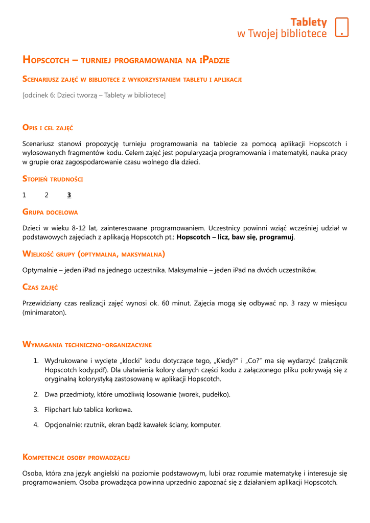 HOPSCOTCH – TURNIEJ PROGRAMOWANIA NA IPADZIE SCENARIUSZ ZAJĘĆ W BIBLIOTECE Z WYKORZYSTANIEM TABLETU I APLIKACJI [odcinek 6: Dzieci tworzą – Tablety w bibliotece] OPIS I CEL ZAJĘĆ Scenariusz stanowi propozycję turnieju programowania na tablecie za pomocą aplikacji Hopscotch i wylosowanych fragmentów kodu. Celem zajęć jest popularyzacja programowania i matematyki, nauka pracy w grupie oraz zagospodarowanie czasu wolnego dla dzieci. STOPIEŃ TRUDNOŚCI 1 2 3 GRUPA DOCELOWA Dzieci w wieku 8-12 lat, zainteresowane programowaniem. Uczestnicy powinni wziąć wcześniej udział w podstawowych zajęciach z aplikacją Hopscotch pt.: Hopscotch – licz, baw się, programuj. WIELKOŚĆ GRUPY (OPTYMALNA, MAKSYMALNA) Optymalnie – jeden iPad na jednego uczestnika. Maksymalnie – jeden iPad na dwóch uczestników. CZAS ZAJĘĆ Przewidziany czas realizacji zajęć wynosi ok. 60 minut. Zajęcia mogą się odbywać np. 3 razy w miesiącu (minimaraton). WYMAGANIA TECHNICZNO-ORGANIZACYJNE 1. Wydrukowane i wycięte „klocki” kodu dotyczące tego, „Kiedy?” i „Co?” ma się wydarzyć (załącznik Hopscotch kody.pdf). Dla ułatwienia kolory danych części kodu z załączonego pliku pokrywają się z oryginalną kolorystyką zastosowaną w aplikacji Hopscotch. 2. Dwa przedmioty, które umożliwią losowanie (worek, pudełko). 3. Flipchart lub tablica korkowa. 4. Opcjonalnie: rzutnik, ekran bądź kawałek ściany, komputer. KOMPETENCJE OSOBY PROWADZĄCEJ Osoba, która zna język angielski na poziomie podstawowym, lubi oraz rozumie matematykę i interesuje się programowaniem. Osoba prowadząca powinna uprzednio zapoznać się z działaniem aplikacji Hopscotch. PRZEBIEG ZAJĘĆ 1. Osoba prowadząca dzieli dzieci na grupy. 2. Każda grupa wybiera swojego bohatera w programie Hopscotch i ustawia go na środku ekranu. 3. Prowadzący ustawia dwa przedmioty, które umożliwią losowanie. W pierwszym znajdują się karteczki z fragmentami kodu typu „Kiedy?” (Załącznik, str. 1-2), w drugim z fragmentami kodu typu „Co?” (Załącznik, str. 3-6). 4. Wybrana osoba lub wszyscy po kolei losują: a) jedną karteczkę „Kiedy?” , b) trzy karteczki „Co?”. Uwaga, kolejność losowania jest ważna! Osoba prowadząca przypina wylosowane elementy do tablicy, aby wszyscy je widzieli. Jeśli wydruki są słabo widoczne, należy napisać polecenia na komputerze podłączonym do rzutnika i wyświetlić na ekranie. Następnie osoba prowadząca zajęcia tłumaczy zadanie (czyli zaprogramowanie wybranego bohatera tak, by wykonywał wylosowane polecenia), wyjaśnia wątpliwości. 5. Prowadzący sygnalizuje rozpoczęcie rudny i każda z grup stara się jak najszybciej wykonać zadanie. Grupa, która jako pierwsza ukończy zadanie, otrzymuje 3 pkt, druga – 2 pkt, a trzecia – 1pkt. 6. Podczas turnieju rozegrane będą trzy rundy, za każdym razem według tej samej procedury. Uwaga! Każda runda powinna trwać ok.10 minut. Jeśli pod koniec tego czasu niektóre grupy nie będą umiały sobie poradzić, należy im pomóc. 7. Wygrywa grupa z największą ilością punktów. Wyniki można zapisać na plakacie lub tablicy w bibliotece bądź zamieścić w Internecie. Jeśli turniej realizowany jest w cyklu (opcja minimaratonu), to na zakończenie ostatniego spotkania można zorganizować uroczyste ogłoszenie wyników. Zwycięzcy powinni zostać nagrodzeni, w zależności od możliwości biblioteki –nagrodą minimalną mogą być dyplomy. Sylwetki zwycięzców można zaprezentować na stronie biblioteki lub na jej profilu w mediach społecznościowych (np. Facebook). 8. Na zakończenie spotkania prowadzący może poinformować uczestników, że podczas turnieju została wykorzystana tylko niewielka cześć możliwości aplikacji Hopscotch. Można w ten sposób zachęcić uczestników do odwiedzania biblioteki, korzystania z niej i tworzenia interaktywnych scenek oraz gier. MOŻLIWE MODYFIKACJE ZAJĘĆ • Turniej można przeprowadzać w różnych grupach wiekowych lub w grupach międzypokoleniowych, a potem zorganizować „Wielki turniej”, w którym zmierzą się zwycięskie drużyny z każdej grupy wiekowej. • Biblioteki mogą wspólnie rozgrywać tego typu turnieje, łącząc się przez Skype. • Turniej może być wydarzeniem cyklicznym bądź przybrać formę jednorazowej akcji, np. jako część warsztatów matematycznych lub programistycznych. • Można przeprowadzić zajęcia bez przyznawania punktów, skupiając się bardziej na pracy w grupach i tłumaczeniu problematycznych zagadnień (zajęcia wprowadzające do minimaratonu). • Można zwiększyć ilość rund. W tym celu wystarczy dwukrotnie wydrukować gotowy zestaw lub dorobić dodatkowe karteczki z kodem, dodając więcej opcji. OCZEKIWANE REZULTATY ZAJĘĆ I SPOSOBY WERYFIKACJI Rezultatem turnieju będzie wzrost zainteresowania aplikacją Hopscotch i zajęciami z programowania wśród użytkowników biblioteki. Turniej stanowi również okazję do przygotowania uczestników do zajęć z programowania w aplikacji Cargo Bot. Poziom zadowolenia uczestników można zmierzyć, wykorzystując np. aplikację Happy Statistics. Projekt „Tablety w Twojej bibliotece” jest elementem Programu Rozwoju Bibliotek, który od 2009 roku realizuje Fundacja Rozwoju Społeczeństwa Informacyjnego. Ten materiał edukacyjny dostępny jest na licencji Creative Commons CC BY-SA 3.0 Polska. Pełna treść licencji znajduje się na stronie: http://creativecommons.org/licenses/by-sa/3.0/pl