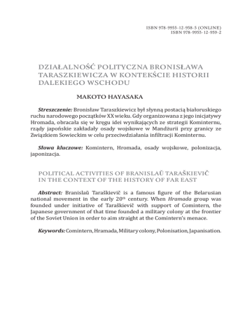 ISBN 978-9955-12-958-5 (ONLINE) ISBN 978-9955-12-959-2 DZIAŁALNOŚĆ POLITYCZNA BRONISŁAWA TARASZKIEWICZA W KONTEKŚCIE HISTORII DALEKIEGO WSCHODU MAKOTO HAYASAKA Streszczenie: Bronisław Taraszkiewicz był słynną postacią białoruskiego ruchu narodowego początków XX wieku. Gdy organizowana z jego inicjatywy Hromada, obracała się w kręgu idei wynikających ze strategii Kominternu, rządy japońskie zakładały osady wojskowe w Mandżurii przy granicy ze Związkiem Sowieckim w celu przeciwdziałania infiltracji Kominternu. Słowa kluczowe: Komintern, Hromada, osady wojskowe, polonizacja, japonizacja. POLITICAL ACTIVITIES OF BRANISLAŬ TARAŠKIEVIČ IN THE CONTEXT OF THE HISTORY OF FAR EAST Abstract: Branislaŭ Taraškievič is a famous figure of the Belarusian national movement in the early 20th century. When Hramada group was founded under initiative of Taraškievič with support of Comintern, the Japanese government of that time founded a military colony at the frontier of the Soviet Union in order to aim straight at the Comintern’s menace. Keywords: Comintern, Hramada, Military colony, Polonisation, Japanisation. Działalność polityczna Bronisława Taraszkiewicza w kontekście... Bronisław Taraszkiewicz (1892-1938) należy do panteonu bohaterów białoruskiego ruchu narodowego z początków XX wieku. Ten słynny językoznawca, pracujący we wczesnym okresie białoruskiego odrodzenia narodowego, należy do pokolenia “Naszej Niwy”, jest także typowym przykładem postaci pogranicza, rozdartej pomiędzy polskością a białoruskością. Zajęcie przez gen. przez Lucjana Żeligowskiego (1865-1947) Litwy Środkowej w 1920 roku, a następnie wcielenie jej do Polski ostatecznie zlikwidowało nadzieję miejscowych elit (krajowców) na odbudowę historycznej Litwy. Deklaracja wyrażająca koncepcję federalistyczną Józefa Piłsudskiego, ogłoszona 22 kwietnia 1919 roku w Wilnie, okazała się iluzją. Czytając opublikowaną w czasopiśmie „Przymierze” broszurę Taraszkiewicza pt. „Białoruskie postulaty polityczne” widać, że wyrażał on poglądy zbliżone do koncepcji głoszonych przez Polską Partię Socjalistyczną (PPS). Podkreślał potrzebę rozwiązania „kwestii białoruskiej” w ramach koncepcji federalistycznej, która przewidywała zjednoczenie małych państw utworzonych w wyniku pierwszej wojny światowej. Wówczas Taraszkiewicz był jeszcze daleki od idei bolszewickich. Co ciekawe, do czasów wyborów parlamentarnych w roku 1922 Taraszkiewicz nie był jeszcze przeciwnikiem Józefa Piłsudskiego i utrzymywał dobre stosunki z wybitnymi osobistościami z polskich kręgów politycznych, co było wynikiem znajomości zawartych podczas nauki w liceum w Wilnie i na Uniwersytecie Petersburskim. Czytając „Autobiografię” Taraszkiewicza, nie ulega wątpliwości, że był on postacią funkcjonującą na pograniczu białoruskości i polskości. Z jednej strony działał on w wolnomularstwie gromadzącym polską elitę w Warszawie, a także w Wilnie. Z drugiej strony jednocześnie zajmował się działalnością naukową i oświatową na rzecz ludności miejscowej. Z lektury „Autobiografii” mogłoby się wydawać, że w młodości jego życie płynęło zbyt daleko od polityki, odegrał on wybitną rolę w dziedzinie oświaty. Ułożył gramatykę języka białoruskiego dla szkół, był dyrektorem białoruskiego gimnazjum w Wilnie i założył Towarzystwo Szkoły Białoruskiej. Gdy wskutek traktatu ryskiego Białoruś została podzielona pomiędzy II Rzeczpospolitą i Rosję Radziecką podlegała ona odpowiednio stopniowej polonizacji czy sowietyzacji. Na zachodzie Białorusi polonizację przyśpieszyły dwa doniosłe w skutkach akty prawne – Ustawa językowa oraz Ustawa o parcelacji i osadnictwie. Na wschodzie, widząc rezultaty polityki białorusizacji realizowanej w okresie Nowej Polityki Ekonomicznej, wielu działaczy politycznych znalazło się w Mińsku. Stolica Białorusi Sowieckiej Mińsk stała się lokalnym “Piemontem”, gdzie rozkwitała kultura białoruska. Z tego też powodu działacze polityczni witali sowietyzację i akceptowali rządy komunistów, a między nimi był także Wacław Раздзел 2. Мадэрнізацыя, урбанізацыя і палітычныя пераўтварэнні: Беларусь у ХІХ–ХХ ст. 141 142 Makoto Hayasaka Łastowski. Na zachodniej Białorusi znajdującej się pod rządami Polskimi, walka narodowa rozgrywała się podczas wyborów z roku 1922. W ich rezultacie w Sejmie Rzeczypospolitej znalazło się 11 posłów i 3 senatorów białoruskich, wśród nich i Taraszkiewicz. Od momentu, gdy został posłem wpadł w wir działalności politycznej w Sejmie, w którym wówczas toczyły się gorące spory wokół dwóch dla Taraszkiewicza zasadniczych spraw – wspomnianej wyżej Ustawy językowej oraz Ustawy o parcelacji i osadnictwie. Lewicująca frakcja posłów zrzeszonych w Białoruskim Klubie Poselskim doprowadziła do rozłamu w jego szeregach i założyła organizację pod nazwą “Białoruska Włościańsko-Robotnicza Hromada”, nawiązującą do strategii Kominternu i włączyła się do międzynarodowego ruchu komunistycznego. Obserwując rozrost szeregów Hromady, kolejne rządy polskie zabiegające o polonizację terenów białoruskich, zastosowały wobec niej bezwzględne represje. Kierowana przez Taraszkiewicza Hromada ewoluowała coraz wyraźniej w kierunku lewicowym. Hromada nawiązywała w teorii do marksistowskiej idei sojuszu chłopów i robotników, ale w ówczesnej Białorusi nie było dostatecznej liczby tych ostatnich. W tej sytuacji Hromadę można uznać raczej za organizację chłopską, służącą interesom włościan. Dlatego też dla Kominternu Hromada była właściwym i naturalnym celem jej oddziaływania. Jej włościański charakter i zrzeszenie się w niej drobnych właścicieli ziemskich, był na początku działalności Hromady tolerowany prz