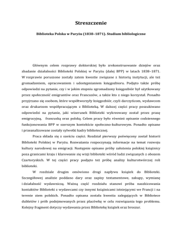 Streszczenie BibliotekaPolskawParyżu(1838–1871).Studiumbibliologiczne Głównym celem rozprawy doktorskiej było zrekonstruowanie dziejów oraz zbadanie działalności Biblioteki Polskiej w Paryżu (dalej BPP) w latach 1838–1871. Wrozprawie poruszone zostały zatem kwestie związane z historią instytucji, ale też gromadzeniem, opracowaniem i udostępnianiem księgozbioru. Podjęto także próbę odpowiedzinapytanie,czyiwjakimstopniuzgromadzonyksięgozbiórbyłużytkowany przezspołecznośćemigrantóworazFrancuzów,atakżektozniegokorzystał.Ponadto przyjrzanosięosobom,którewspółtworzyłyksięgozbiór,czylidarczyńcom,wydawcom oraz drukarzom współpracującym z Biblioteką. W dalszej części pracy poszukiwano odpowiedzi na pytanie, jaki wizerunek Biblioteki wykreowany został przez prasę emigracyjną, francuską oraz polską. Celem pracy było również opisanie codziennego funkcjonowania BPP w szerszym kontekście społeczno-kulturowym. Ponadto opisane iprzeanalizowanezostałysylwetkikadrybibliotecznej. Praca składa się z sześciu części. Rozdział pierwszy poświęcony został historii Biblioteki Polskiej w Paryżu. Rozważania rozpoczynają informacje na temat rozwoju kultury narodowej na emigracji. Następnie opisano próby założenia polskiej książnicy pozagranicamikrajuiklarowaniesięwizjibibliotekiwśródludzizwiązanychzobozem Czartoryskich. W tej części pracy podjęto też próbę analizy kulturotwórczej roli biblioteki. W rozdziale drugim omówiono drogi napływu książek do Biblioteki. Szczegółowej analizie poddano dary oraz zapisy testamentowe, zakupy, wymianę idziałalność wydawniczą. Ważną część rozdziału stanowi próba naszkicowania kontaktówBibliotekizwydawcamiczyinnymiksiążnicamiistniejącymiweFrancjiina terenie ziem polskich. Ponadto opisana została kwestia zalegających w Bibliotece dubletów i prób podejmowanych przez placówkę w celu rozwiązania tego problemu. KolejnyfragmentdotyczywydawaniaprzezBibliotekęksiążekorazbroszur. Wrozdzialetrzecimopisanokwestiezwiązanezopracowaniemzgromadzonych zbiorów. Odtworzenie ówczesnych metod organizacji księgozbioru stanowi trudne zadanie. Pozostaje wiele niewiadomych, jednak zachowane katalogi pozwoliły na podjęciepróbyodtworzeniasystematykstosowanychwprzypadkuzbiorów. RozdziałczwartydotyczycodziennegofunkcjonowaniaBibliotekiwXIX-wiecznej rzeczywistości. Omówiono w nim m.in. regulaminy określające sposób działania książnicy.Analiziepoddanorównieżsposóborganizacjiczytelniiwypożyczalni,atakże podjęto próbę zbadania, kto i z jaką częstotliwością korzystał z Biblioteki. W tej części omówionoteżproblemylokaloweikwestięzakupuwłasnejsiedziby,atakżefundusze BPP. W rozdziale piątym przedstawiono strukturę kadrową Biblioteki, a także losy ludzimającychnajwiększywpływnajejfunkcjonowanie.Analizasylwetekpracowników pozwoliła zbadać oczekiwania wobec kadry zatrudnianej w Bibliotece i potencjał naukowyWielkiejEmigracji. Celem rozdziału szóstego było przedstawienie wizerunku Biblioteki na łamach ówczesnej prasy. Analizie poddana została prasa emigracyjna zarówno dwóch obozów politycznych–arystokratycznegoidemokratycznego,jakitaukazującasięnaziemiach polskichorazwParyżu.Analizatreścigazetpozwalarównieżodpowiedziećnapytanie, czyBibliotekabyłaspołecznieakceptowanaorazwjakisposóbwypełniałaswojąmisję. KatarzynaSeroka Summary ThePolishLibraryinParis(1838–1871).Abibliologicalstudy The main objective of the doctoral dissertation was to reconstruct the history of the activityofthePolishLibraryinParis(hereinafter:PLP)intheyears1838–1871.Hence, the dissertation raised issues pertaining to the history of this institution, as well as collecting,handlingandsharingofthebookcollection.Moreover,anattemptwasmade to answer the question whether (and to what extent) the accumulated collection was utilised by the community of emigrants and the French, as well as by whom exactly. What is more, a focus was put on the individuals who co-created this collection, i.e., donors,publishersandprinterscooperatingwiththeLibrary.Further,ananswerwas soughttothequestionwhatwastheimageoftheLibrarycreatedbythepressinexile, theFrenchandthePolishpress.Theaimofthispaperwasalsotodescribetheday-todayfunctioningofthePLPinabroadersocialandculturalcontext.Moreover,profilesof thelibrarystaffweredescribedandanalysed. The paper comprises six parts. Chapter one is dedicated to the history of the PolishLibraryofParis.Considerationsbeginwiththeinformationonthedevelopment of national culture in exile, followed by a depiction of the efforts to found a Polish athenaeum outside the Polish borders and the clarification of the vision of the library among people related to the Czartoryski camp. In this part of the paper an attempt to analysetheculture-formingroleofthelibrarywasalsotaken. In chapter two the channels of books inflows into the Library were discussed. Donationsandlegacies,purchases,exchangesandpublishingactivitieswereanalysedin detail.Asignificantpartofthischapterismadebytheattempttooutlinethecontactsof the Library with publishers or other athenaeums existing in France and on the Polish land.Moreover,theissueofduplicateslingeringattheLibraryandeffortstakenbythe institution to solve this problem were depicted. Another fragment pertains to the publishingofbooksandbrochuresbytheLibrary. Inchapterthreeissuesrelatedtothearrangementofthecollectedlibrarystocks are described. Recreating the methods for organising the book collection exercised at that time constitutes a difficult task. There are many unknowns left, though the preserved catalogues allowed undertaking an attempt to recreate the systematics appliedinthecaseofbookscollections. Chapter four pertains to the daily functioning of the Library in the 19th-century reality. Here, among others, the regulations defining the way in which the athenaeum operatedarediscussed.Ananalysisinvolvingthemanneroforganisationofthereading 