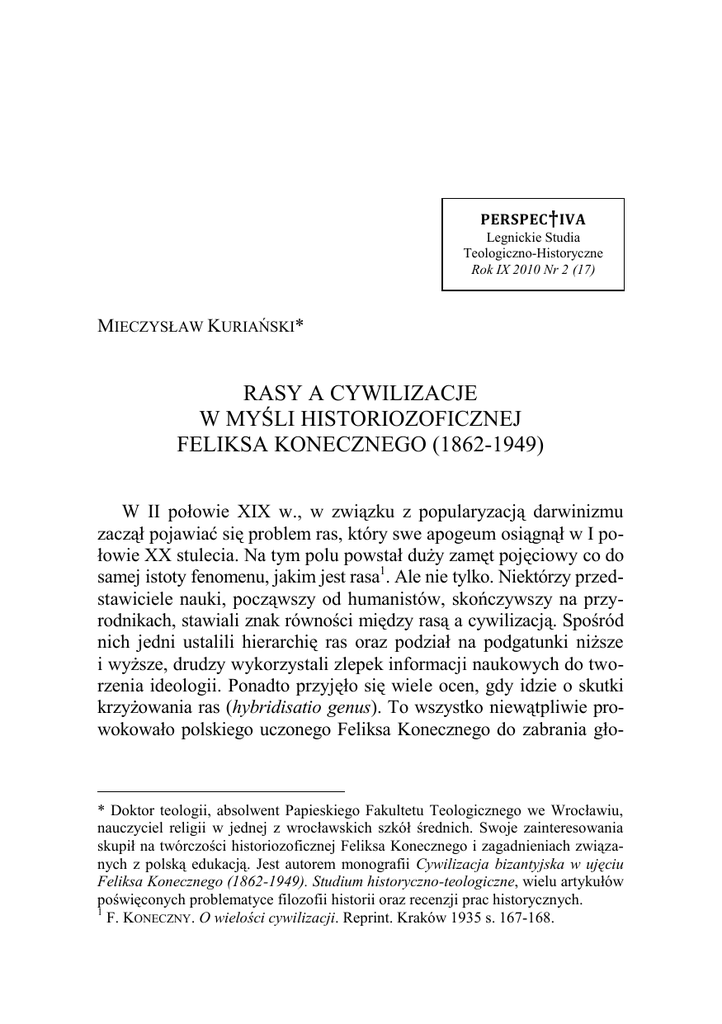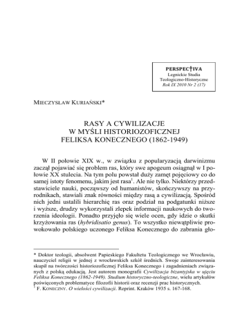 PERSPEC † IVA Legnickie Studia Teologiczno-Historyczne Rok IX 2010 Nr 2 (17) MIECZYSŁAW KURIAŃSKI* RASY A CYWILIZACJE W MYŚLI HISTORIOZOFICZNEJ FELIKSA KONECZNEGO (1862-1949) W II połowie XIX w., w związku z popularyzacją darwinizmu zaczął pojawiać się problem ras, który swe apogeum osiągnął w I połowie XX stulecia. Na tym polu powstał duży zamęt pojęciowy co do samej istoty fenomenu, jakim jest rasa1. Ale nie tylko. Niektórzy przedstawiciele nauki, począwszy od humanistów, skończywszy na przyrodnikach, stawiali znak równości między rasą a cywilizacją. Spośród nich jedni ustalili hierarchię ras oraz podział na podgatunki niższe i wyższe, drudzy wykorzystali zlepek informacji naukowych do tworzenia ideologii. Ponadto przyjęło się wiele ocen, gdy idzie o skutki krzyżowania ras (hybridisatio genus). To wszystko niewątpliwie prowokowało polskiego uczonego Feliksa Konecznego do zabrania gło- * Doktor teologii, absolwent Papieskiego Fakultetu Teologicznego we Wrocławiu, nauczyciel religii w jednej z wrocławskich szkół średnich. Swoje zainteresowania skupił na twórczości historiozoficznej Feliksa Konecznego i zagadnieniach związanych z polską edukacją. Jest autorem monografii Cywilizacja bizantyjska w ujęciu Feliksa Konecznego (1862-1949). Studium historyczno-teologiczne, wielu artykułów poświęconych problematyce filozofii historii oraz recenzji prac historycznych. 1 F. KONECZNY. O wielości cywilizacji. Reprint. Kraków 1935 s. 167-168. Rasy a cywilizacje w myśli historiozoficznej 77 su, celem wprowadzenia ładu mentalnego w tej dziedzinie, zwłaszcza że wrzawa wokół zagadnienia ras zataczała coraz szersze kręgi. W okresie międzywojennym (1918-1939) narastała eskalacja radykalizmu rasowego opartego na chwytliwych, a zarazem prymitywnych sloganach. Każda z ówczesnych doktryn zorientowana była na stworzenie własnej „naukowej” podbudowy. Nie brakowało więc konstrukcji apriorycznych, posiłkujących się pojęciami rasy2, klasy, języka itp. Najczęściej nie miały one nic wspólnego z rzeczywistością, gdyż zostały zrodzone przez bujną wyobraźnię. Wszakże człowiek oprócz realizmu może wybrać fantazję, zaś do dobranych faktów może dorobić odpowiednią interpretację i wykorzystać ją instrumentalnie do różnych celów. Do opinii publicznej przemówiło wielu nie tak uczonych co scientystycznych szarlatanów. W wyniku manipulacji kłamstwo urosło do rangi cnoty. Lud chętnie słuchał mów łechcących ucho. Kiedy już był rozgrzany do zenitu, przy dźwiękach werbli wiwatował bez końca. Wkrótce z wysiewu ziaren ras na podatną glebę wyrósł nazizm3. Wojna zebrała obfite żniwo w postaci eksterminacji milionów ludzi pochodzących ponoć z „niższych ras”. Wówczas nikt z wiwatujących nie przyjmował wywodów naukowych herolda łacińskiej cywilizacji, bo nie budziły one u nich entuzjazmu i słodkiej iluzji raju na ziemi. 1. FAŁSZYWE TEORIE RAS I ICH KONSEKWENCJE Wiele osób zajmowało się kwestią ras4. Ich dorobek odznaczał się zróżnicowaną wartością epistemologiczną. Nie sposób wymienić ich wszystkich. Wystarczy zaprezentować niektórych, wpisanych na trwałe w annały poruszanej dyscypliny. Przy okazji trzeba zwrócić uwagę na fakt, że ówczesna nauka pozostawała pod przemożnym wpływem biologizmu proweniencji darwinowskiej. Prawa przyrody próbowano zaaplikować do sfery ludzkiego ducha5. Dawało to nieraz kuriozalne 2 M. STEINERT. Hitler. Przeł. z j. niem. K. Skawina. Wrocław – Warszawa – Kraków 2001 s. 155-158. 3 Tamże. s. 388 n. 4 P. BEZAT. Teoria cywilizacji Feliksa Konecznego. Krzeszowice 2004 s. 33 5 F. KONECZNY. Prawa przyrody. Krzeszowice 2004 s. 10-11, 35. 78 MIECZYSŁAW KURIAŃSKI rezultaty. W badaniach nad rasami przewodziły Niemcy, choć i Francja wniosła swój znaczący wkład w tę dziedzinę wiedzy, zwłaszcza za pośrednictwem J.A. Gobineau (1818-1882), twórcy teorii rasizmu. Rudimenta filozoficzne doktryny o niejednolitości rodzaju ludzkiego wyszły spod pióra Ch. Monteskiusza (1689-1755)6 i J.G. Herdera (1744-1803)7, którzy propagowali ideę, iż ludzie różnią się między sobą kulturą, spowodowaną odmiennością tradycji, klimatu itp. (wymiar duchowy rasy). Z kolei filozof J.G. Fichte8 sformułował teorię o wyższości narodu niemieckiego nad wszystkimi pozostałymi nacjami świata, ponieważ wszystkie inne to zdegenerowane formy pierwotnego narodu niemieckiego (Urvolk). F. Bopp (1791-1867), J. Grimm (1785-1863) i M. Müller (18231900) stworzyli pojecie rasy „aryjskiej” lub „indoeuropejskiej”. Ich badania zostały wykorzystane do walki z nacjonalizmem jako ideologią demokratyczną, wyrażającą emancypację stanów i ras niższych 9. Według wspomnianego historyka i historiozofa, J.A. Gobineau10, hierarchia społeczna jawi się jako odbicie hierarchii rasowej, opartej na cechach intelektualnych i psychicznych (wymiar psychologicznosocjologiczny rasy). Charakter ludzki jest wrodzony. Ludy podzielił na dwie rasy psychologiczne: męską i żeńską. Do tej pierwszej zaliczył Germanów (inclusive Franków), którzy są twórcami wzniosłych idei i samej cywilizacji. Zanegował chrześcijański egalitaryzm, wypływający z dogmatu o stworzeniu człowieka na podobieństwo Boga, a także hasła rewolucji francuskiej: liberté, fraternité, égalité. Wolą Stwórcy jest nierówność ras i społeczeństw. Dla przykładu biblijny Adam reprezentuje rasę białą, zaś Cham czarną (notabene Pismo św. nie wspomina rasy żółtej). Rasy wyższe – stanowiące naturalną arystokrację, różnią się od ras niższych inteligencją oraz budową fizyczną: są piękniejsze, mają harmonijne rysy twarzy i większą czaszkę w stosunku do ras niższych. Przedstawiciele rasy męskiej winni rządzić 6 MONTESQIEU. Charles-Luis de Secondat. W: The Oxford Companion to Philosophy. New ed. by Ted Honderich. Oxford 2005 s. 619. 7 H. JAK