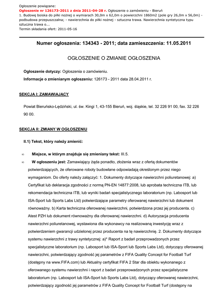 Ogłoszenie powiązane: Ogłoszenie nr 126173-2011 z dnia 2011-04-28 r. Ogłoszenie o zamówieniu - Bieruń 1. Budowę boiska do piłki nożnej o wymiarach 30,0m x 62,0m o powierzchni 1860m2 (pole gry 26,0m x 56,0m) podbudowa przepuszczalna; - nawierzchnia do piłki nożnej - sztuczna trawa. Nawierzchnia syntetyczna typu sztuczna trawa o... Termin składania ofert: 2011-05-16 Numer ogłoszenia: 134343 - 2011; data zamieszczenia: 11.05.2011 OGŁOSZENIE O ZMIANIE OGŁOSZENIA Ogłoszenie dotyczy: Ogłoszenia o zamówieniu. Informacje o zmienianym ogłoszeniu: 126173 - 2011 data 28.04.2011 r. SEKCJA I: ZAMAWIAJĄCY Powiat Bieruńsko-Lędziński, ul. św. Kingi 1, 43-155 Bieruń, woj. śląskie, tel. 32 226 91 00, fax. 32 226 90 00. SEKCJA II: ZMIANY W OGŁOSZENIU II.1) Tekst, który należy zmienić: • Miejsce, w którym znajduje się zmieniany tekst: III.5. • W ogłoszeniu jest: Zamawiający żąda ponadto, złożenia wraz z ofertą dokumentów potwierdzających, że oferowane roboty budowlane odpowiadają określonym przez niego wymaganiom. Do oferty należy załączyć: 1. Dokumenty dotyczące nawierzchni poliuretanowej: a) Certyfikat lub deklaracja zgodności z normą PN-EN 14877:2008, lub aprobata techniczna ITB, lub rekomendacja techniczna ITB, lub wyniki badań specjalistycznego laboratorium (np. Labosport lub ISA-Sport lub Sports Labs Ltd) potwierdzające parametry oferowanej nawierzchni lub dokument równoważny. b) Karta techniczna oferowanej nawierzchni, potwierdzona przez jej producenta. c) Atest PZH lub dokument równoważny dla oferowanej nawierzchni. d) Autoryzacja producenta nawierzchni poliuretanowej, wystawiona dla wykonawcy na realizowaną inwestycję wraz z potwierdzeniem gwarancji udzielonej przez producenta na tę nawierzchnię. 2. Dokumenty dotyczące systemu nawierzchni z trawy syntetycznej: a)* Raport z badań przeprowadzonych przez specjalistyczne laboratorium (np. Labosport lub ISA-Sport lub Sports Labs Ltd), dotyczący oferowanej nawierzchni, potwierdzający zgodność jej parametrów z FIFA Quality Concept for Football Turf (dostępny na www.FIFA.com) lub Aktualny certyfikat FIFA 2 Star dla obiektu wykonanego z oferowanego systemu nawierzchni i raport z badań przeprowadzonych przez specjalistyczne laboratorium (np. Labosport lub ISA-Sport lub Sports Labs Ltd), dotyczący oferowanej nawierzchni, potwierdzający zgodność jej parametrów z FIFA Quality Concept for Football Turf (dostępny na www.FIFA.com) b) Certyfikat lub deklaracja zgodności z normą PN-EN 15330-1:2008, lub aprobata techniczna ITB, lub rekomendacja techniczna ITB, lub wyniki badań specjalistycznego laboratorium (np. Labosport lub ISA-Sport lub Sports Labs Ltd) potwierdzające parametry oferowanej nawierzchni lub dokument równoważny. c) Karta techniczna oferowanej nawierzchni, potwierdzona przez jej producenta oraz jej próbkę o wymiarach 50 cm x 50 cm. d) Atest PZH lub równoważny dla oferowanej nawierzchni i wypełnienia. e)Autoryzacja producenta trawy syntetycznej, wystawiona dla wykonawcy na realizowaną inwestycję wraz z potwierdzeniem gwarancji udzielonej przez producenta na tę nawierzchnię.. • W ogłoszeniu powinno być: Zamawiający żąda ponadto, złożenia wraz z ofertą dokumentów potwierdzających, że oferowane roboty budowlane odpowiadają określonym przez niego wymaganiom. Do oferty należy załączyć: 1. Dokumenty dotyczące nawierzchni poliuretanowej: a) Certyfikat lub deklaracja zgodności z normą PN-EN 14877:2008, lub aprobata techniczna ITB, lub rekomendacja techniczna ITB, lub wyniki badań specjalistycznego laboratorium (np. Labosport lub ISA-Sport lub Sports Labs Ltd) potwierdzające parametry oferowanej nawierzchni lub dokument równoważny. b) Karta techniczna oferowanej nawierzchni, potwierdzona przez jej producenta. c) Atest PZH lub dokument równoważny dla oferowanej nawierzchni. d) Autoryzacja producenta nawierzchni poliuretanowej, wystawiona dla wykonawcy na realizowaną inwestycję wraz z potwierdzeniem gwarancji udzielonej przez producenta na tę nawierzchnię. 2. Dokumenty dotyczące systemu nawierzchni z trawy syntetycznej: a) Aktualny certyfikat FIFA 2 Star dla obiektu wykonanego z oferowanego systemu nawierzchni i raport z badań przeprowadzonych przez specjalistyczne laboratorium (np. Labosport lub ISA-Sport lub Sports Labs Ltd), dotyczący oferowanej nawierzchni, potwierdzający zgodność jej parametrów z FIFA Quality Concept for Football Turf (dostępny na www.FIFA.com) b) Certyfikat lub deklaracja zgodności z normą PN-EN 15330-1:2008, lub aprobata techniczna ITB, lub rekomendacja techniczna ITB, lub wyniki badań specjalistycznego laboratorium (np. Labosport lub ISA-Sport lub Sports Labs Ltd) potwierdzające parametry oferowanej nawierzchni lub dokument równoważny. c) Karta techniczna oferowanej nawierzchni, potwierdzona przez jej producenta oraz jej próbkę o wymiarach 50 cm x 50 cm. d) Atest PZH lub równoważny dla oferowanej nawierzchni i wypełnienia. e)Autoryzacja producenta trawy syntetycznej, wystawiona dla wykonawcy na realizowaną inwestycję wraz z potwierdzeniem gwarancji udzielonej przez producenta na tę nawierzchnię. /-/ Henryk Barcik Wicestarosta