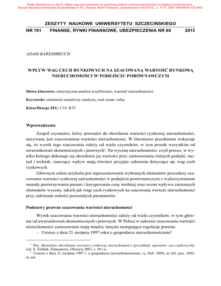 Źródło: Barembruch A.,(2013), Wpływ wag cech rynkowych na szacowaną wartość rynkową nieruchomości w podejściu porównawczym, , Zeszyty Naukowe Uniwersytetu Szczecińskiego nr 761, Finanse, Rynki Finansowe, Ubezpieczenia nr 60 (2013), , s. 11-21, ISSN 1640-6818;1733-2842. ZESZYTY NAUKOWE UNIWERSYTETU SZCZECIŃSKIEGO NR 761 FINANSE, RYNKI FINANSOWE, UBEZPIECZENIA NR 60 2013 ADAM BAREMBRUCH WPŁYW WAG CECH RYNKOWYCH NA SZACOWANĄ WARTOŚĆ RYNKOWĄ NIERUCHOMOŚCI W PODEJŚCIU PORÓWNAWCZYM Słowa kluczowe: statystyczna analiza wrażliwości, wartość nieruchomości Keywords: statistical sensitivity analysis, real estate value Klasyfikacja JEL: C15, R33 Wprowadzenie Zespół czynności, który prowadzi do określenia wartości rynkowej nieruchomości, nazywany jest szacowaniem wartości nieruchomości. W literaturze przedmiotu wskazuje się, że wynik tego szacowania zależy od wielu czynników, w tym przede wszystkim od uwarunkowań ekonomicznych i prawnych1. Na wycenę nieruchomości, czyli proces, w wyniku którego dokonuje się określenie jej wartości przy zastosowaniu różnych podejść, metod i technik, znaczący wpływ mają również przyjęte założenia dotyczące np. wag cech rynkowych. Głównym celem artykułu jest zaprezentowanie wybranych elementów procedury szacowania wartości rynkowej nieruchomości w podejściu porównawczym z wykorzystaniem metody porównywania parami i korygowania ceny średniej oraz ocena wpływu zmiennych elementów wyceny, takich jak wagi cech rynkowych na szacowaną wartość nieruchomości przy założeniu stałości pozostałych parametrów. Podstawy prawne szacowania wartości nieruchomości Wynik szacowania wartości nieruchomości zależy od wielu czynników, w tym głównie od uwarunkowań ekonomicznych i prawnych. W Polsce w zakresie szacowania wartości nieruchomości zastosowanie mają między innymi następujące regulacje prawne: – Ustawa z dnia 21 sierpnia 1997 roku o gospodarce nieruchomościami2. Por. Metodyka określania wartości rynkowej nieruchomości (przykłady operatów sza-cunkowych), red. S. Źróbek, Educaterra, Olsztyn 2007, s. 10 i n. 2 Ustawa z dnia 21 sierpnia 1997 r. o gospodarce nieruchomościami, t.j. DzU 2004, nr 261, poz. 2603, ze zm. 1 Źródło: Barembruch A.,(2013), Wpływ wag cech rynkowych na szacowaną wartość rynkową nieruchomości w podejściu porównawczym, , Zeszyty Naukowe Uniwersytetu Szczecińskiego nr 761, Finanse, Rynki Finansowe, Ubezpieczenia nr 60 (2013), , s. 11-21, ISSN 1640-6818;1733-2842. 12 Adam Barembruch – Rozporządzenie Rady Ministrów z dnia 21 września 2004 roku w sprawie wyceny nieruchomości i sporządzania operatu szacunkowego3. – Przepisy zawarte w standardach zawodowych rzeczoznawców majątkowych (wynika to z art. 175 ust. 1 i 6 ustawy o gospodarce nieruchomościami)4. Podejście porównawcze – metoda porównywania parami oraz korygowania ceny średniej W ustawie z dnia 21 sierpnia 1997 roku o gospodarce nieruchomościami w zdefiniowano cztery podejścia szacowania wartości nieruchomości: porównawcze, dochodowe, kosztowe i mieszane5. W kontekście sformułowanego na wstępie celu istotne jest wyjaśnienie podejścia porównawczego. Polega ono na określeniu wartości nieruchomości przy założeniu, że wartość ta odpowiada cenom, jakie uzyskano za nieruchomości podobne, które były przedmiotem obrotu rynkowego. Ceny te koryguje się ze względu na cechy różniące nieruchomości podobne od nieruchomości wycenianej oraz uwzględnia się zmiany poziomu cen wskutek upływu czasu. W ramach podejścia porównawczego wyróżnia się metodę porównywania parami, korygowania ceny średniej oraz statystycznej analizy rynku6. W oparciu o metodę porównywania parami porównuje się nieruchomość będącą przedmiotem wyceny, której cechy są znane, kolejno z nieruchomościami podobnymi, które były przedmiotem obrotu rynkowego i dla których znane są ceny transakcyjne, warunki zawarcia transakcji oraz cechy tych nieruchomości7. W przypadku metody korygowania ceny średniej do porównań przyjmuje się z rynku właściwego ze względu na położenie wycenianej nieruchomości co najmniej kilkanaście nieruchomości podobnych, które były przedmiotem obrotu rynkowego i dla których znane są ceny transakcyjne, warunki zawarcia transakcji oraz cechy tych nieruchomości. Wartość nieruchomości będącej przedmiotem wyceny określa się w drodze korekty średniej ceny nieruchomości podobnych współczynnikami korygującymi, uwzględniającymi różnice w poszczególnych cechach tych nieruchomości8. Rozporządzenie Rady Ministrów z dnia 21 września 2004 r. w sprawie wyceny nieruchomości i sporządzania operatu szacunkowego, DzU nr 207, poz. 2109, ze zm. 4 Powszechne Krajowe Zasady Wyceny (PKZW), http://pfsrm.pl/ (15.12.2012). 5 Dział IV: wycena nieruchomości; rozdział 1: określanie wartości nieruchomości, ustawy z dnia 21 sierpnia 1997 r. o gospodarce nieruchomościami. O innych modelach szacowania wartości nieruchomości: A. Zakręt: Przegląd wybranych modeli szacowania wartości nieruchomości, [w:] Inwestycje i nieruchomości. Wyzwania XXI wieku, red. A. Nalepka, Uniwersytet Ekonomiczny w Krakowie, Kraków 2011, s. 399–407. 6 Szacowanie nieruchomości, red. J. Dydenko, Warszawa 2006, s. 288 i n. 7 Por. R. Cymernam, A. Hopfer: Wycena nieruchomości. Zasady i procedury, Warszawa 2005, s. 20 i n. 8 (§ 4.4) Rozporządzenia Rady Ministrów z dnia 21 września 2004 r. w sprawie wyceny nieruchomości i sporządzania operatu szacunkowego, DzU z dnia 22 września 2004 r.; D. Trojanowski: Wycena nieruchomości, [w:] Inwestycje i nieruchomości. Elementy teorii i praktyki, red. M. Rymarzak, FRUG, 2009, s. 131 i n. 3 Źródło: Barembruch A.,(2013), Wpływ wag cech rynkowych na szacowaną wartość rynkową nieruchomości w podejściu porównawczym, , Zeszyty Naukowe Uniwersytetu Szczecińskiego nr 761, Finanse, Rynki Finansowe, Ubezpieczenia nr 60