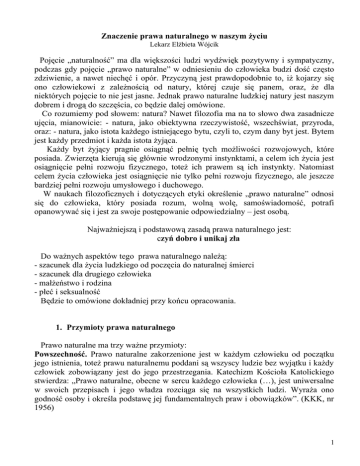 Znaczenie prawa naturalnego w naszym życiu Lekarz Elżbieta Wójcik Pojęcie „naturalność” ma dla większości ludzi wydźwięk pozytywny i sympatyczny, podczas gdy pojęcie „prawo naturalne” w odniesieniu do człowieka budzi dość często zdziwienie, a nawet niechęć i opór. Przyczyną jest prawdopodobnie to, iż kojarzy się ono człowiekowi z zależnością od natury, której czuje się panem, oraz, że dla niektórych pojęcie to nie jest jasne. Jednak prawo naturalne ludzkiej natury jest naszym dobrem i drogą do szczęścia, co będzie dalej omówione. Co rozumiemy pod słowem: natura? Nawet filozofia ma na to słowo dwa zasadnicze ujęcia, mianowicie: - natura, jako obiektywna rzeczywistość, wszechświat, przyroda, oraz: - natura, jako istota każdego istniejącego bytu, czyli to, czym dany byt jest. Bytem jest każdy przedmiot i każda istota żyjąca. Każdy byt żyjący pragnie osiągnąć pełnię tych możliwości rozwojowych, które posiada. Zwierzęta kierują się głównie wrodzonymi instynktami, a celem ich życia jest osiągnięcie pełni rozwoju fizycznego, toteż ich prawem są ich instynkty. Natomiast celem życia człowieka jest osiągnięcie nie tylko pełni rozwoju fizycznego, ale jeszcze bardziej pełni rozwoju umysłowego i duchowego. W naukach filozoficznych i dotyczących etyki określenie „prawo naturalne” odnosi się do człowieka, który posiada rozum, wolną wolę, samoświadomość, potrafi opanowywać się i jest za swoje postępowanie odpowiedzialny – jest osobą. Najważniejszą i podstawową zasadą prawa naturalnego jest: czyń dobro i unikaj zła Do ważnych aspektów tego prawa naturalnego należą: - szacunek dla życia ludzkiego od poczęcia do naturalnej śmierci - szacunek dla drugiego człowieka - małżeństwo i rodzina - płeć i seksualność Będzie to omówione dokładniej przy końcu opracowania. 1. Przymioty prawa naturalnego Prawo naturalne ma trzy ważne przymioty: Powszechność. Prawo naturalne zakorzenione jest w każdym człowieku od początku jego istnienia, toteż prawu naturalnemu poddani są wszyscy ludzie bez wyjątku i każdy człowiek zobowiązany jest do jego przestrzegania. Katechizm Kościoła Katolickiego stwierdza: „Prawo naturalne, obecne w sercu każdego człowieka (…), jest uniwersalne w swoich przepisach i jego władza rozciąga się na wszystkich ludzi. Wyraża ono godność osoby i określa podstawę jej fundamentalnych praw i obowiązków”. (KKK, nr 1956) 1 Niezmienność. Cecha ta bywa coraz częściej kwestionowana w związku z historycznością i różnorodnością kultur. Jednak, jak to podkreślał Ojciec św. Jan Paweł II, - „w naturze człowieka istnieje coś, co przekracza kultury i staje się jego właściwą miarą i warunkiem jego godności”. Katechizm Kościoła Katolickiego mówi: „Prawo naturalne jako takie jest niezmienne i trwałe pośród zmian historycznych; istnieje wśród zmieniających się poglądów i obyczajów oraz wspiera ich postęp. Nie można go zniszczyć ani wyrwać z serca człowieka”. Poznawalność. Rozum ludzki zdolny jest rozpoznać i zrozumieć prawo naturalne, czyli prawa swojej natury, ponieważ człowiek potrafi zastanawiać się nad sobą samym i wnikać w swoją osobowość. Prawa te powinny być uwzględniane i stosowane przez wszystkich ludzi, zwłaszcza, że podstawową zasadą prawa naturalnego jest – jak wyżej powiedziano: „czynić dobro i unikać zła”. Św. Paweł pisze w Liście do Rzymian: „Bo gdy poganie, którzy prawa nie mają, idąc za naturą czynią to, co Prawo nakazuje – chociaż Prawa nie mają – sami dla siebie są Prawem. Wykazują oni, że treść Prawa wypisana jest w ich sercach, gdy jednocześnie ich sumienie staje jako świadek, a mianowicie ich myśli na przemian ich oskarżające lub uniewinniające” (Rz 2, 14-15). Ze słów tych wynika, że wszystkich ludzi trzeba uważać za zdolnych do życia moralnego zgodnego z sumieniem, także nie znających Objawienia Bożego, czyli, że jest to prawda ogólnoludzka. Istnieje również prawo stanowione, uchwalane przez rządy społeczeństw. Prawo stanowione dotyczy życia w społeczeństwie, określa np. zasady ruchu drogowego, organizację szkolnictwa, urzędów, wysokość podatków, karalność za przestępstwa i wiele innych spraw. Natomiast prawo naturalne pozostaje poza gestią państwa, to znaczy, że państwo nie może ograniczać ani zmieniać naturalnych praw człowieka. Ojciec św. Jan Paweł II – być może największy w XX. wieku obrońca prawa naturalnego i wynikających zeń praw człowieka – zwrócił się do członków Kongregacji Nauki Wiary w Watykanie w roku 2004 następująco: „Kolejnym ważnym i aktualnym zagadnieniem, na które chciałbym zwrócić waszą uwagę, jest moralne prawo naturalne. (…) Na fundamentach tego prawa można stworzyć platformę wspólnych wartości, na podstawie których można rozwijać konstruktywny dialog z wszystkimi ludźmi dobrej woli, a szerzej ze społeczeństwem świeckim (…); zachęcam was zatem do podjęcia stosownych inicjatyw, które przyczynią się do konstruktywnej odnowy nauczania na temat moralnego prawa naturalnego oraz do szukania zbieżności poglądów z przedstawicielami innych wyznań, religii i kultur”. (06. 02. 2004). W tekście tym warto zwrócić uwagę na wyrażenie Ojca św. Jana Pawła II, że prawo naturalne jest podstawą wspólnych wartości. W encyklice „Veritatis splendor” Papież napisał: „Ponieważ (…) prawo naturalne wyraża godność ludzkiej osoby i kładzie podwaliny jej fundamentalnych praw i obowiązków, jego nakazy mają znaczenie uniwersalne, jest ono zatem wiążące dla wszystkich ludzi” (Jan Paweł II, enc. Veritatis splendor, 51). 2 Również Ojciec św. Benedykt XVI wypowiada się na temat prawa naturalnego, np.: „Człowiek jest podmiotem praw jeszcze przed ustanowieniem jakiejkolwiek konstytucji. Wszystkie prawa stanowione powin