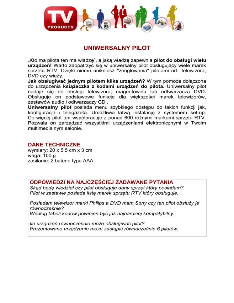 UNIWERSALNY PILOT „Kto ma pilota ten ma władzę”, a jaką władzę zapewnia pilot do obsługi wielu urządzeń! Warto zaopatrzyć się w uniwersalny pilot obsługujący wiele marek sprzętu RTV. Dzięki niemu unikniesz "żonglowania" pilotami od telewizora, DVD czy wieży. Jak obsługiwać jednym pilotem kilka urządzeń? W tym pomoże dołączona do urządzenia książeczka z kodami urządzeń do pilota. Uniwersalny pilot nadaje się do obsługi telewizora, magnetowidu lub odtwarzacza DVD. Obsługuje on podstawowe funkcje dla większości marek telewizorów, zestawów audio i odtwarzaczy CD . Uniwersalny pilot posiada menu szybkiego dostępu do takich funkcji jak, konfiguracja i telegazeta. Umożliwia łatwą instalację z systemem set-up. Co więcej pilot ten współpracuje z ponad 600 różnymi markami sprzętu RTV. Pozwala on zarządzać wszystkimi urządzeniami elektronicznymi w Twoim multimedialnym salonie. DANE TECHNICZNE wymiary: 20 x 5,5 cm x 3 cm waga: 100 g zasilanie: 2 baterie typu AAA ODPOWIEDZI NA NAJCZĘŚCIEJ ZADAWANE PYTANIA Skąd będę wiedział czy pilot obsługuje dany sprzęt który posiadam? Pilot w zestawie posiada listę marek sprzętu RTV który obsługuje. Posiadam telewizor marki Philips a DVD mam Sony czy ten pilot obsłuży je równocześnie? Według tabeli kodów powinien być jak najbardziej kompatybilny. Ile urządzeń równocześnie może obsługiwać pilot? Prezentowane urządzenie może zastąpić równocześnie 6 pilotów.